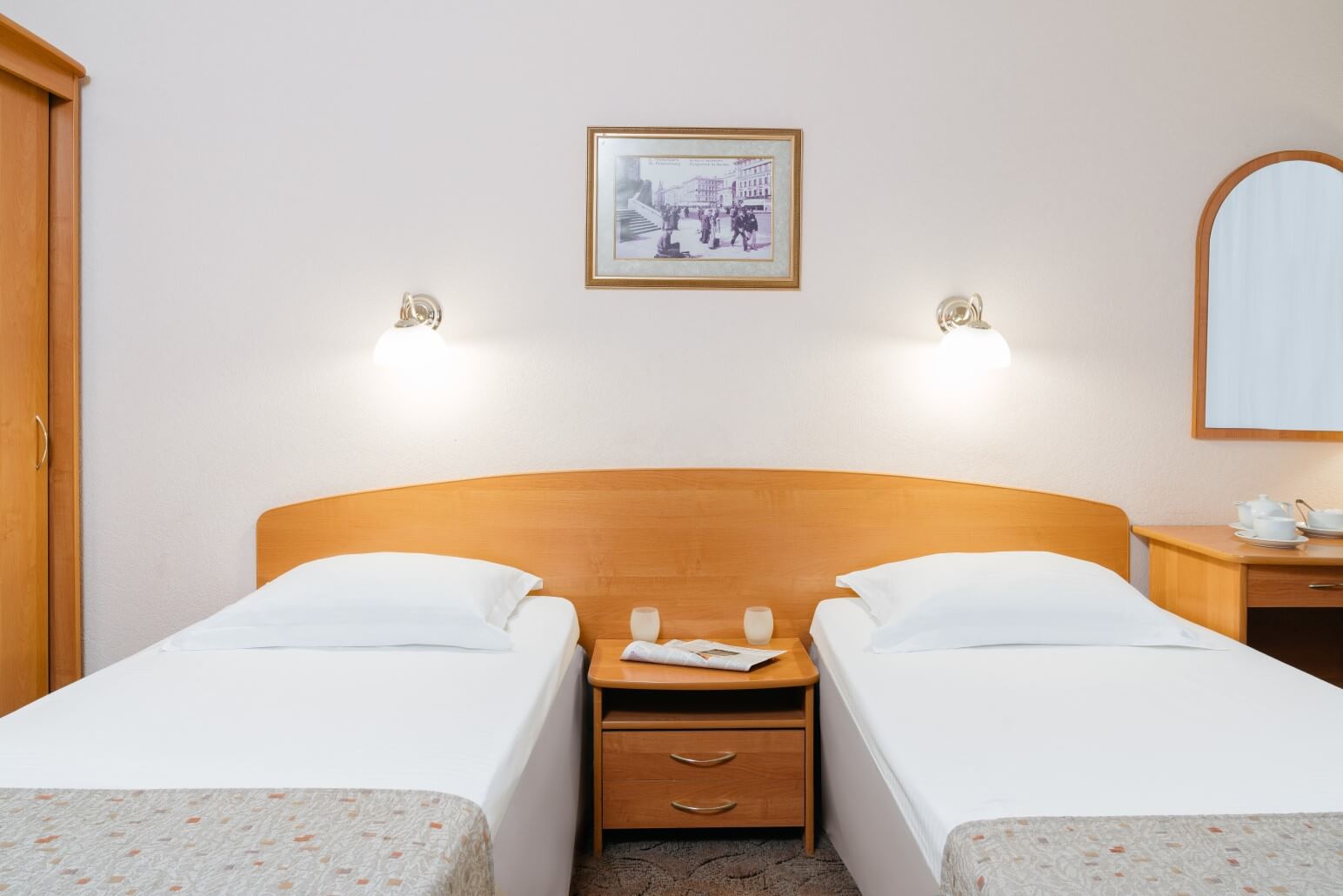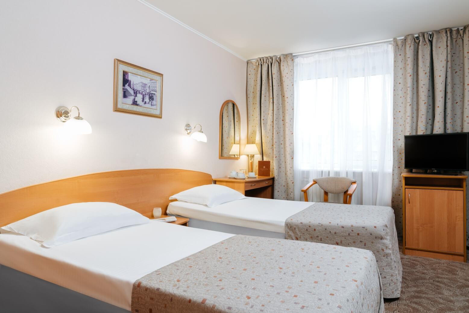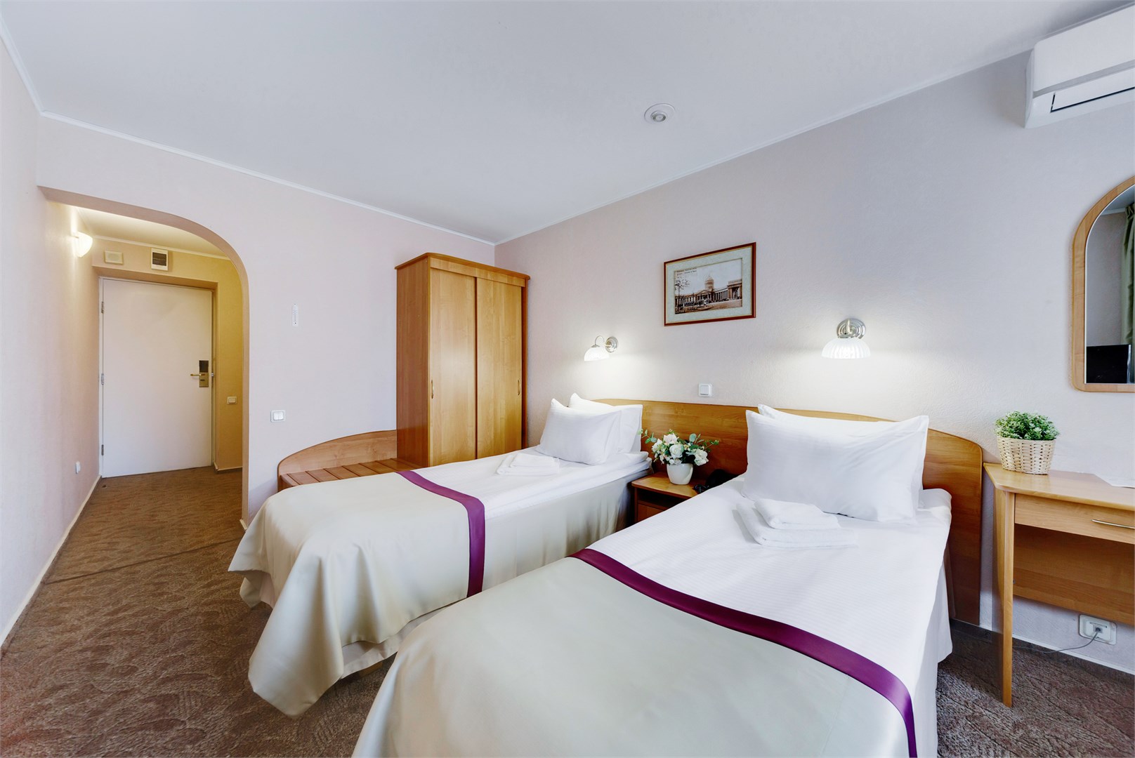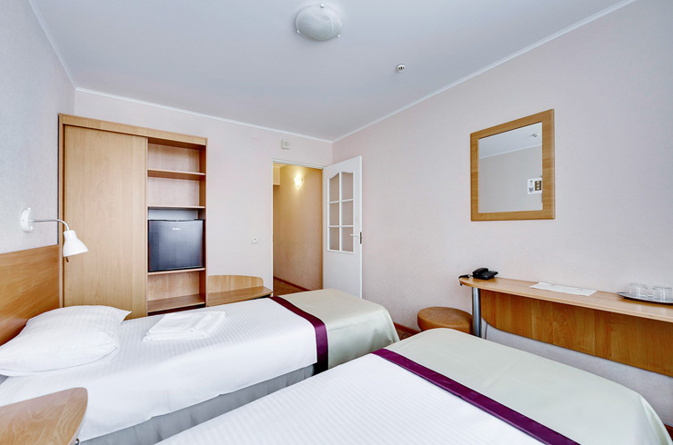 В номере: кровати односпальные, прикроватные тумбочки, стол, стул, шкаф, телевизор, холодильник