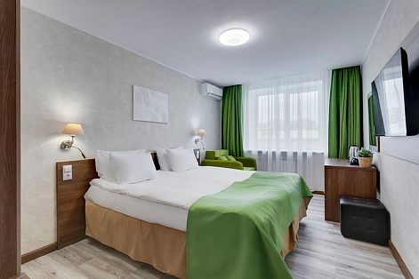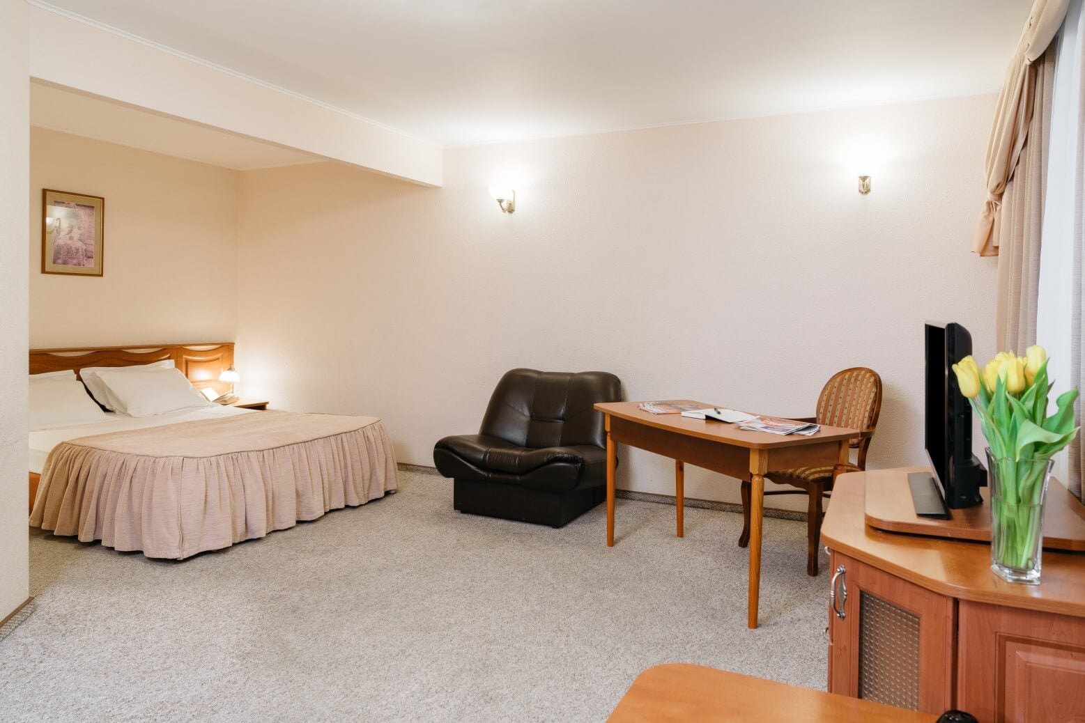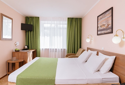 В номере: кресла, кровать двуспальная, стол, стулья, кондиционер, телевизор, телефон, холодильник, чайный набор посуды, электрочайник