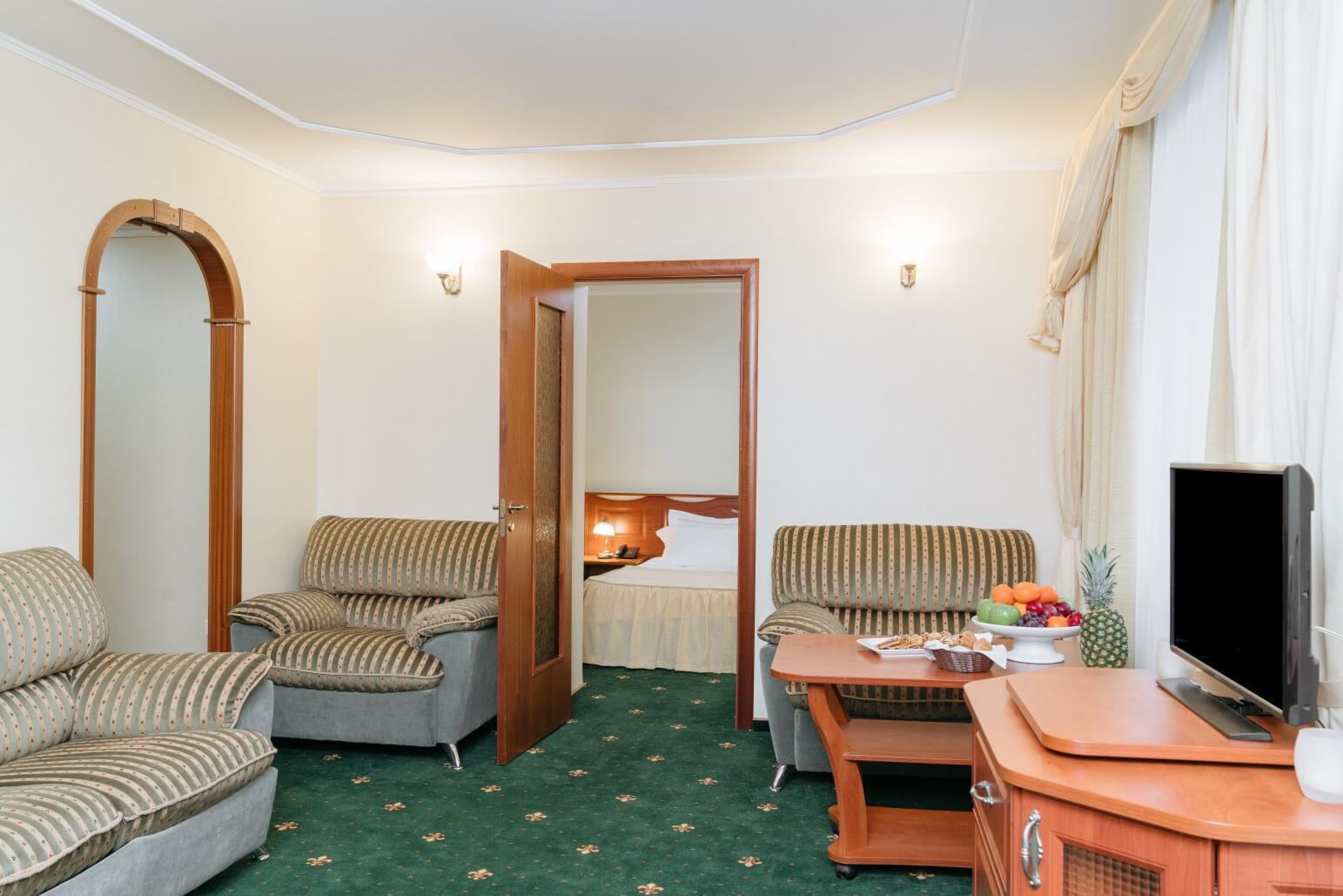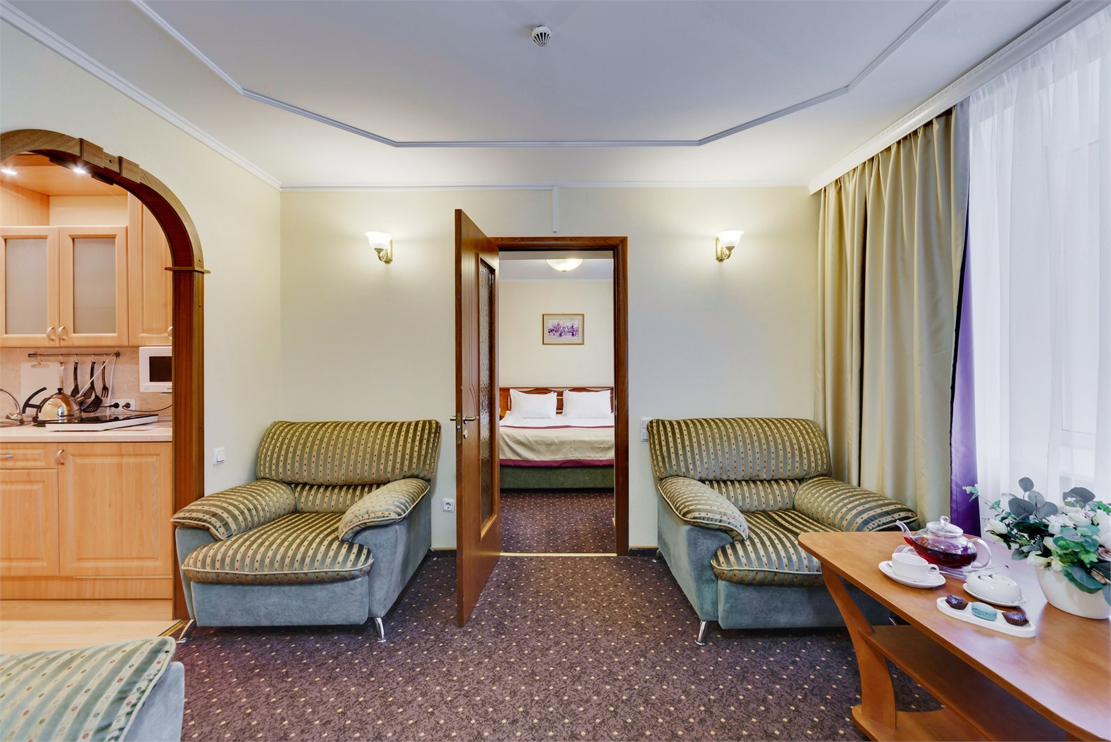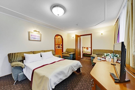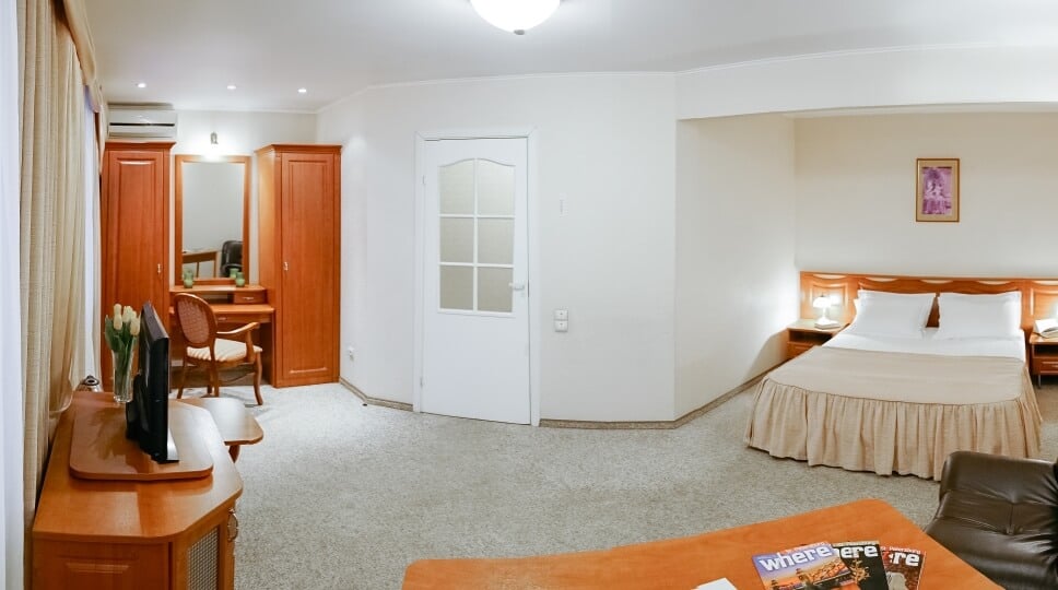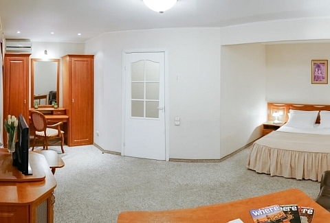 В номере: диван, кресла, кровать двуспальная, прикроватные тумбочки, стол, стулья, шкаф, кондиционер, микроволновая печь, телевизор, телефон, холодильник, чайный набор посуды, электрочайник