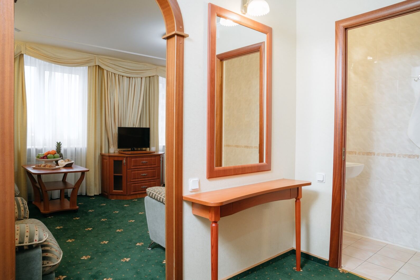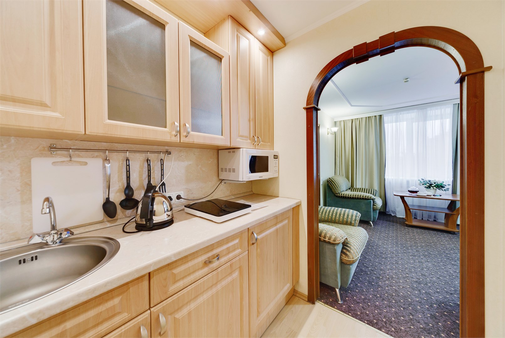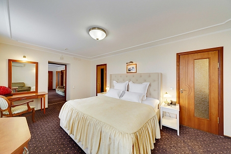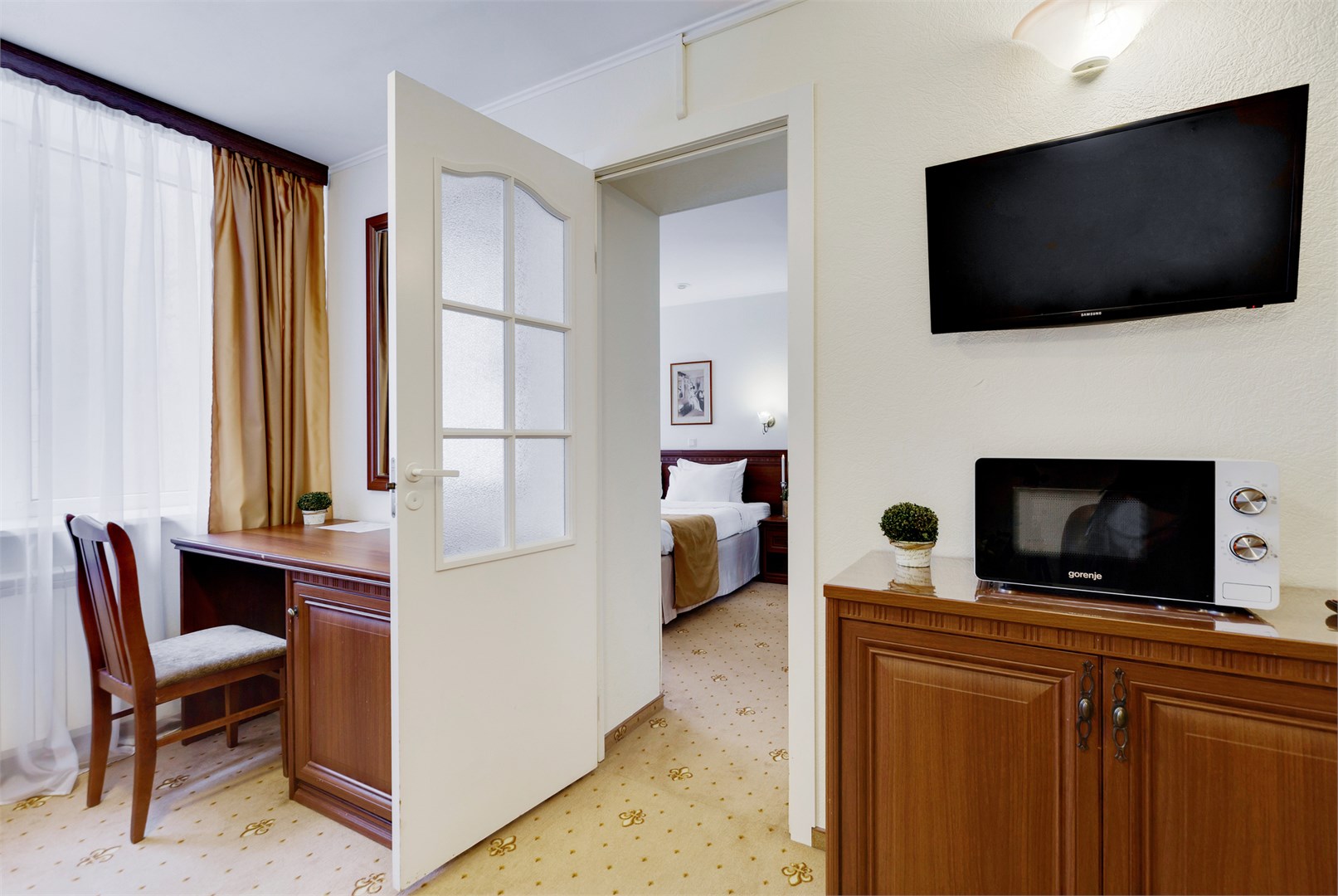 В номере: диван, кресла, кровать двуспальная, прикроватные тумбочки, стол, стулья, шкаф, кондиционер, микроволновая печь, телевизор, телефон, холодильник, чайный набор посуды, электрочайник