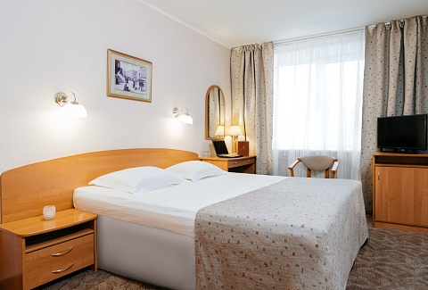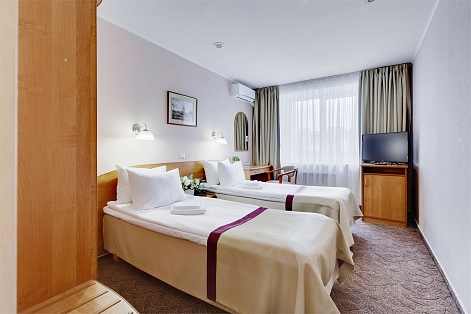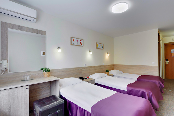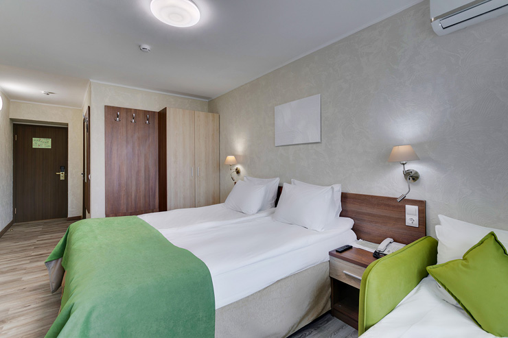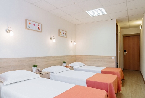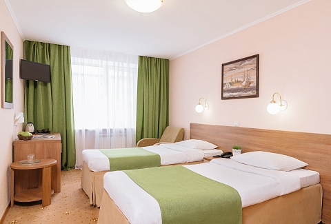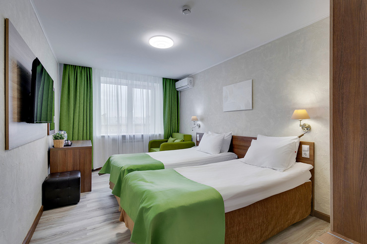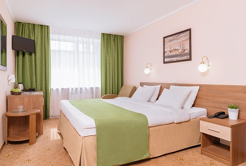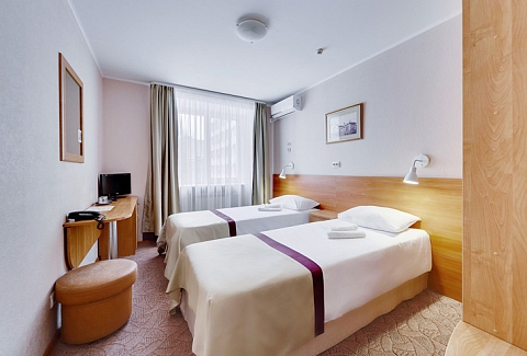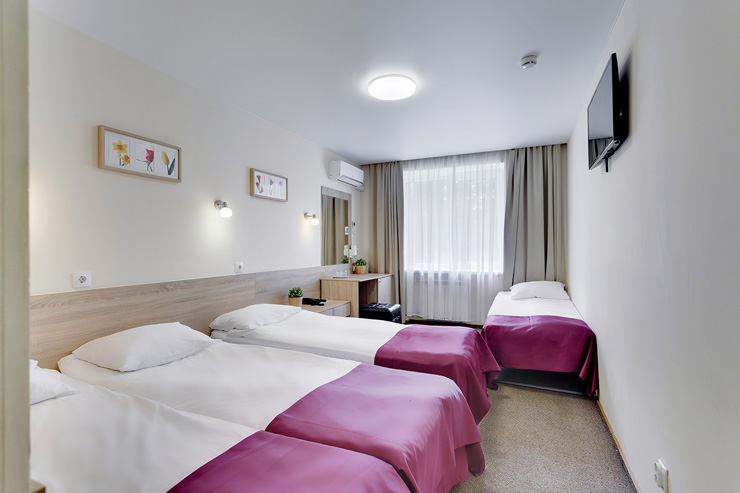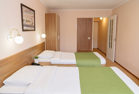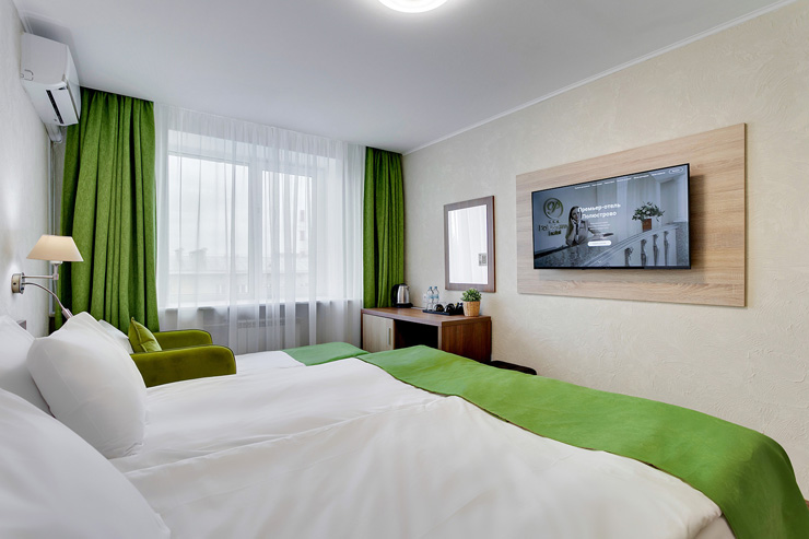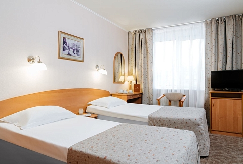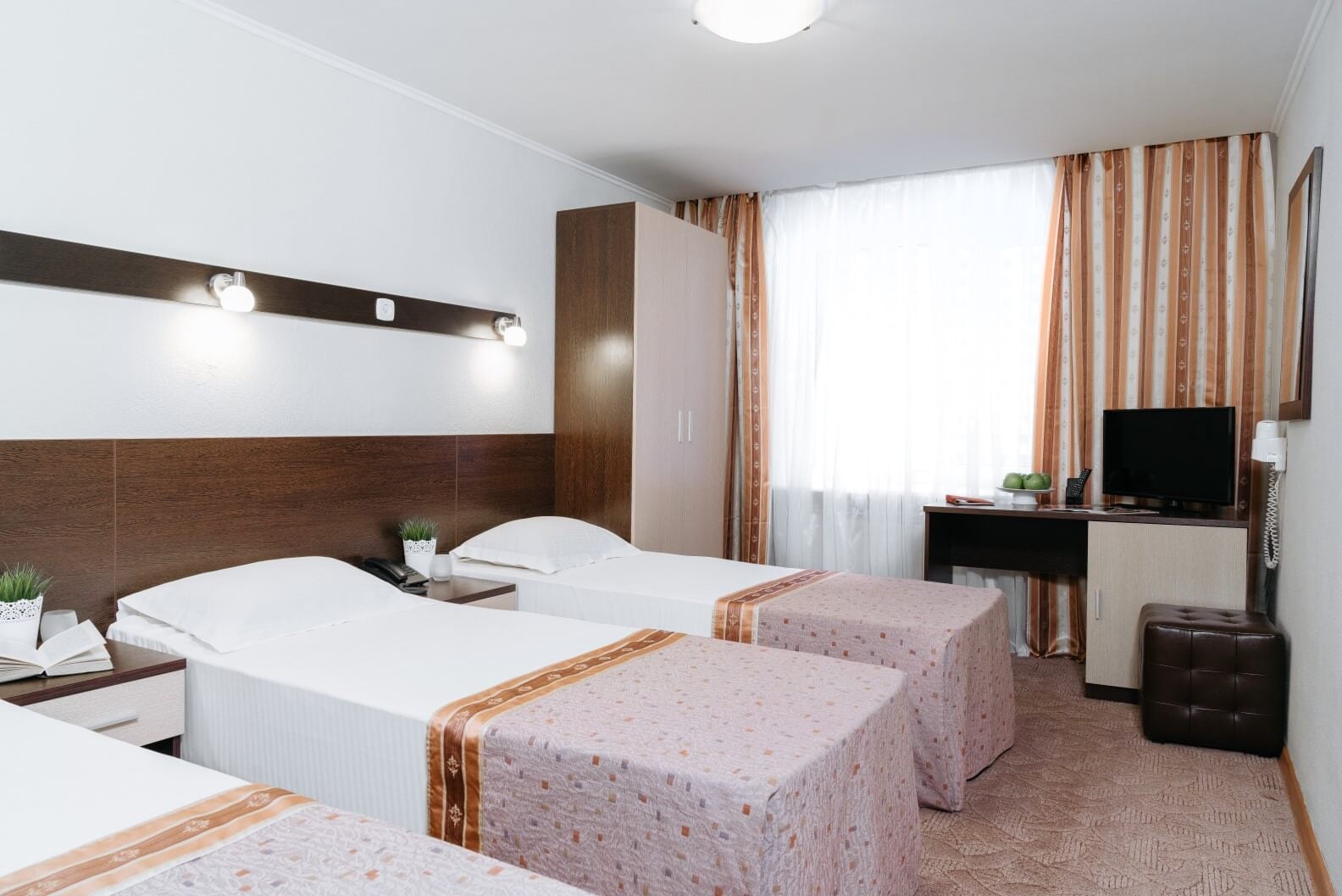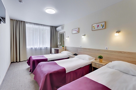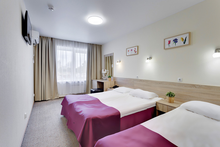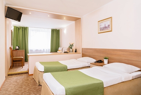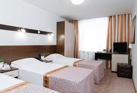 В номере: кровати односпальные /одна двуспальная кровать, прикроватная тумбочка, телевизор, телефон, холодильник