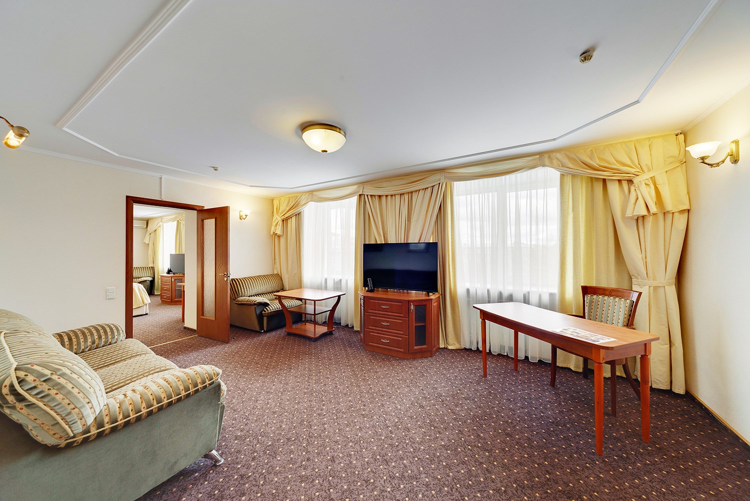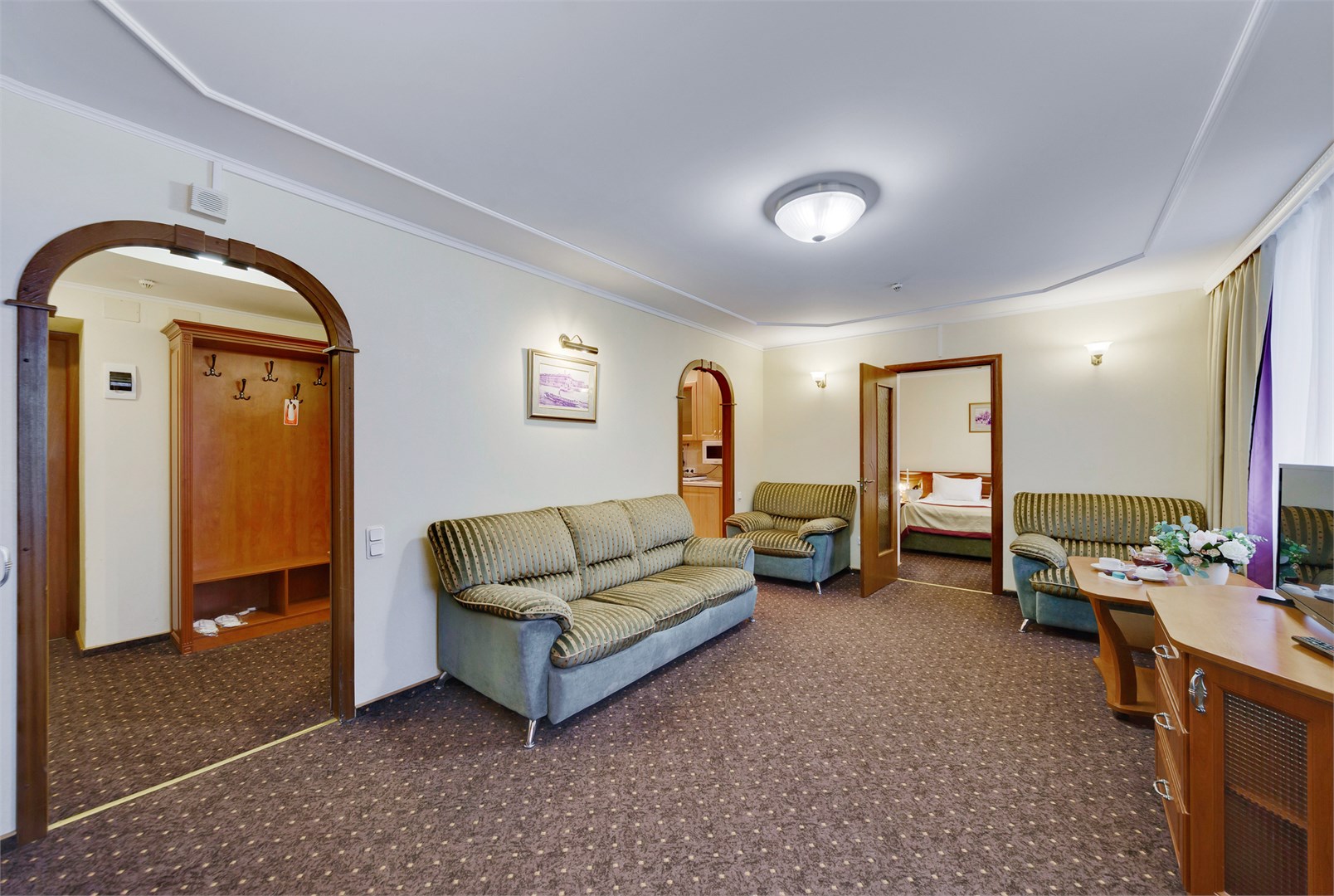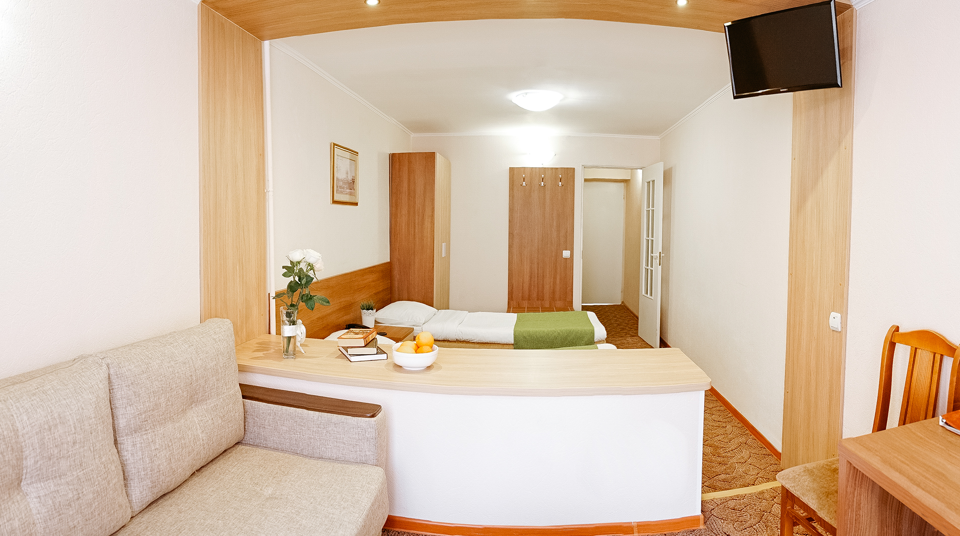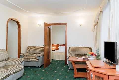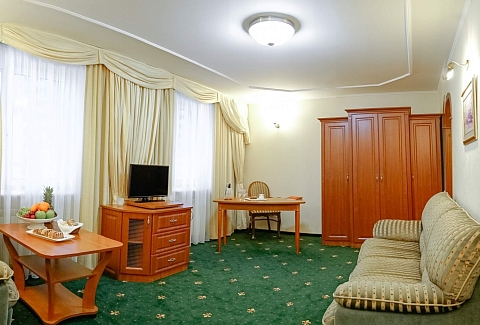 В номере: диван, кровати односпальные /одна двуспальная кровать, прикроватные тумбочки, стол, стулья, кондиционер, телевизор, телефон, холодильник, чайный набор посуды, электрочайник