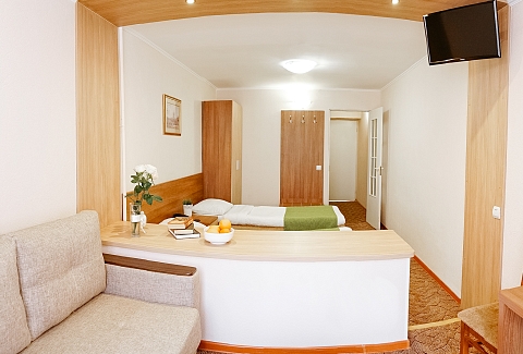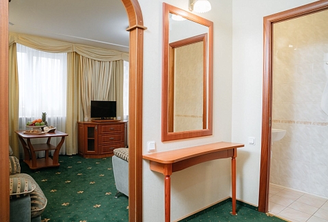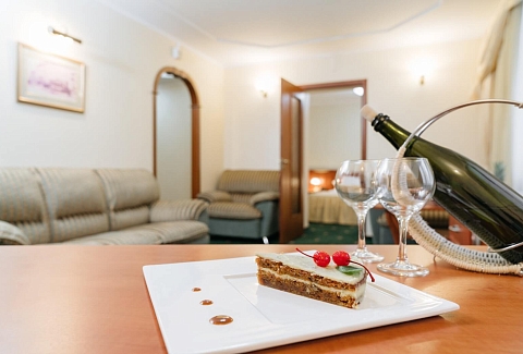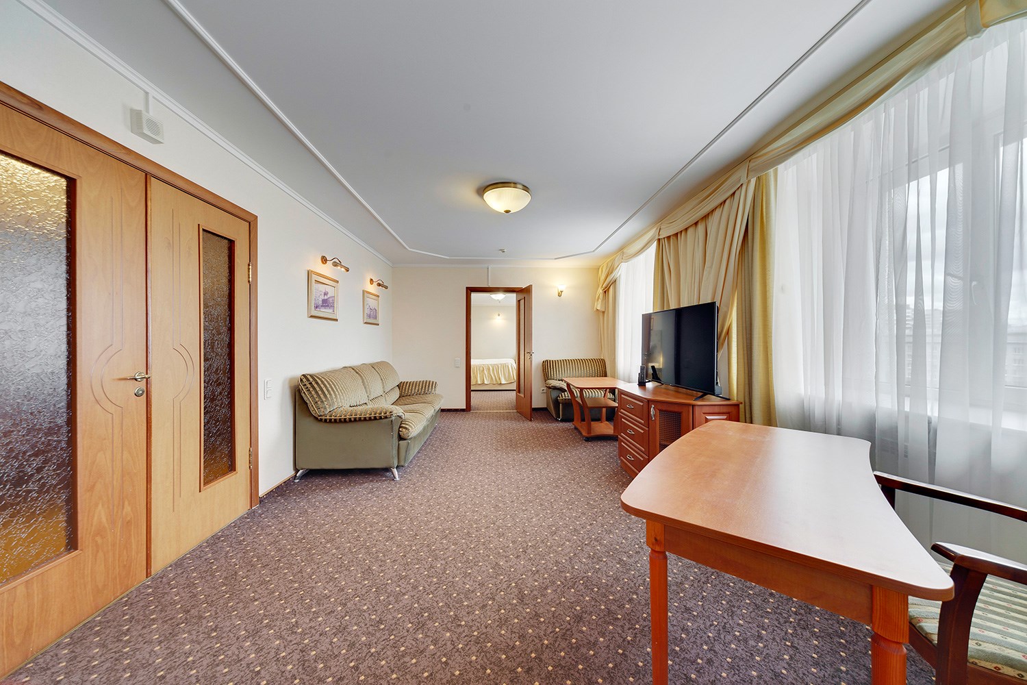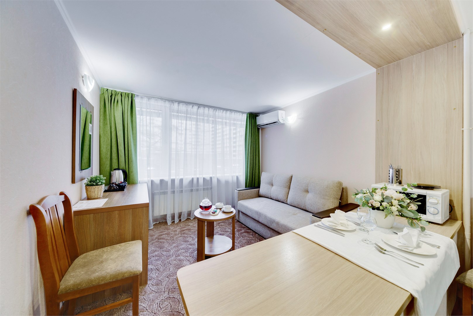В номере: диван, кровати односпальные /одна двуспальная кровать, прикроватные тумбочки, стол, стулья, кондиционер, телевизор, телефон, холодильник, чайный набор посуды, электрочайник