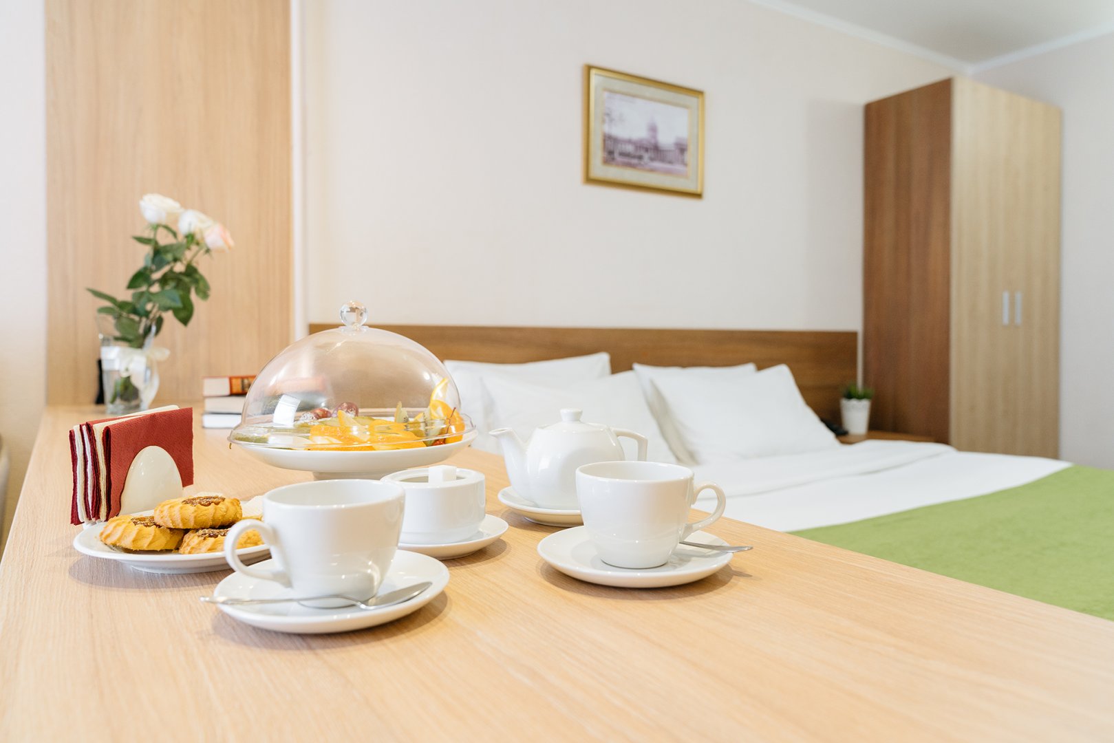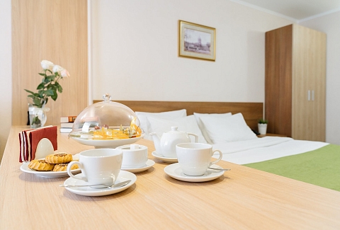 В номере: кровати односпальные /одна двуспальная кровать, прикроватные тумбочки, стол, стулья, тумба под телевизор, телевизор, телефон, холодильник, чайный набор посуды, электрочайник