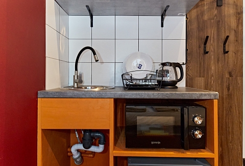 В номере: вешалка, зеркало, кровати односпальные /одна двуспальная кровать, прикроватный столик, стол, стул, кондиционер, микроволновая печь, мини-холодильник, набор посуды, телевизор, электрочайник