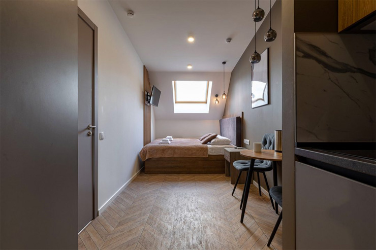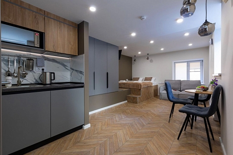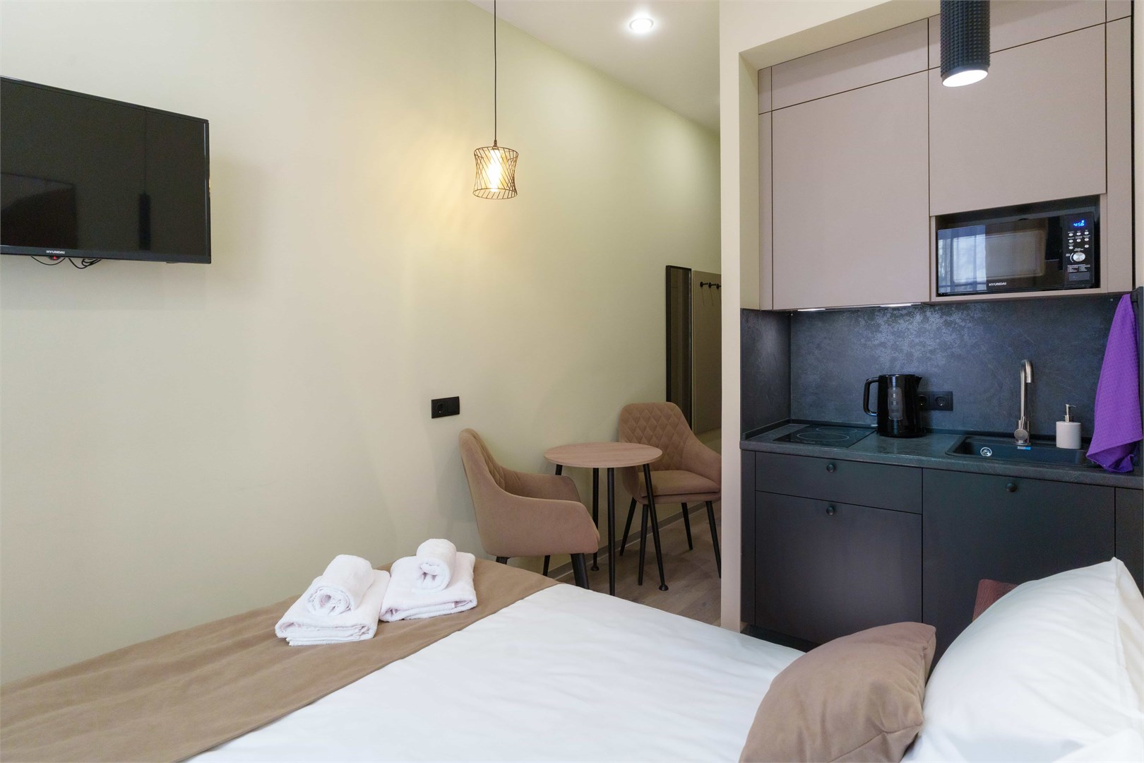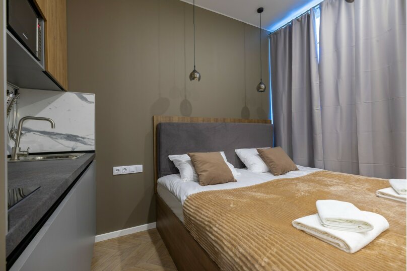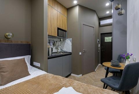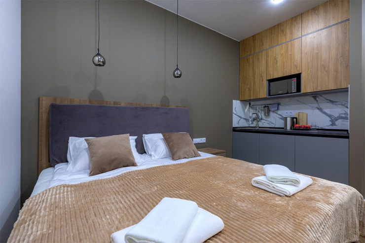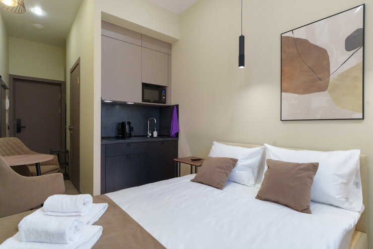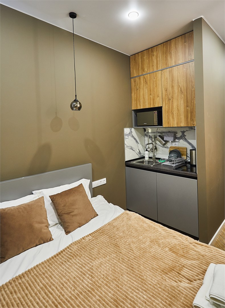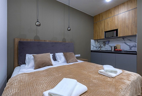 В номере: зеркало, кровать двуспальная, прикроватные тумбочки, стол, стулья, шкаф, микроволновая печь, мини-холодильник, набор посуды, плита электрическая, телевизор, электрочайник