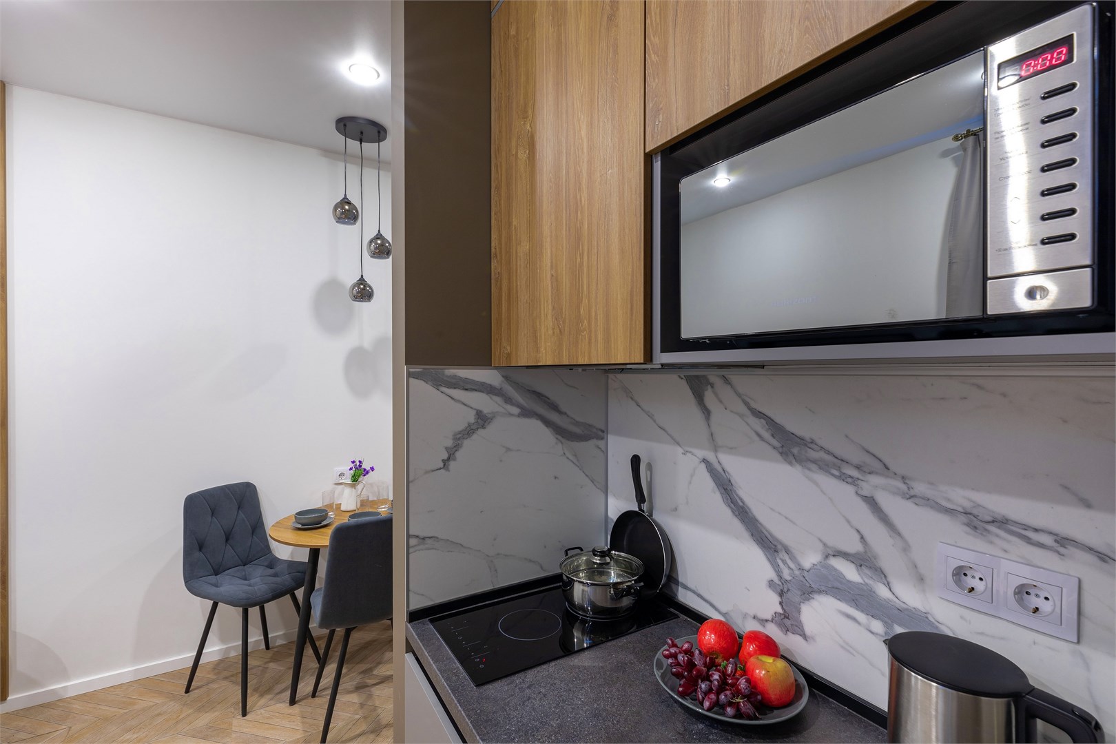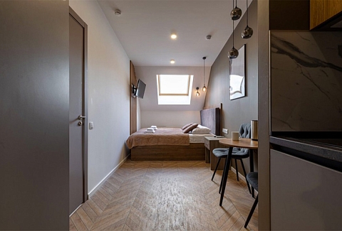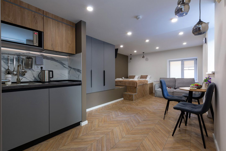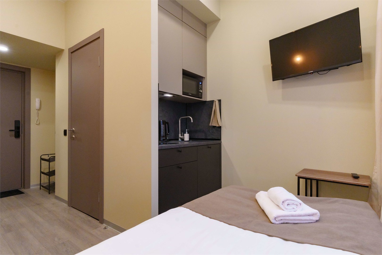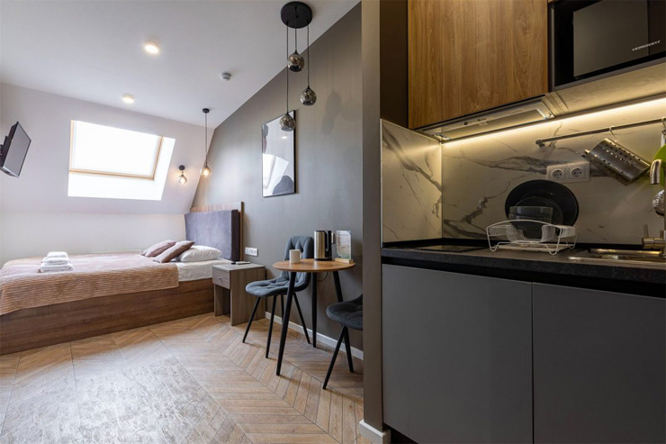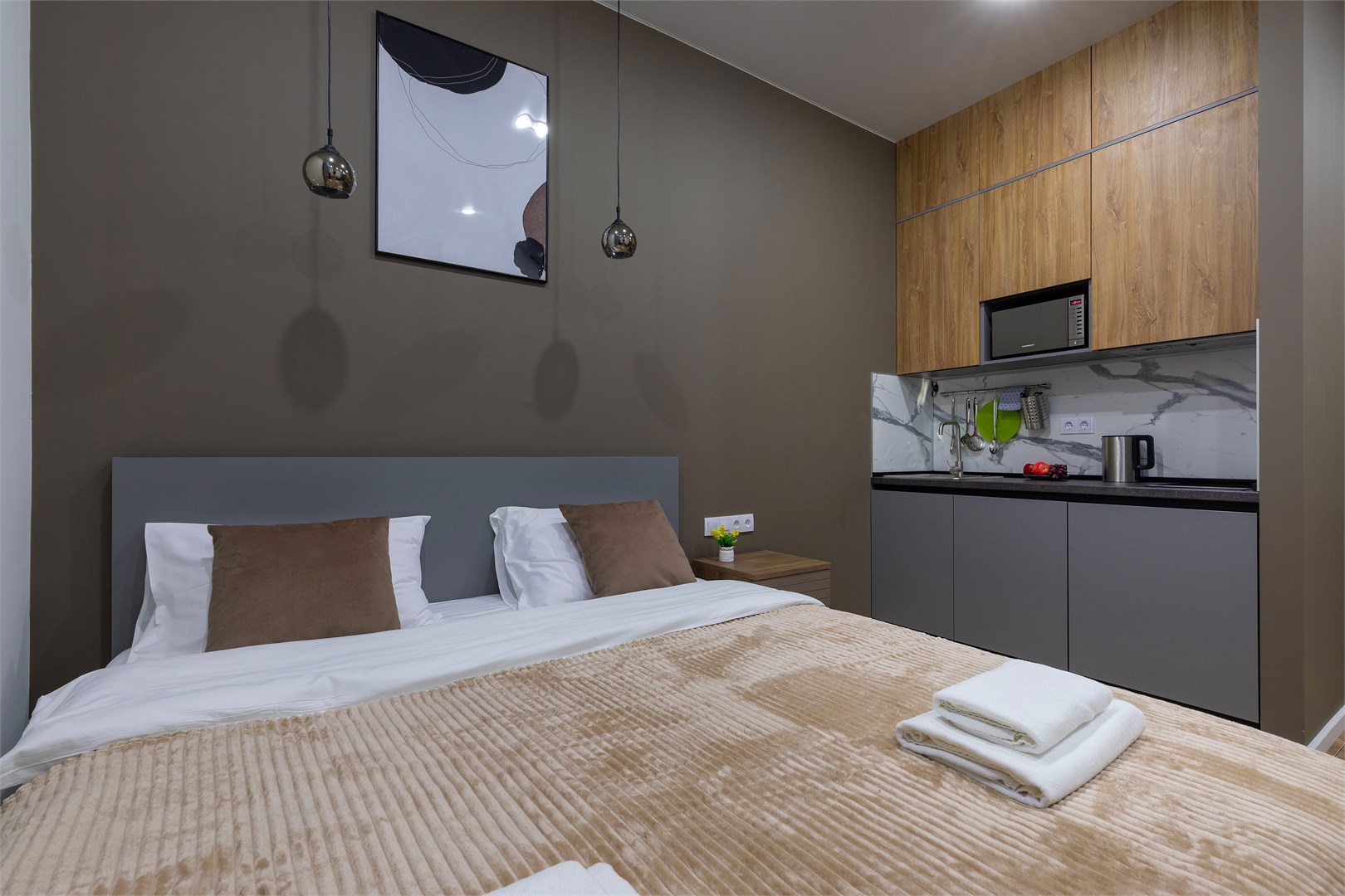 В номере: зеркало, кровать двуспальная, прикроватные тумбочки, стол, стулья, шкаф, микроволновая печь, мини-холодильник, набор посуды, плита электрическая, телевизор, электрочайник
