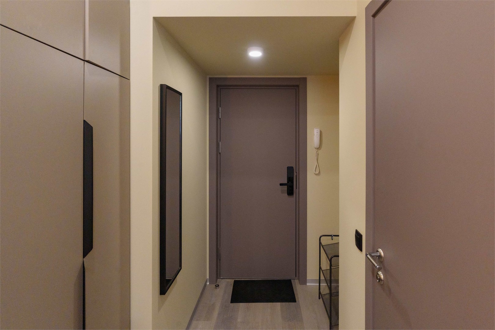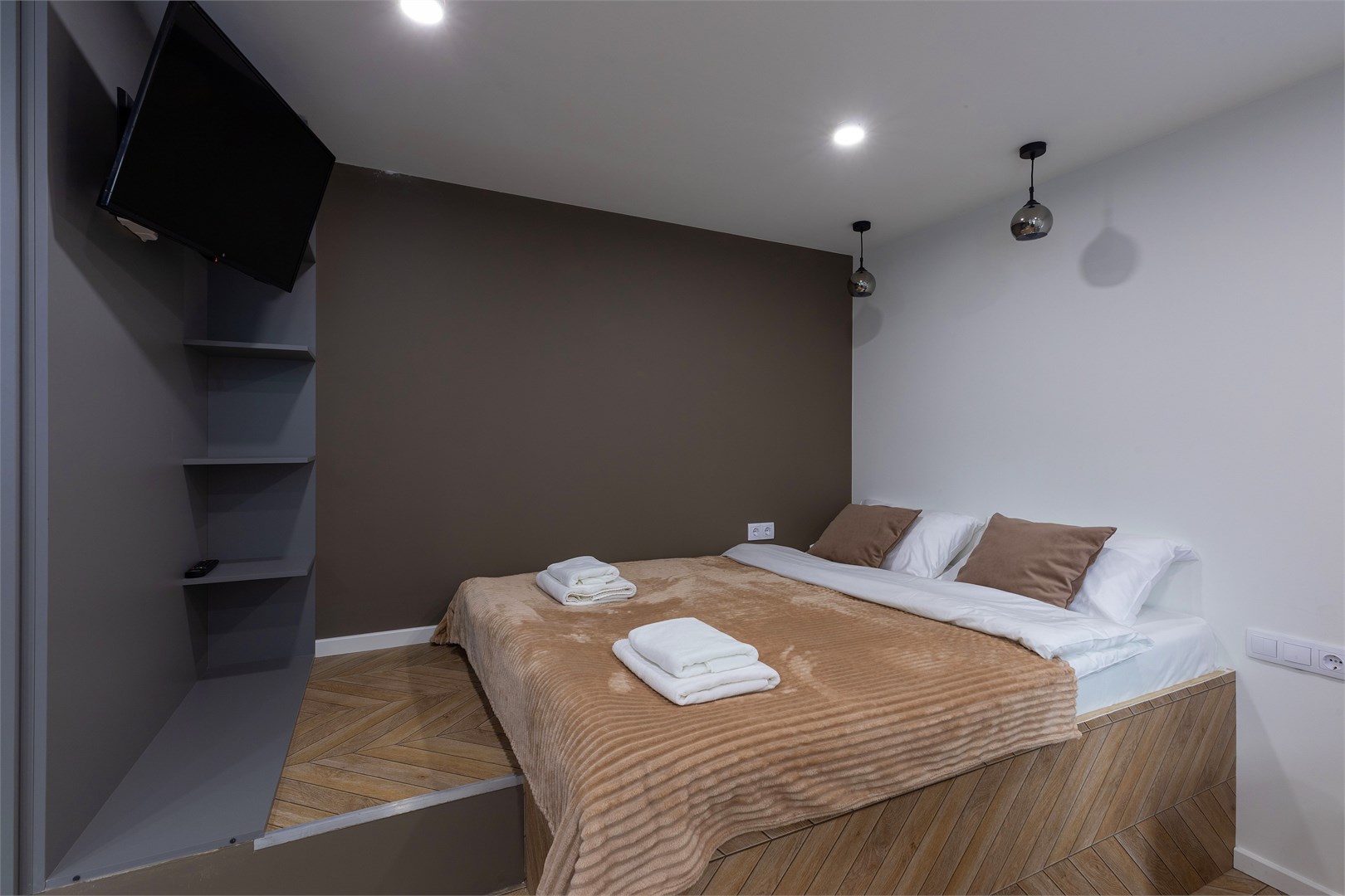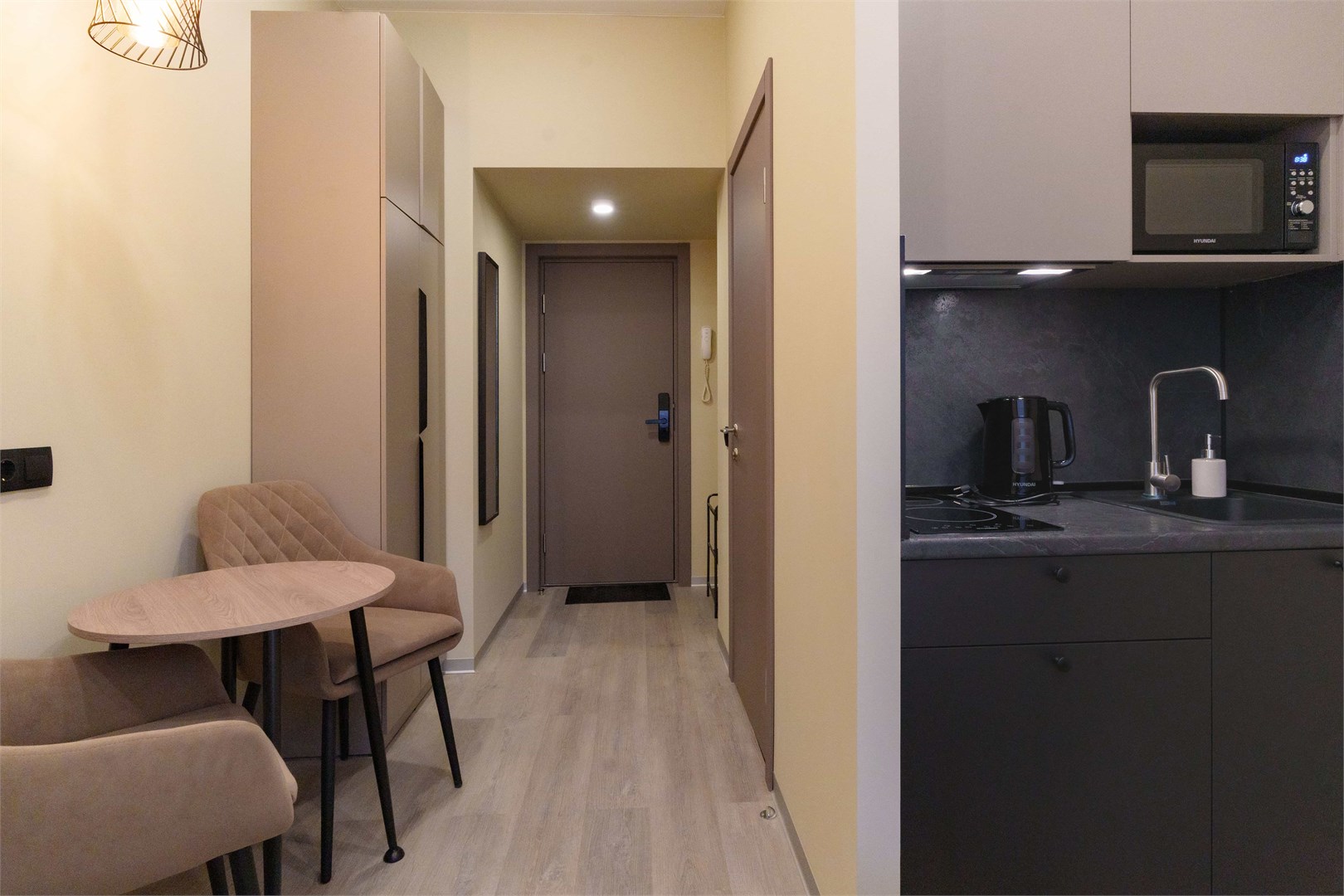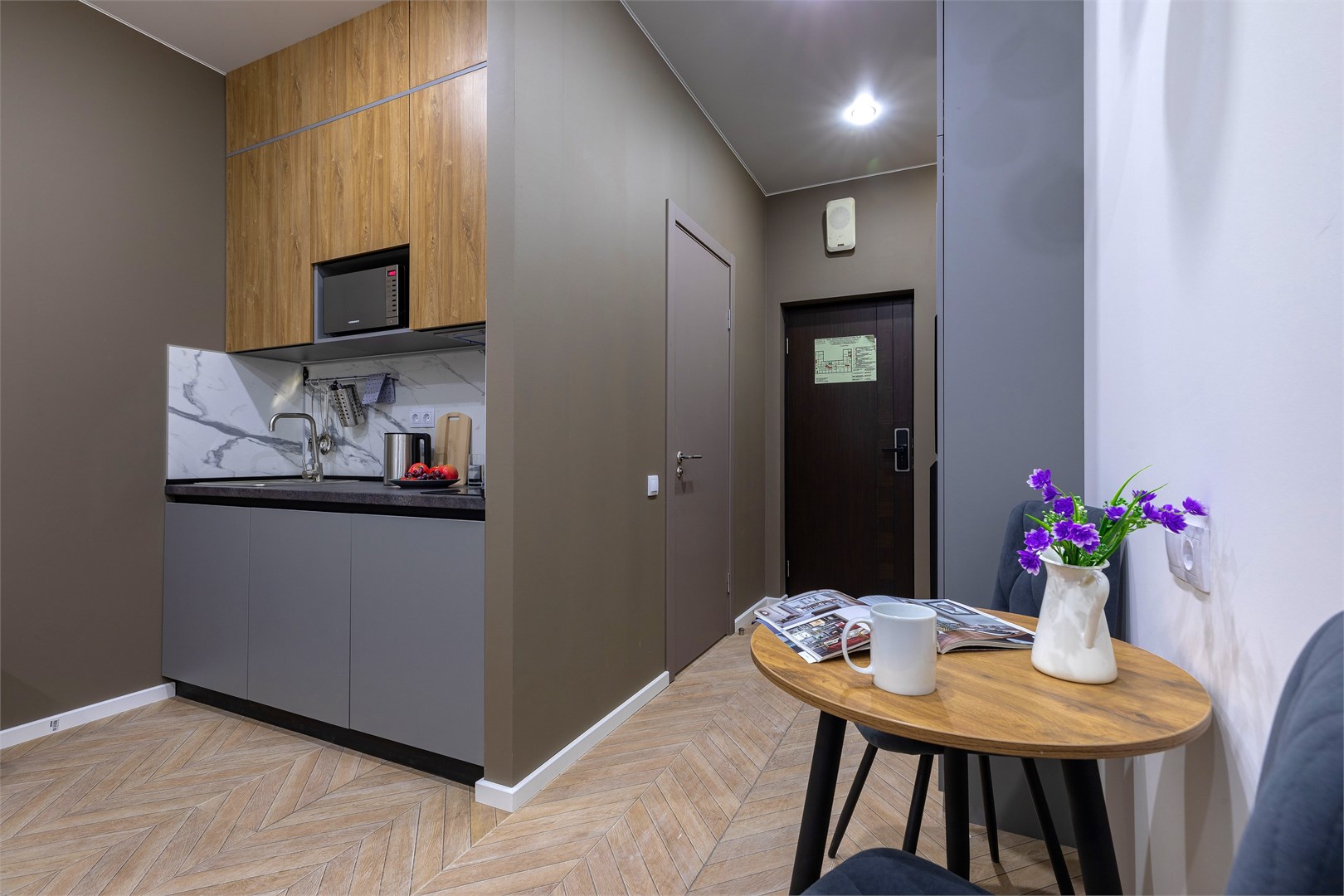 В номере: зеркало, кровать двуспальная, прикроватные тумбочки, стол, стулья, шкаф, микроволновая печь, мини-холодильник, набор посуды, плита электрическая, телевизор, электрочайник
