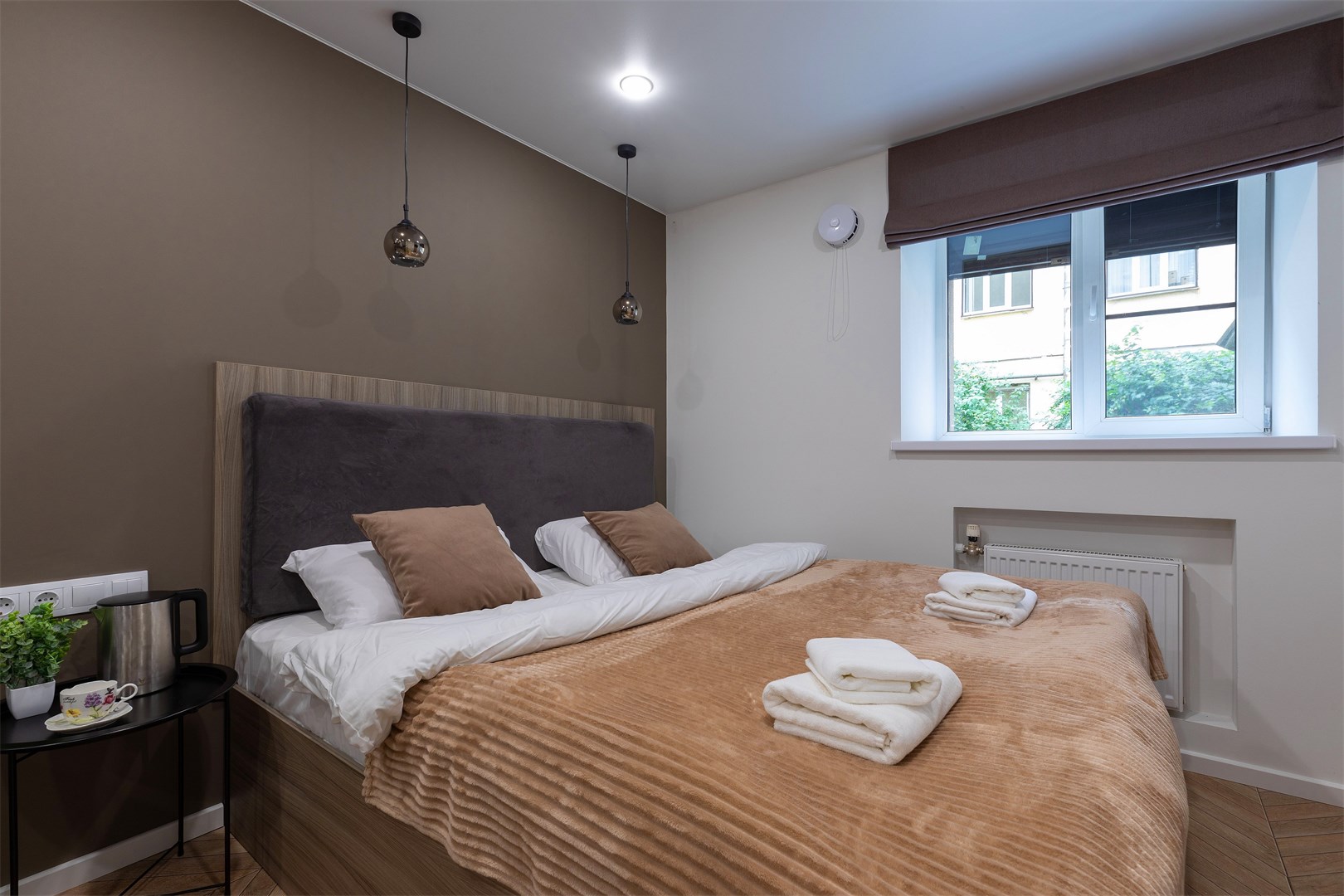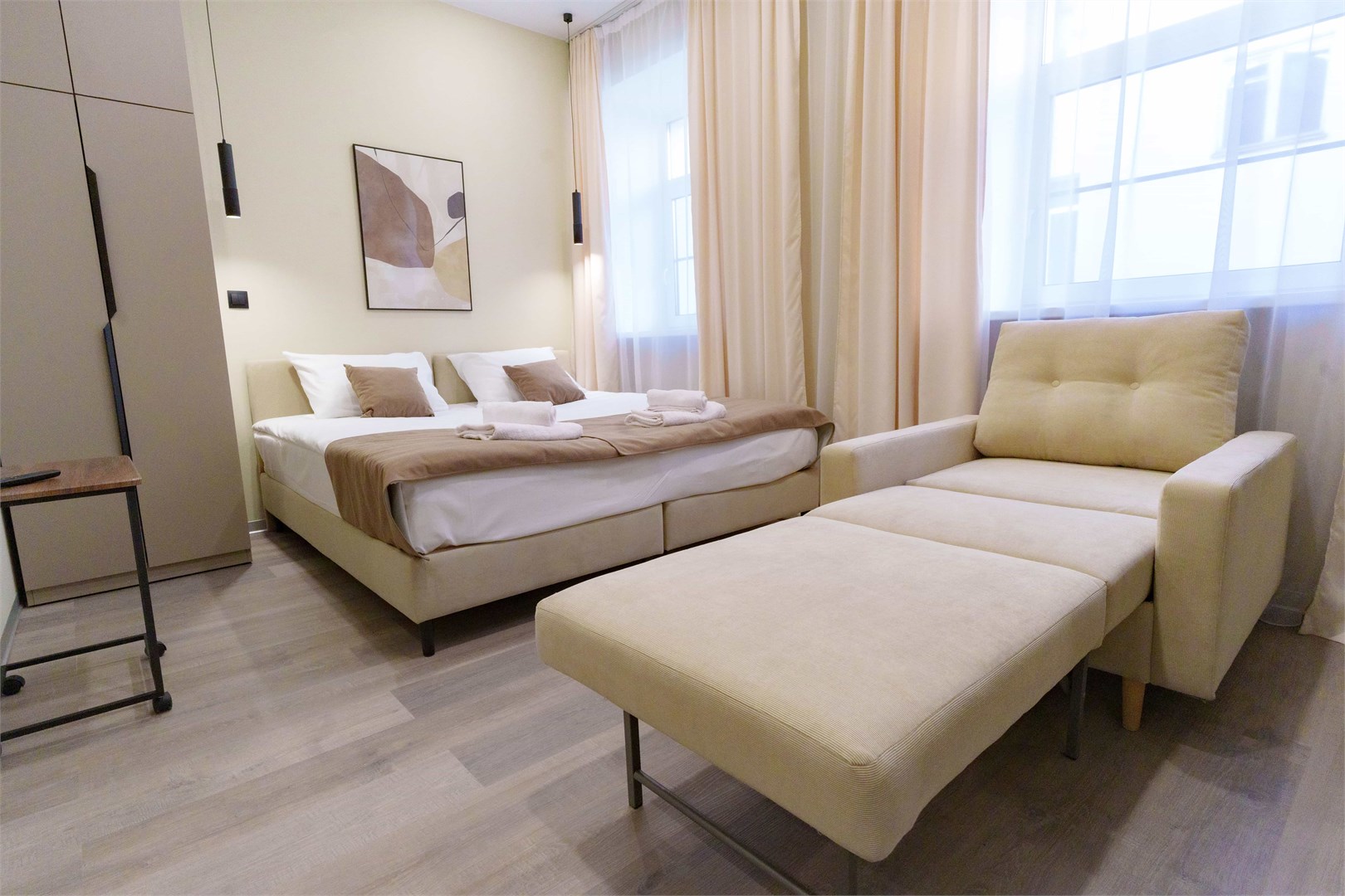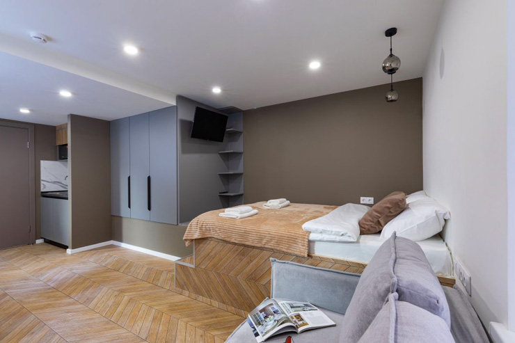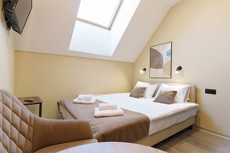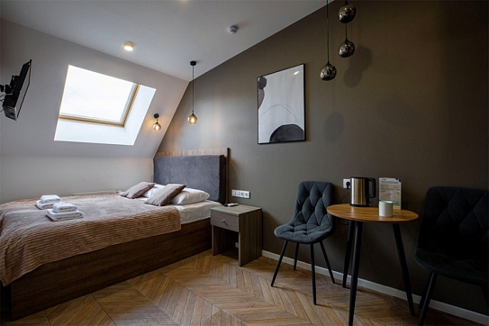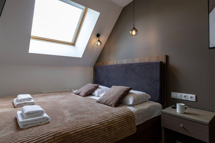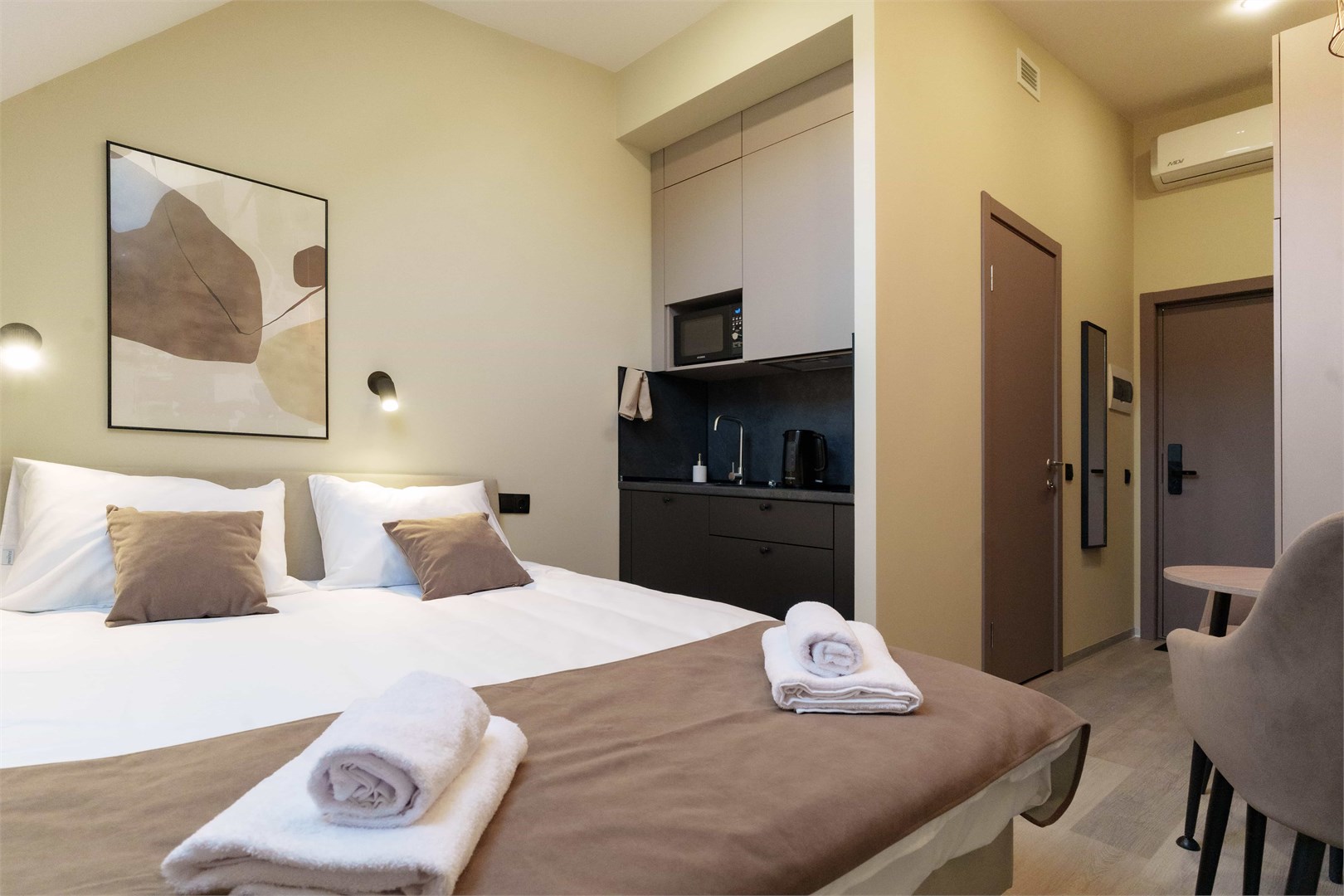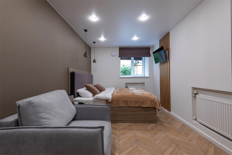 В номере: диван раскладной, зеркало, кровать двуспальная, прикроватные тумбочки, стол, стулья, шкаф, микроволновая печь, мини-холодильник, набор посуды, плита электрическая, телевизор, электрочайник