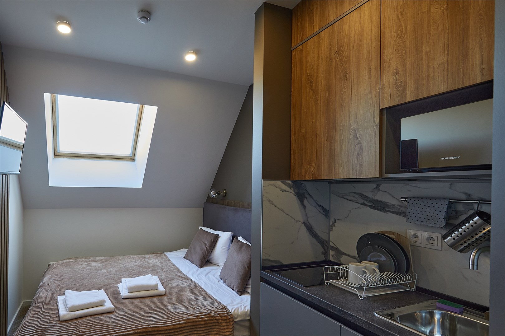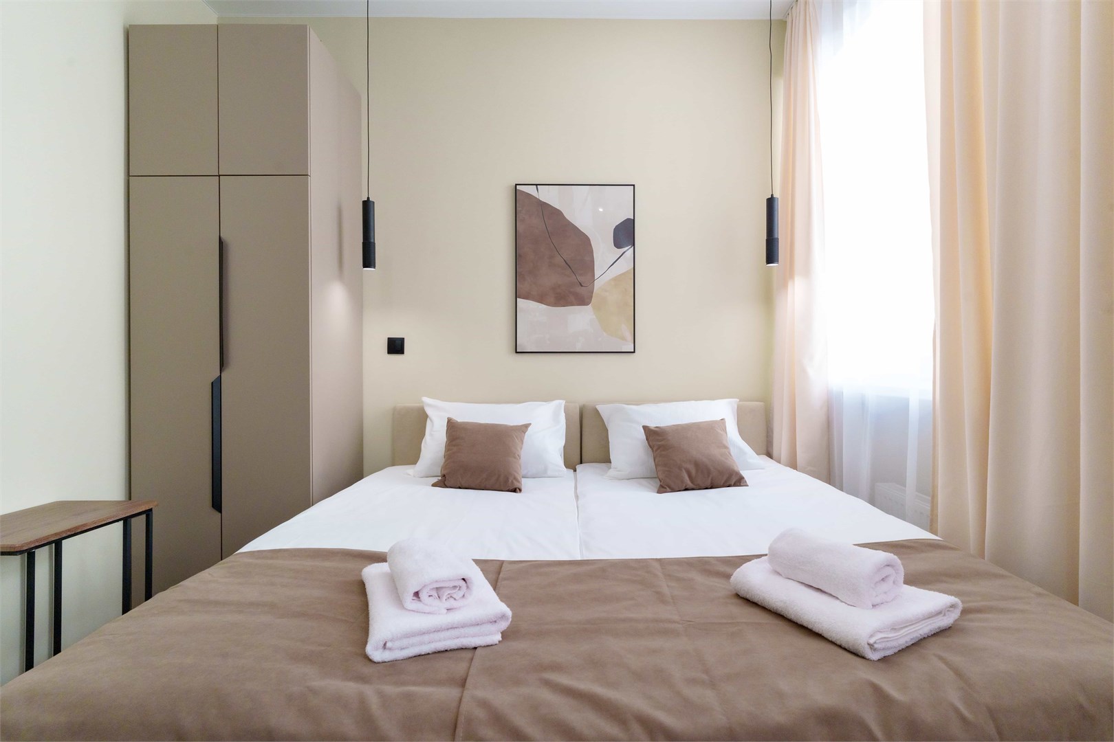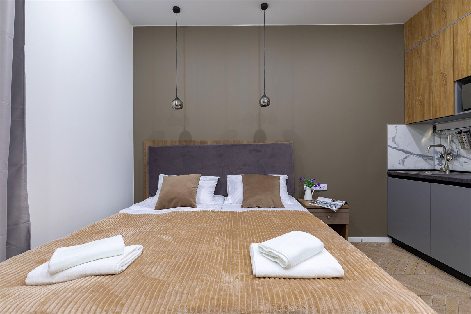 В номере: диван раскладной, зеркало, кровать двуспальная, прикроватные тумбочки, стол, стулья, шкаф, микроволновая печь, мини-холодильник, набор посуды, плита электрическая, телевизор, электрочайник