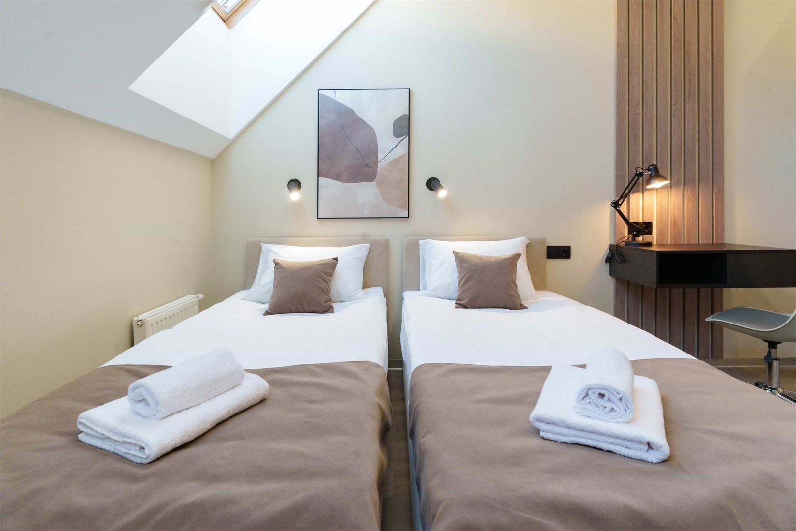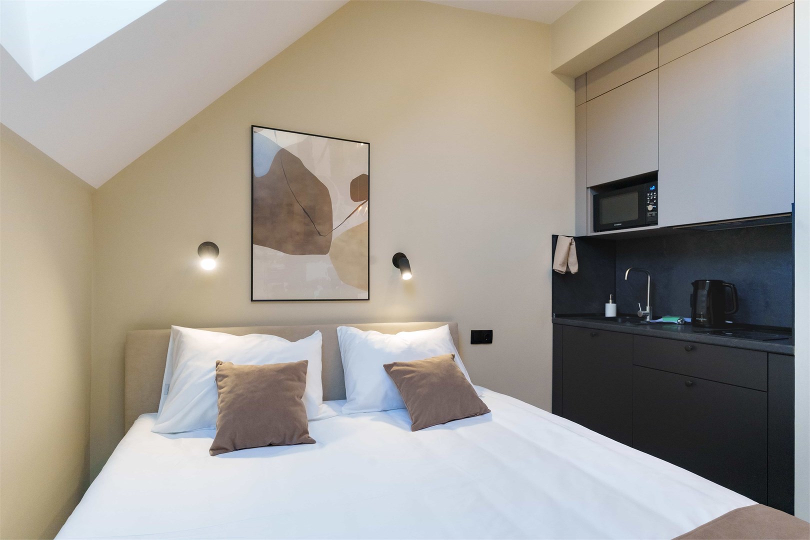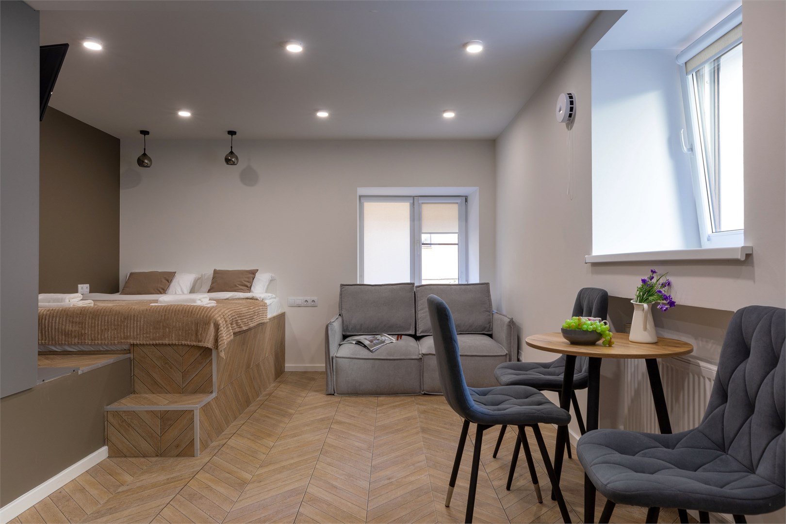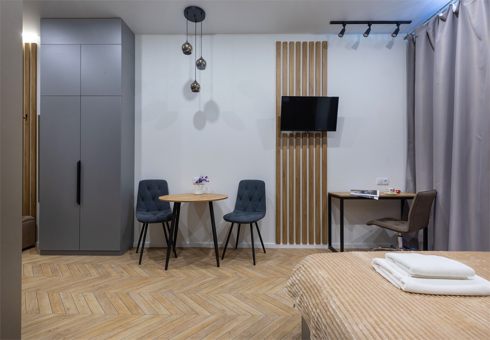 В номере: диван раскладной, зеркало, кровать двуспальная, прикроватные тумбочки, стол, стулья, шкаф, микроволновая печь, мини-холодильник, набор посуды, плита электрическая, телевизор, электрочайник