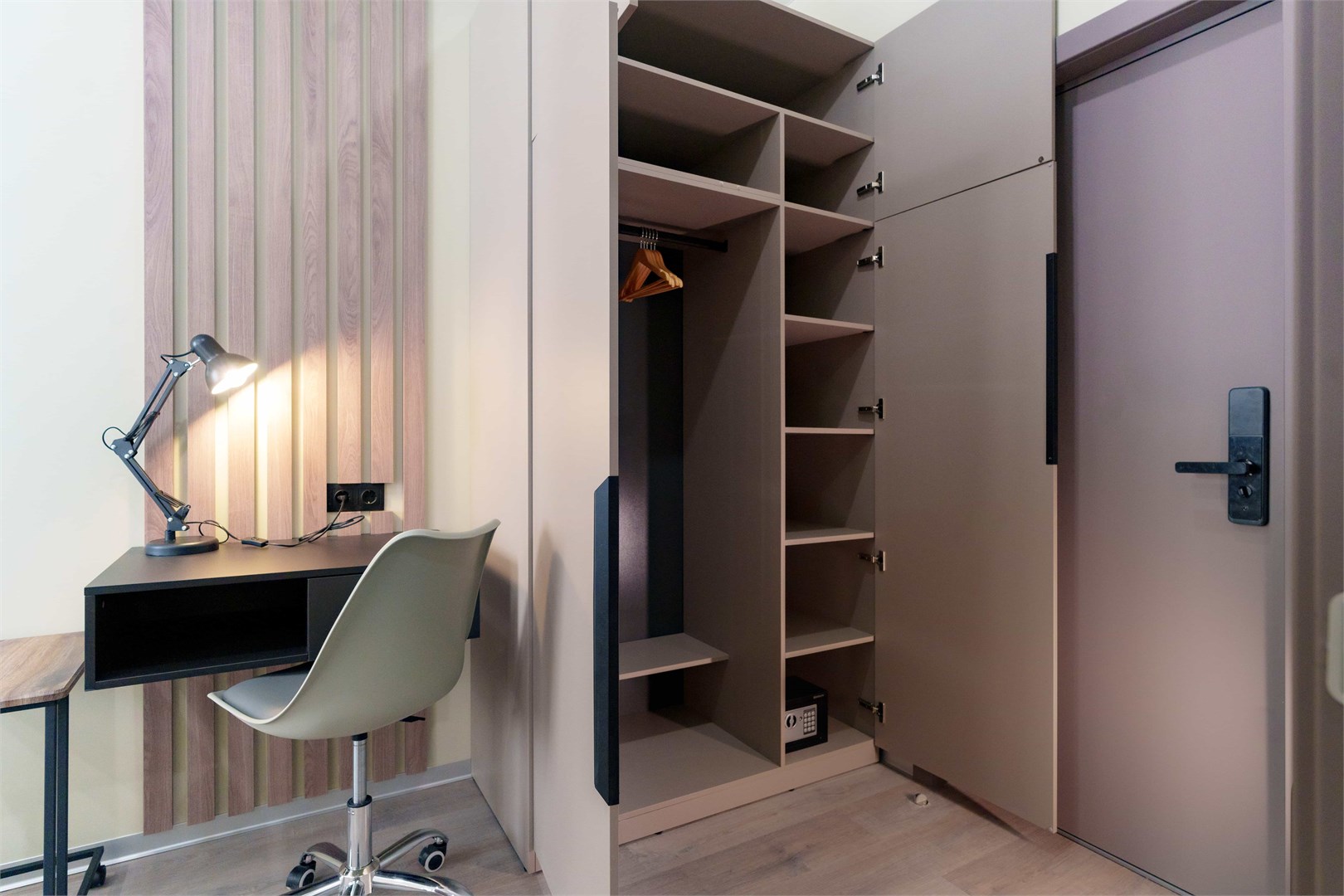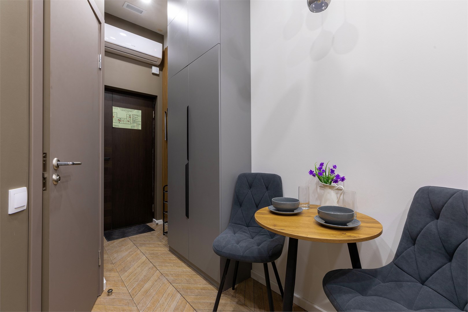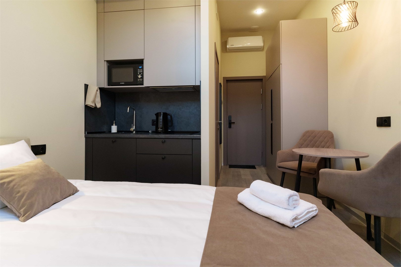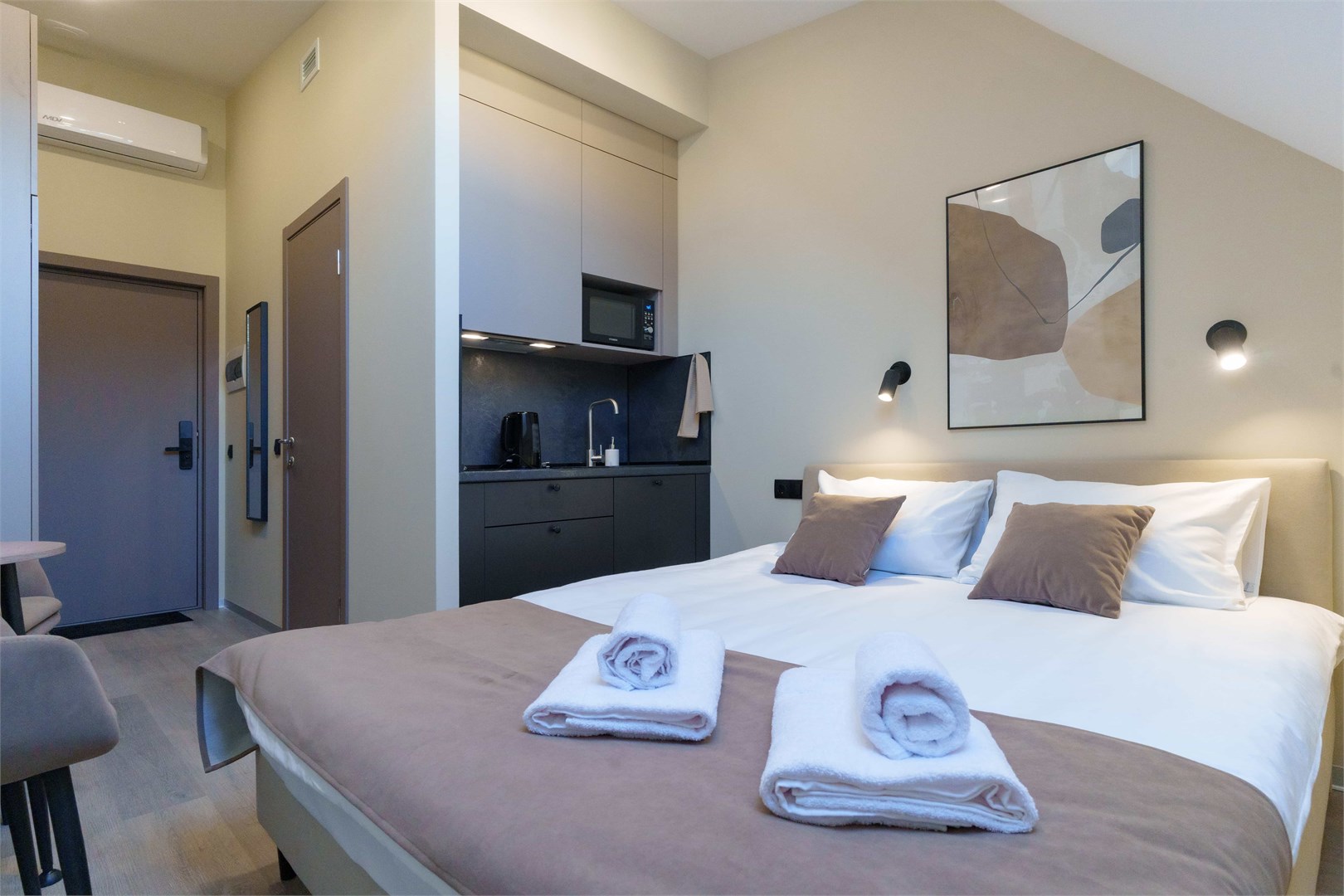 В номере: зеркало, кровать двуспальная, прикроватные тумбочки, стол, стулья, шкаф, кондиционер, микроволновая печь, мини-холодильник, набор посуды, плита электрическая, телевизор, электрочайник