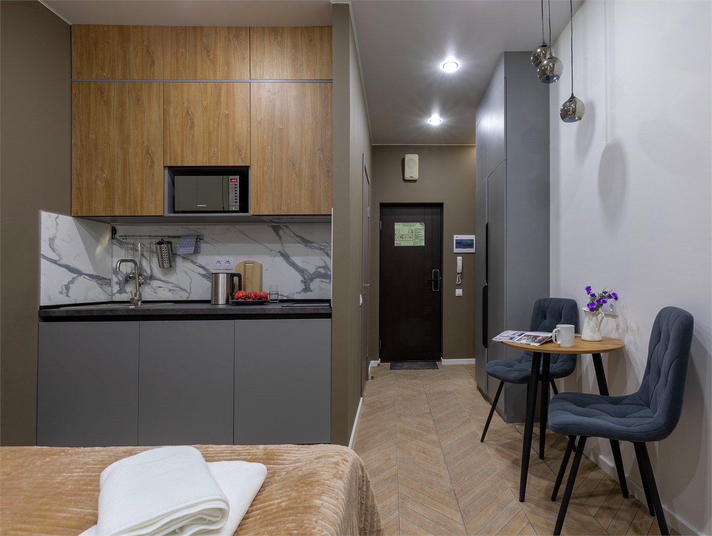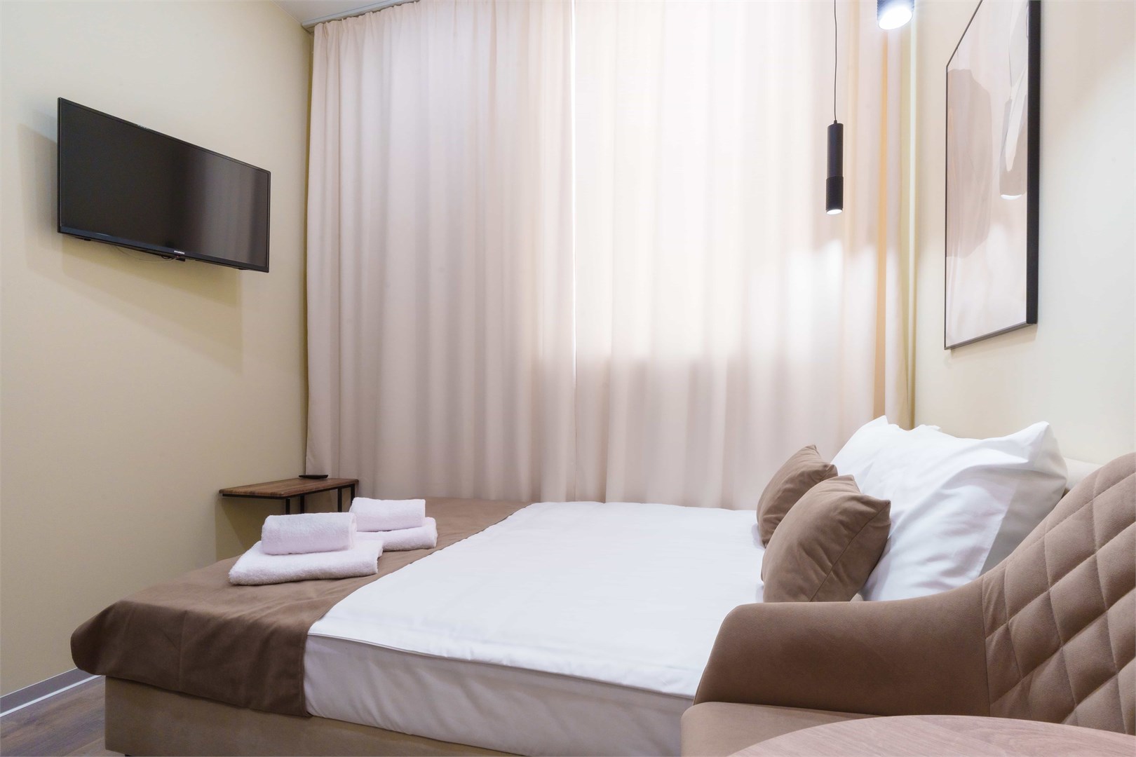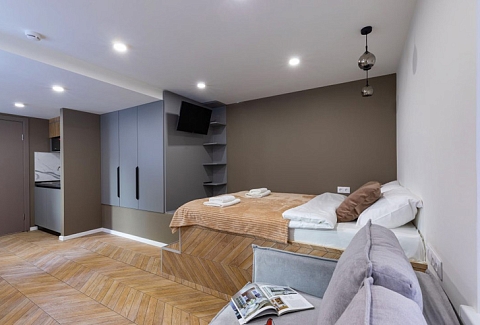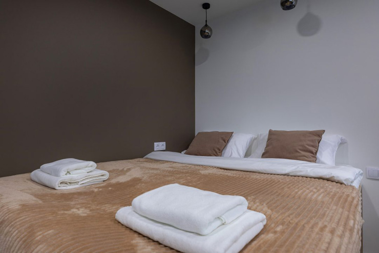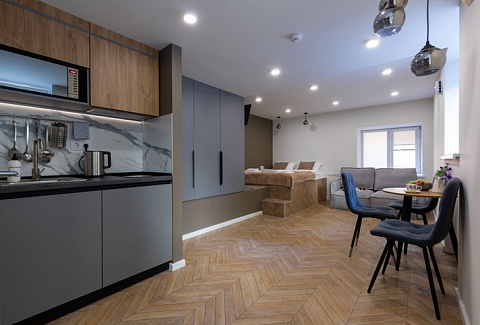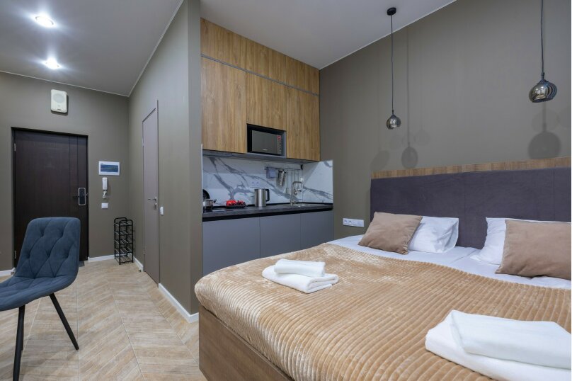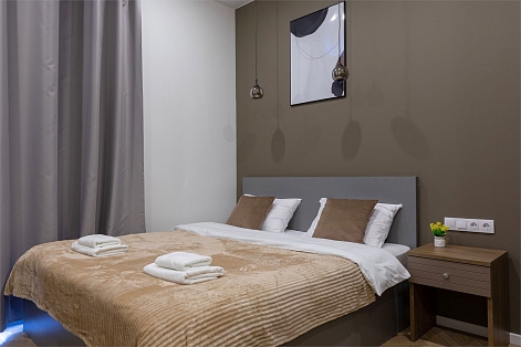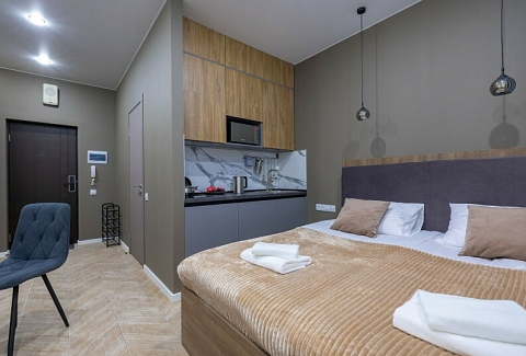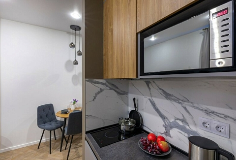 В номере: вешалка, зеркало, кресло-кровать, кровать двуспальная, прикроватные тумбочки, стол, стулья, микроволновая печь, мини-холодильник, набор посуды, плита электрическая, телевизор, электрочайник