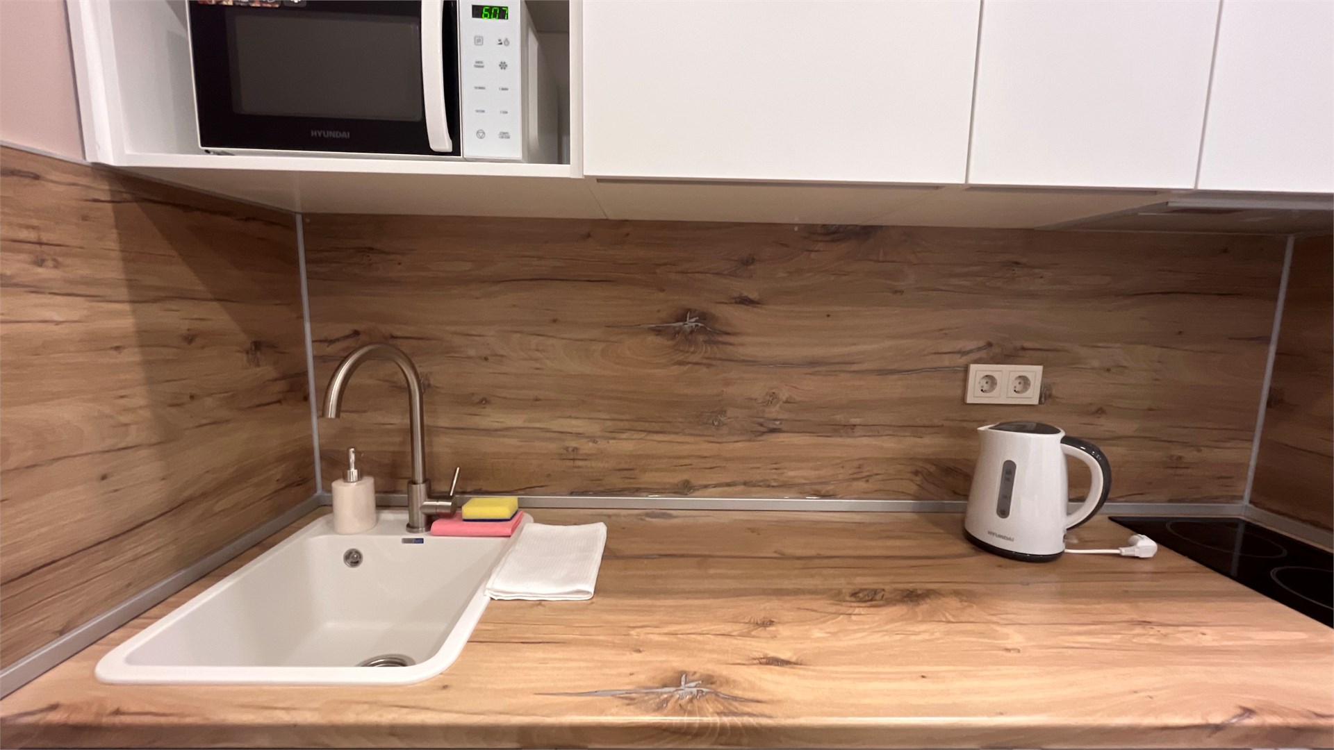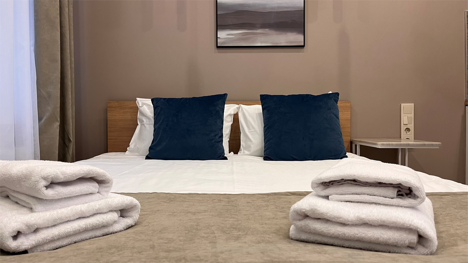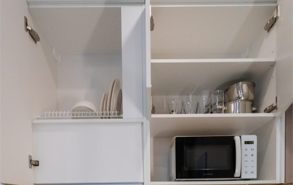 В номере: вешалка, зеркало, кресло-кровать, кровать двуспальная, прикроватные тумбочки, стол, стулья, шкаф, микроволновая печь, мини-холодильник, набор посуды, плита электрическая, телевизор, электрочайник
