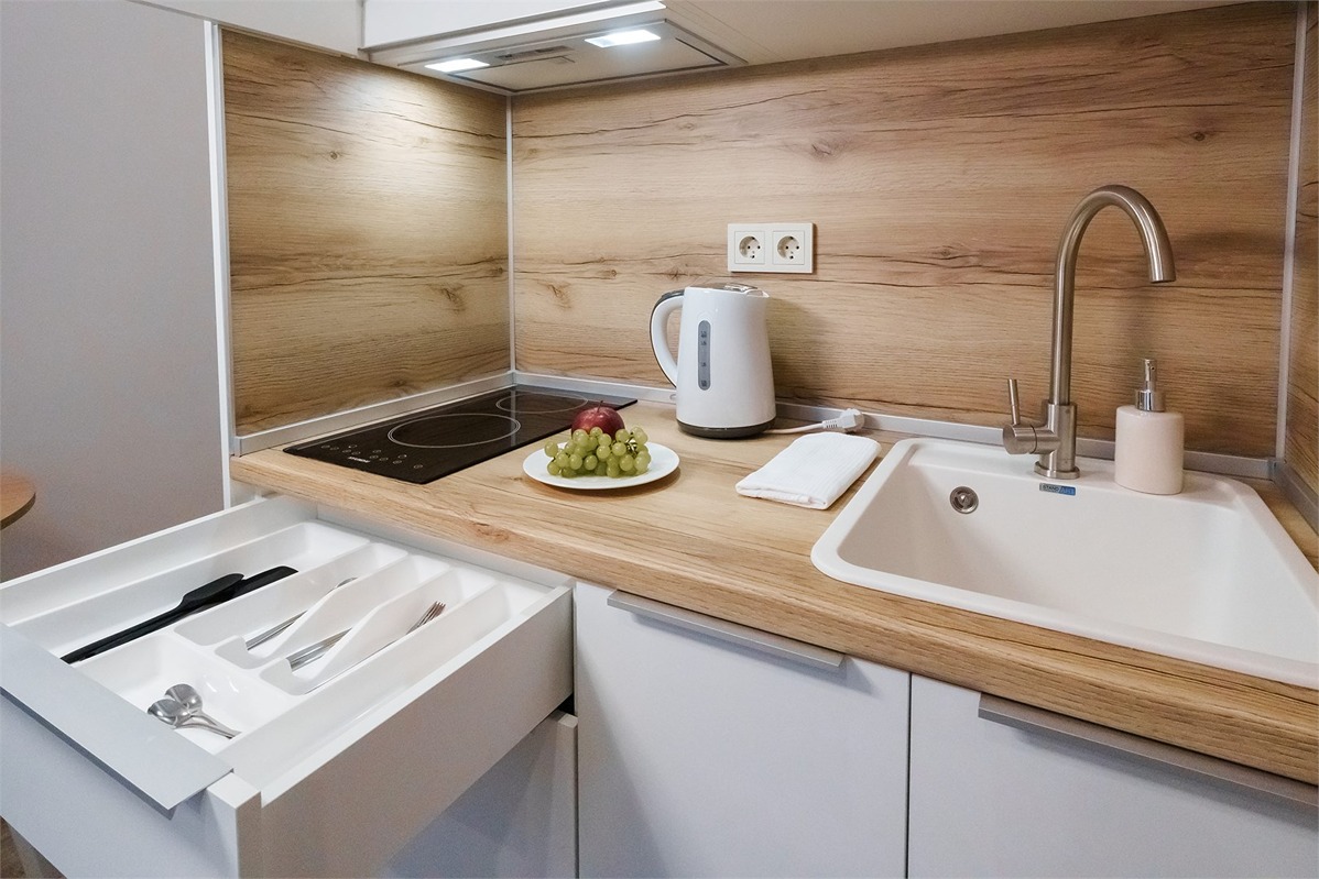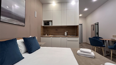 Вблизи от отеля работают различные заведения питания, включая столовую, пекарню и кафе. В номерном фонде апарт-отеля представлено 40 великолепно оформленных номеров, среди которых находятся уютные студии с мини-кухней и стандартные номера, создающие атмосферу домашнего уюта. Каждый номер выполнен в приятных, мягких тонах, что способствует расслаблению и комфортному отдыху. Номера предназначены для размещения до двух гостей, что идеально подходит как для романтического уикенда, так и для делового путешествия. В каждом помещении найдётся всё необходимое для вашего комфортного пребывания: от удобной спальни до современной техники, а также качественной мебели.