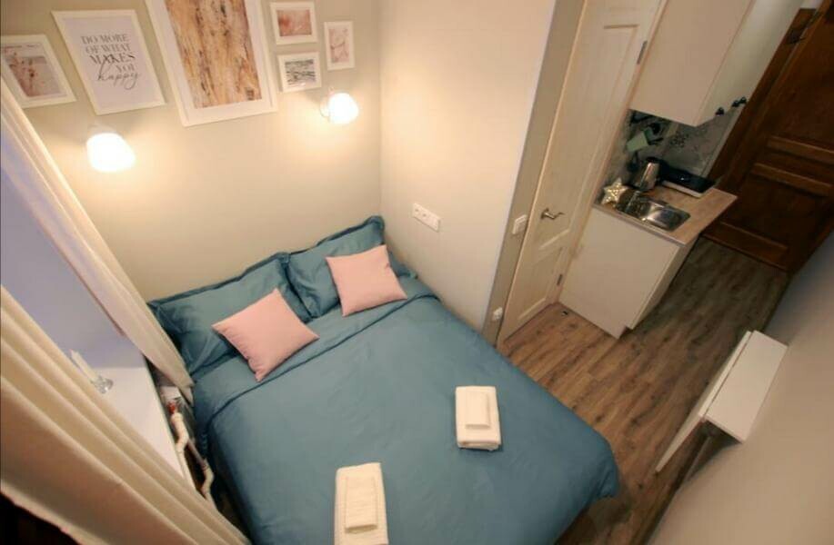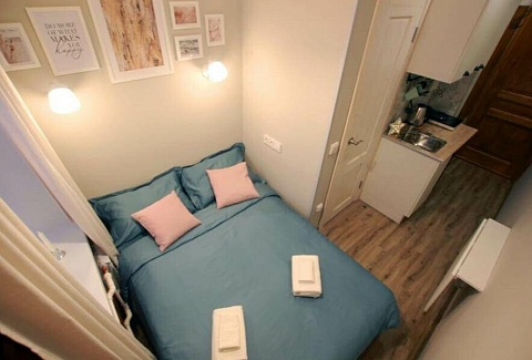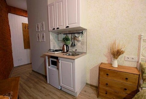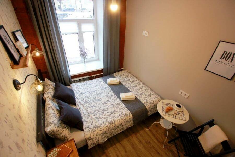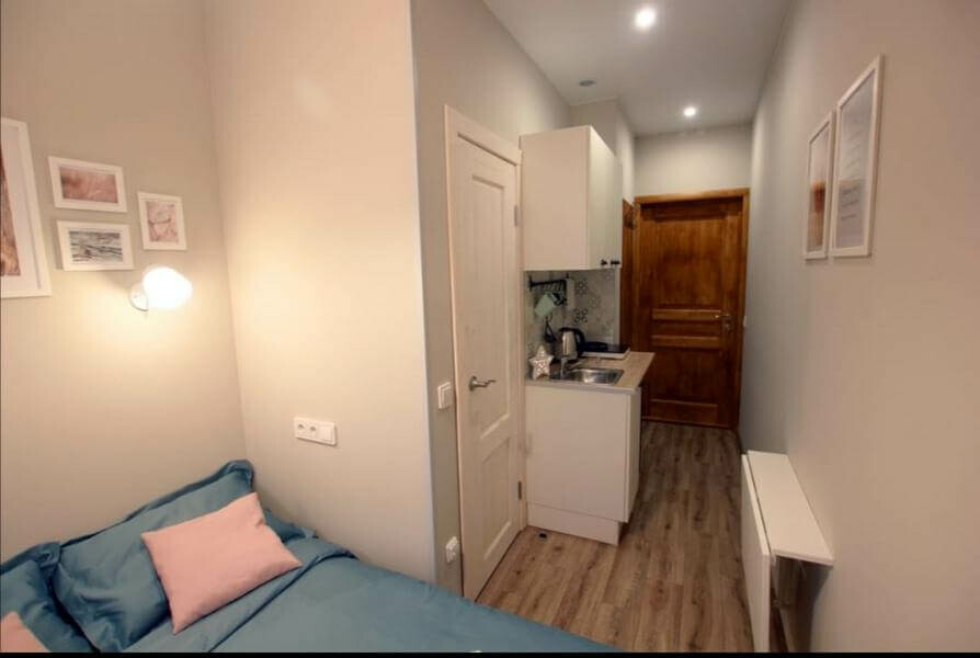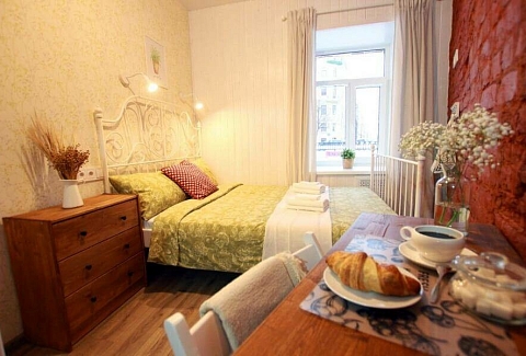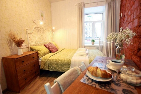 Окна дома выходят живописную набережную канала Грибоедова. Стойка регистрации работает круглосуточно, при необходимости администратор предоставит утюг. Во всем гостевом доме можно подключиться к высокоскоростному Wi-Fi.Номера-студии небольшие, но уютные: интерьеры выполнены в классическом дизайне и теплых тонах, очаровательные детали создают почти домашнюю обстановку, мелочи продуманы с заботой о гостях. Компактная спальня вмещает двуспальную кровать и телевизор. Кухонная и обеденная зоны оборудованы самым необходимым для приготовления еды. Санузел укомплектован душевой кабиной и набором полотенец и одноразовых косметических принадлежностей.
