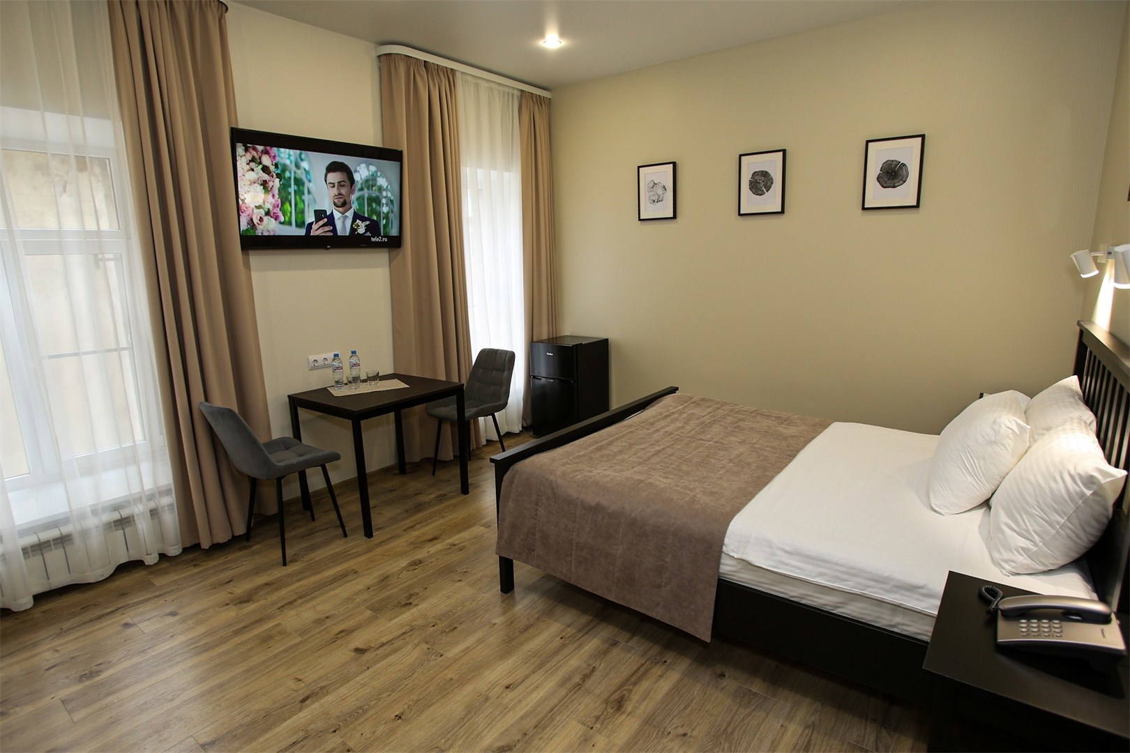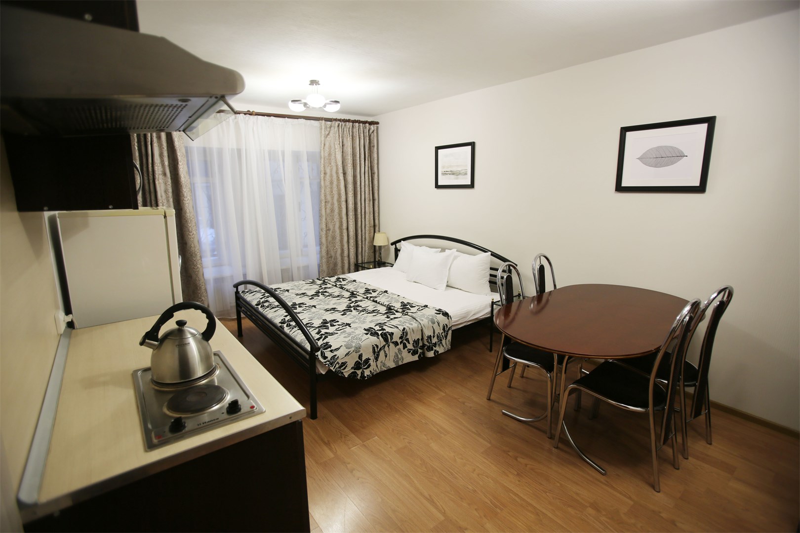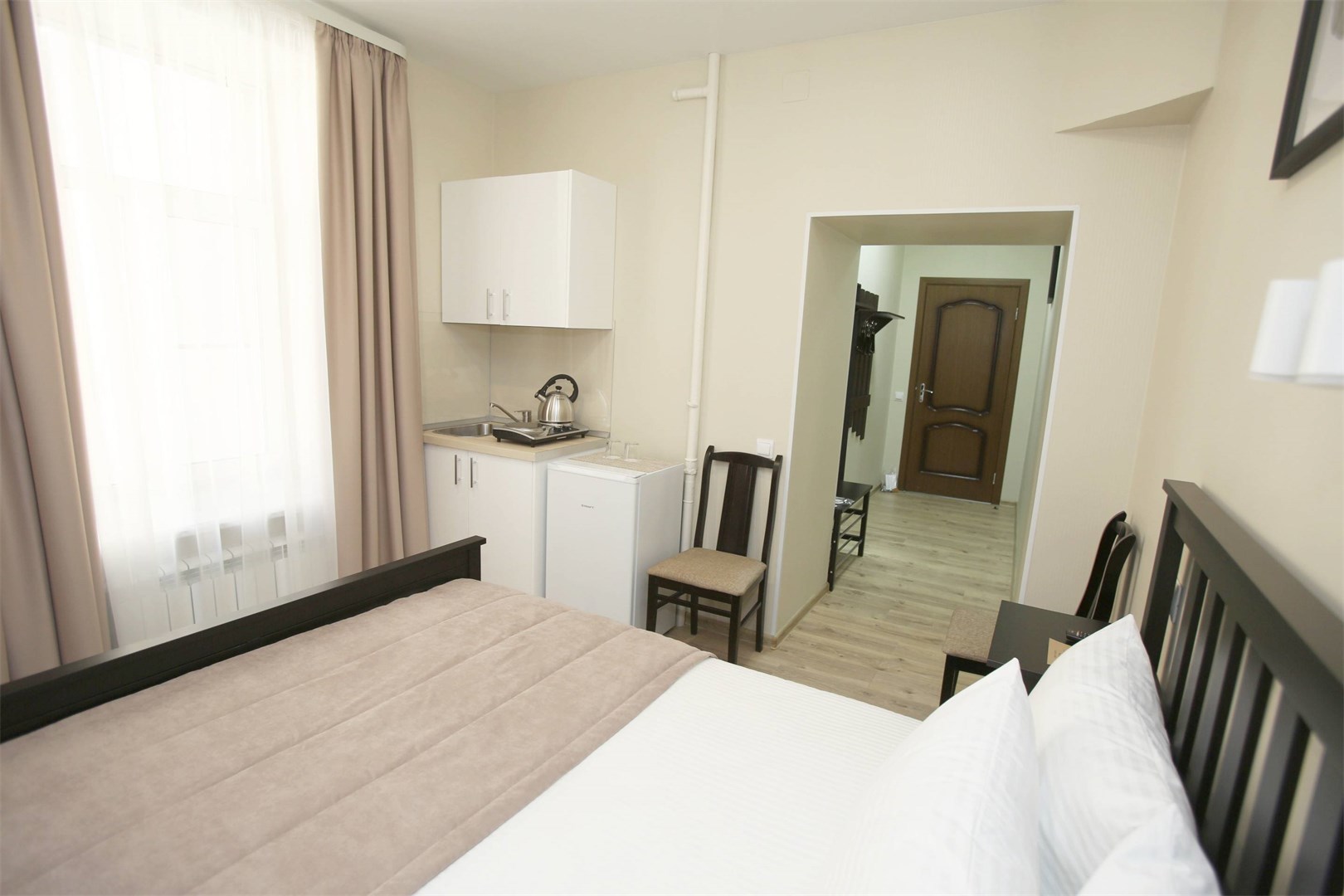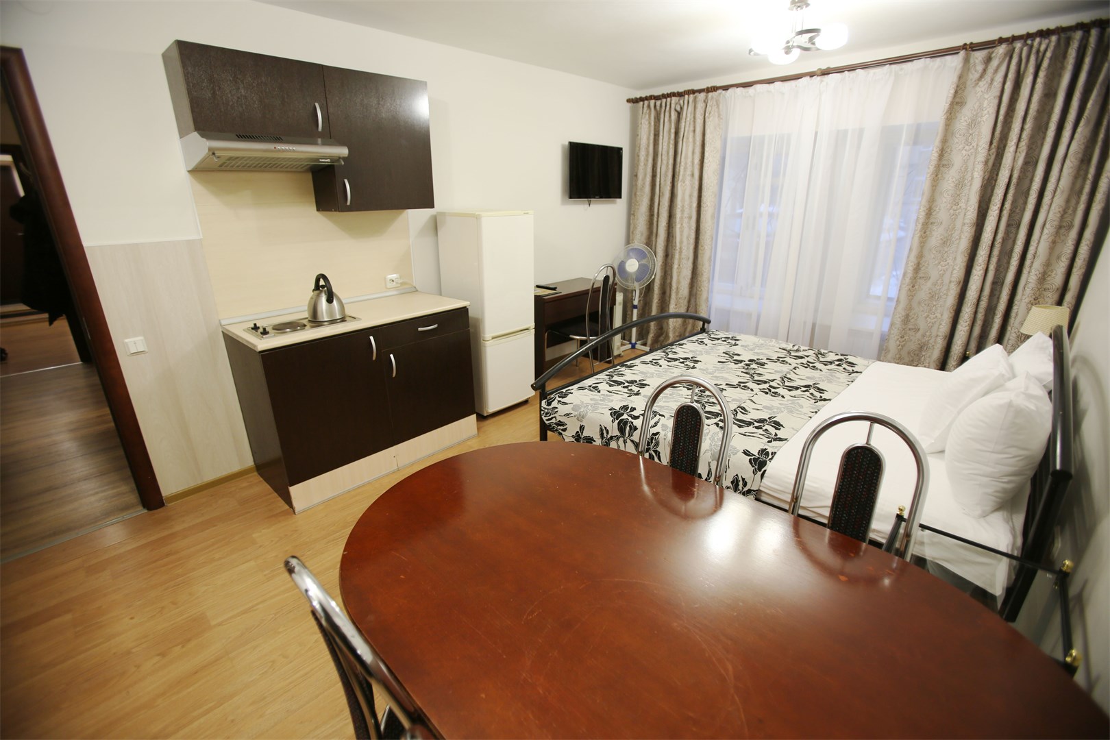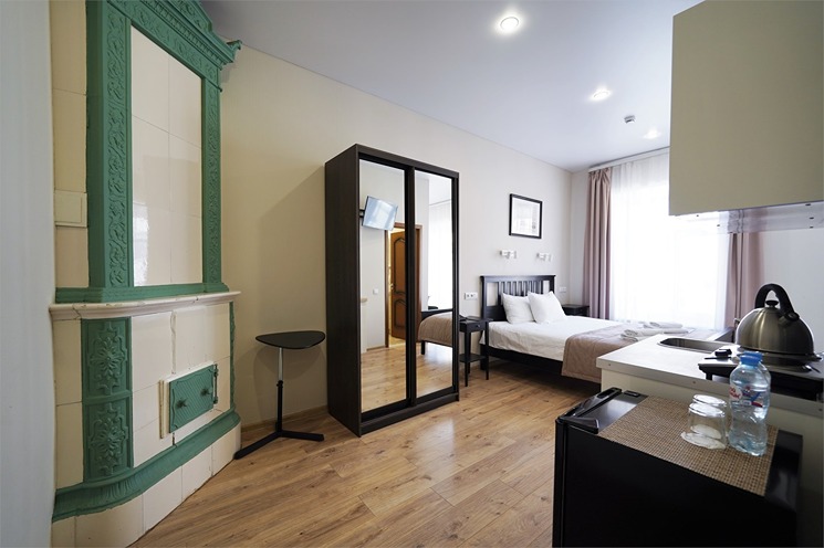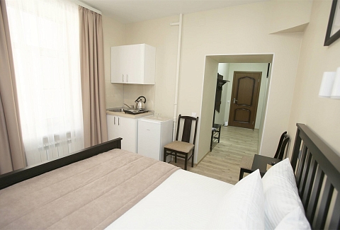 В номере: вешалка, зеркало, кровать двуспальная, прикроватные тумбочки, стол, стулья, шкаф, мини-холодильник, набор посуды, плита электрическая, сейф, телевизор, телефон, электрочайник