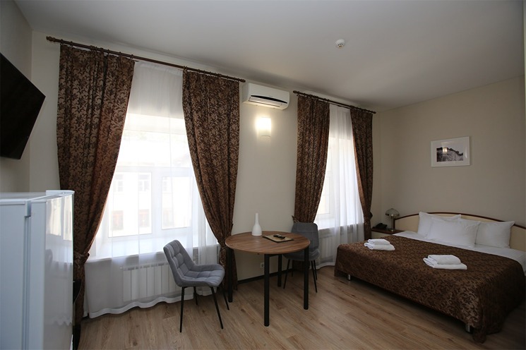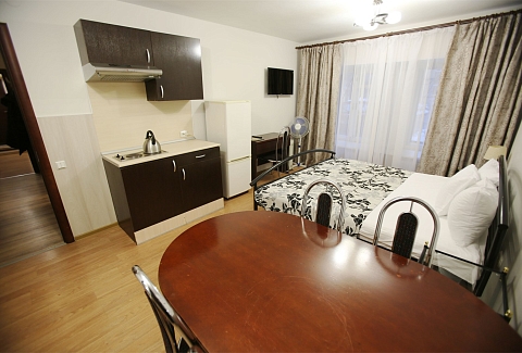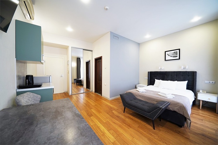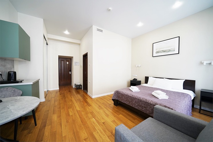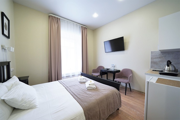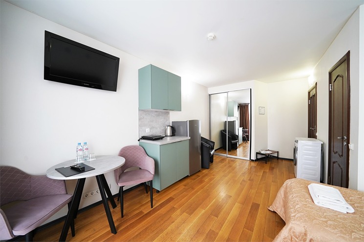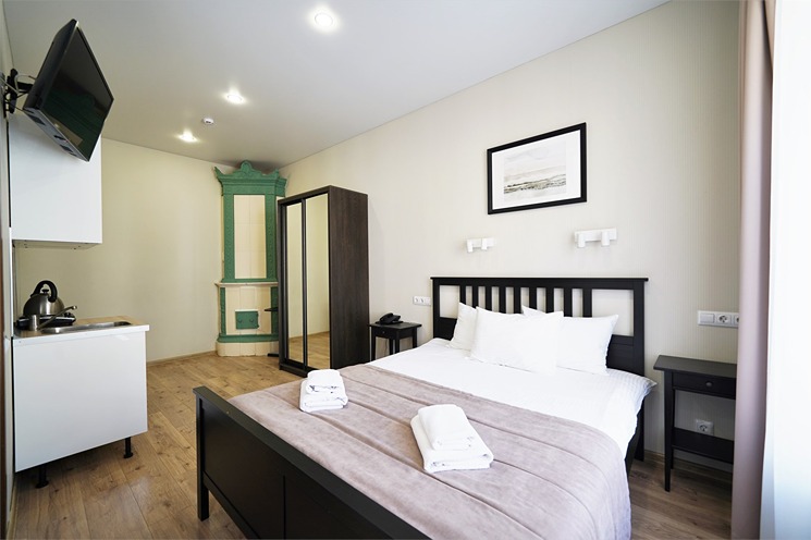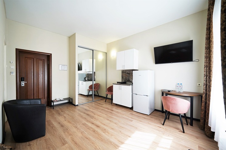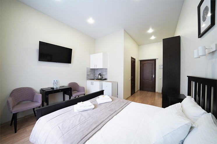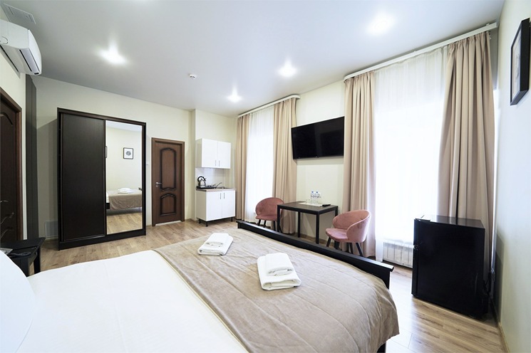 В номере: вешалка, зеркало, кровать двуспальная, прикроватные тумбочки, стол, стулья, шкаф, кондиционер, набор посуды, плита электрическая, сейф, телевизор, телефон, холодильник, чайная станция, электрочайник