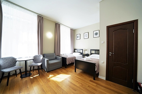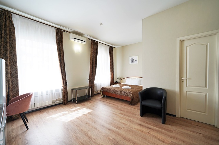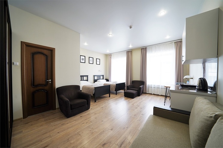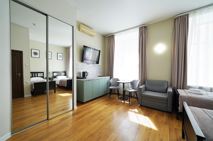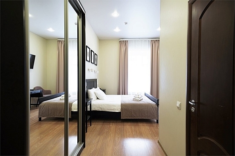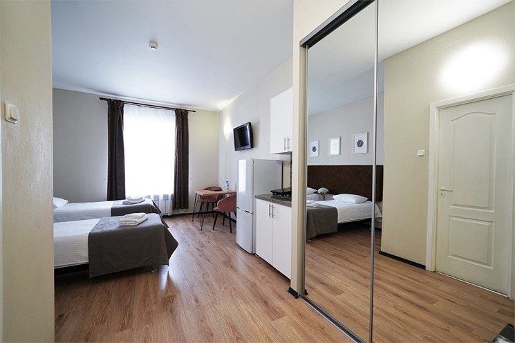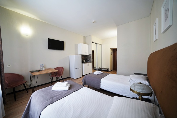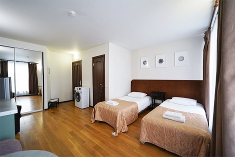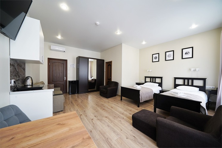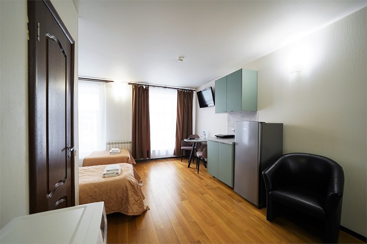 В номере: вешалка, зеркало, кресло-кровать, кровати односпальные, прикроватные тумбочки, стол, стулья, шкаф, кондиционер, набор посуды, плита электрическая, сейф, телевизор, телефон, холодильник, электрочайник