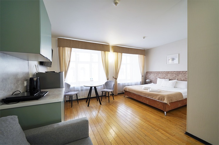 Отель занимает часть пятиэтажного здания, разместившегося в начале улице Гороховой. В распоряжении гостей 58 номеров-апартаментов, оснащенных индивидуальным санузлом и мини-кухней, при этом часть номеров находится в соседнем здании. Все интерьеры выдержаны в приятной пастельной гамме, комнаты укомплектованы необходимой бытовой техникой, везде есть плазменный телевизор, фен и набор косметических принадлежностей в ванной. В здании отеля работает ресторан, где гости могут заказать завтраки, ужины, обеды или перекусить в течение дня. Традиционно отдыхающим доступна парковка и беспроводной интернет.