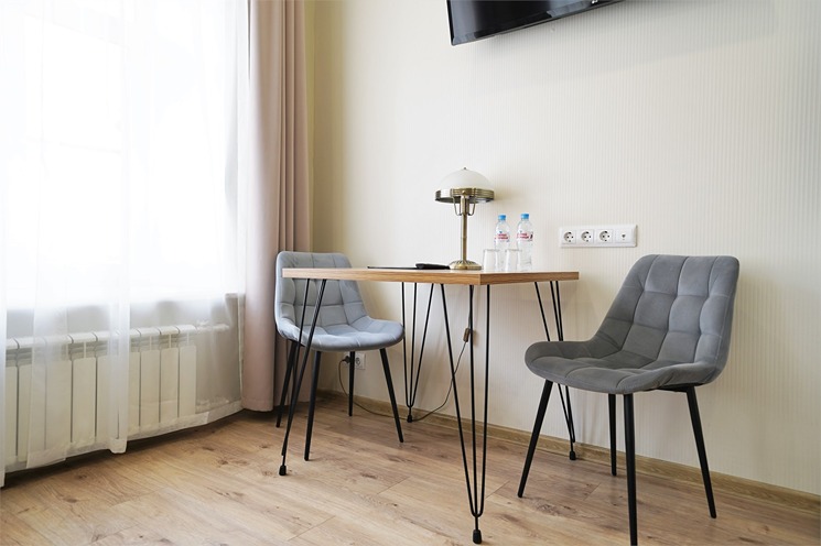 В номере: вешалка, зеркало, кровати односпальные, прикроватные тумбочки, стол, стулья, шкаф, мини-холодильник, набор посуды, плита электрическая, сейф, телевизор, телефон, электрочайник