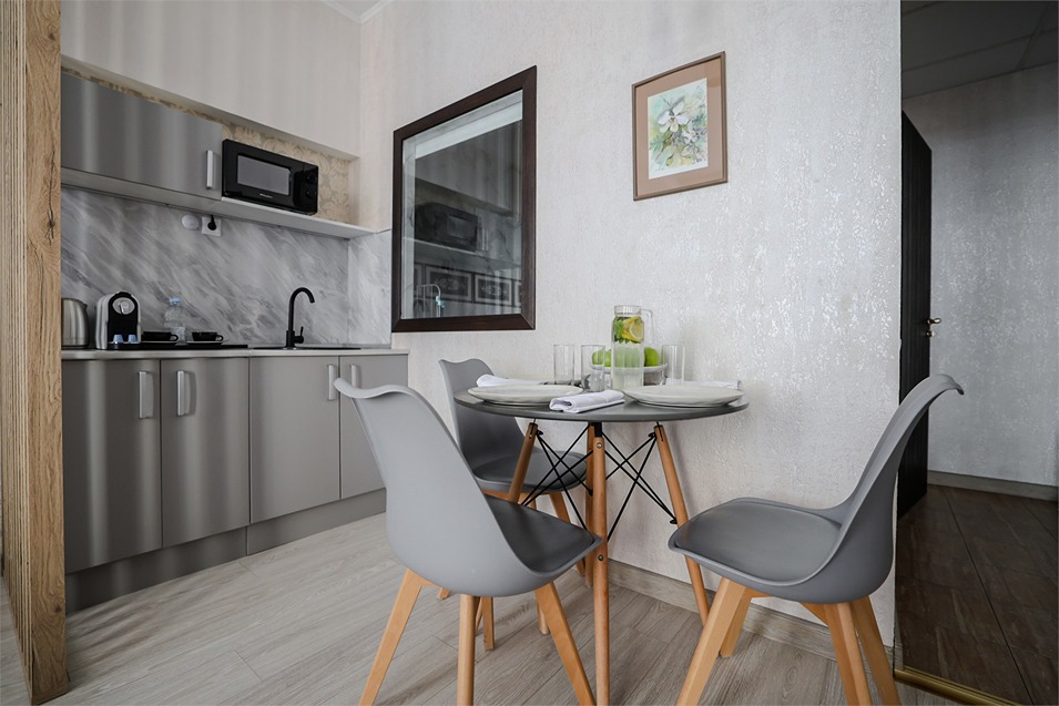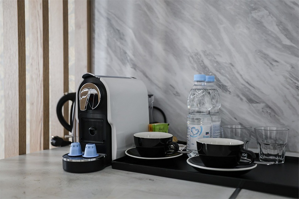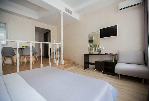 В номере: вешалка, диван раскладной, зеркало, кресло, кровать двуспальная, прикроватные тумбочки, стол, стул, шкаф, кофемашина, микроволновая печь, мини-холодильник, набор посуды, сейф, система общего кондиционирования, стиральная машина, телевизор, телефон, чайная станция, чайный набор посуды