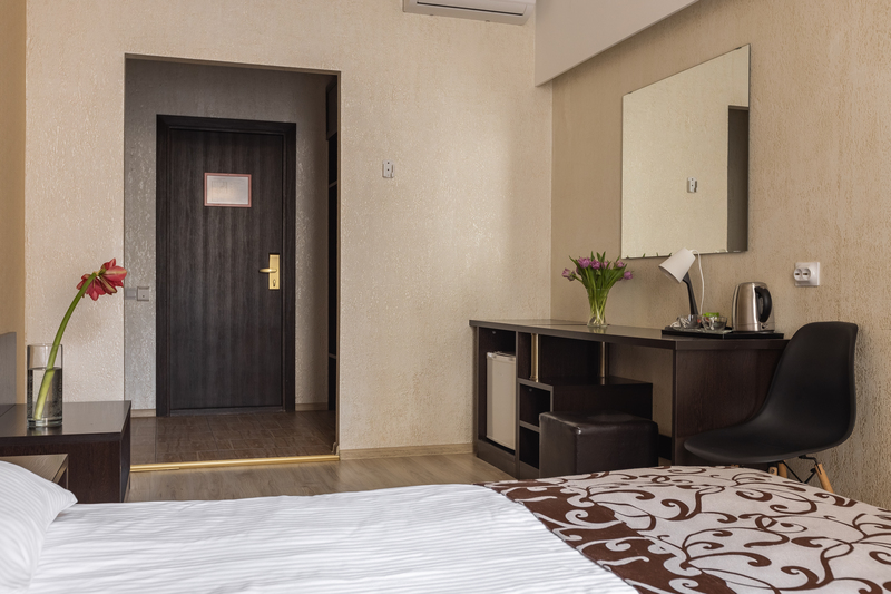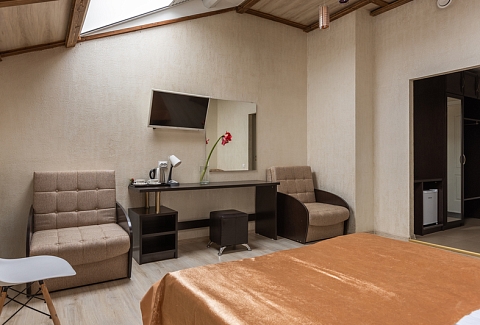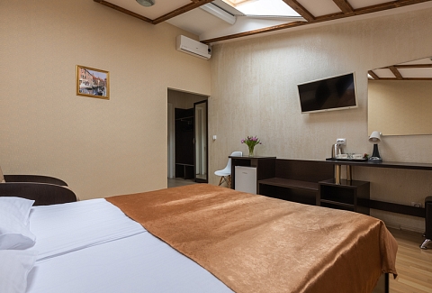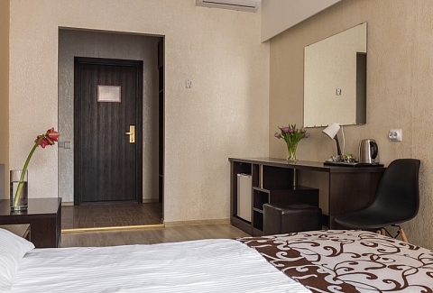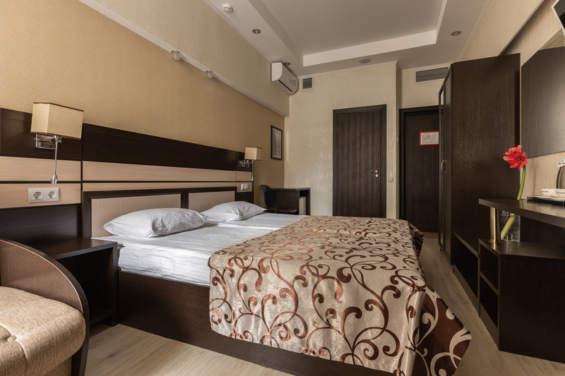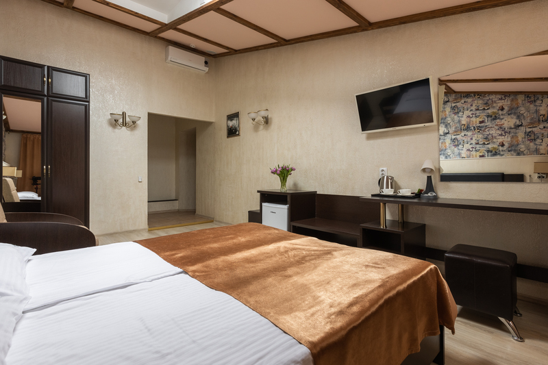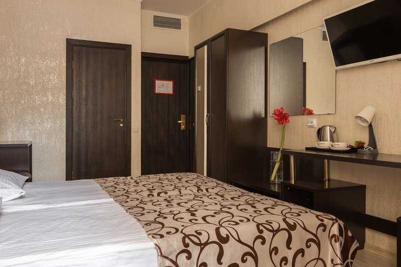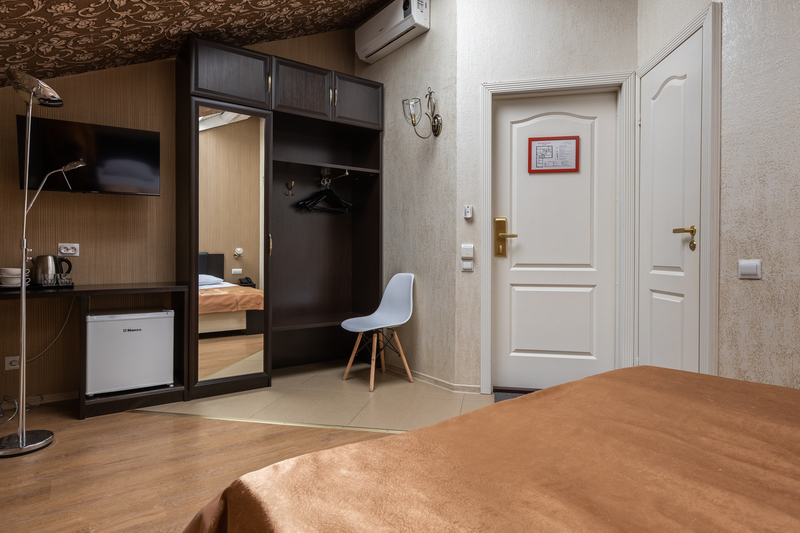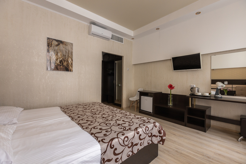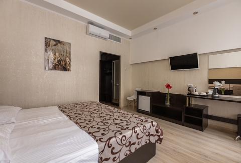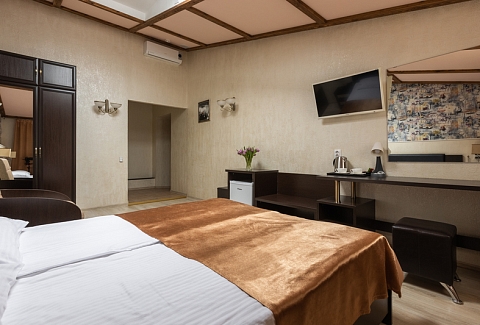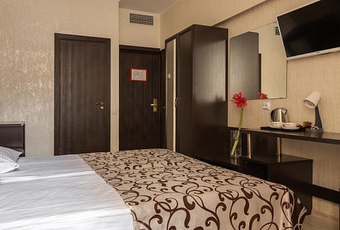 В номере: вешалка, зеркало, кресла, кровать двуспальная, прикроватные тумбочки, стол, шкаф, мини-холодильник, сейф, система общего кондиционирования, телевизор, телефон, чайная станция, чайный набор посуды