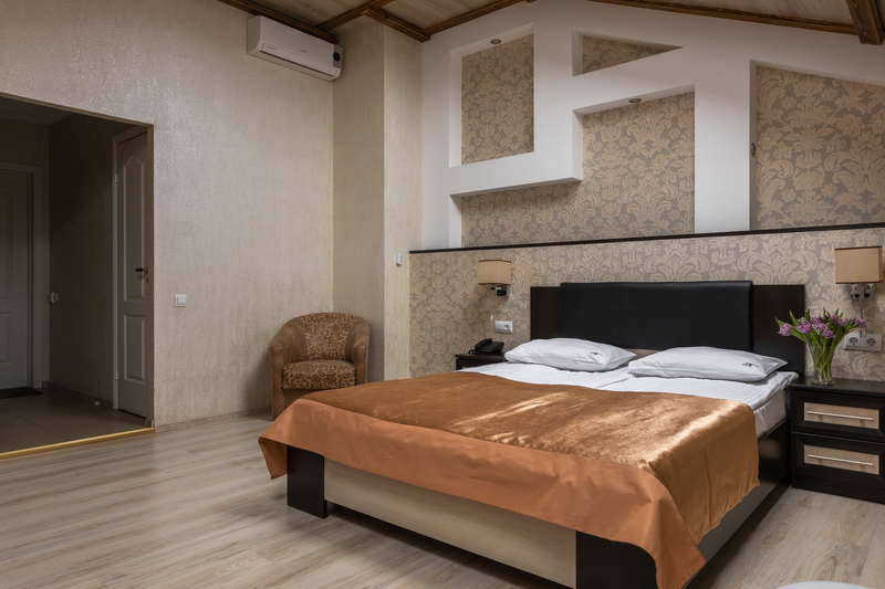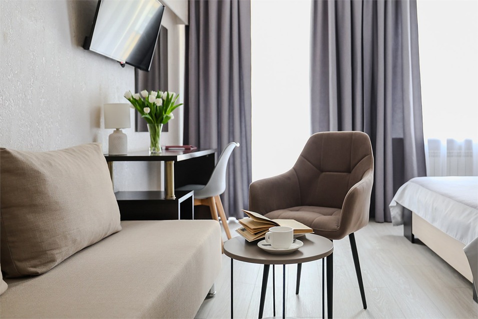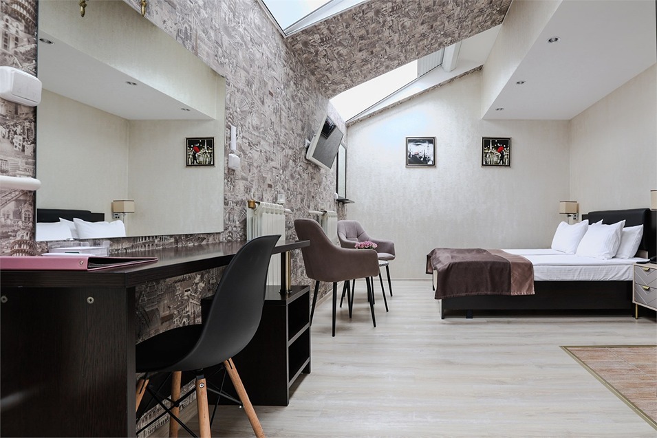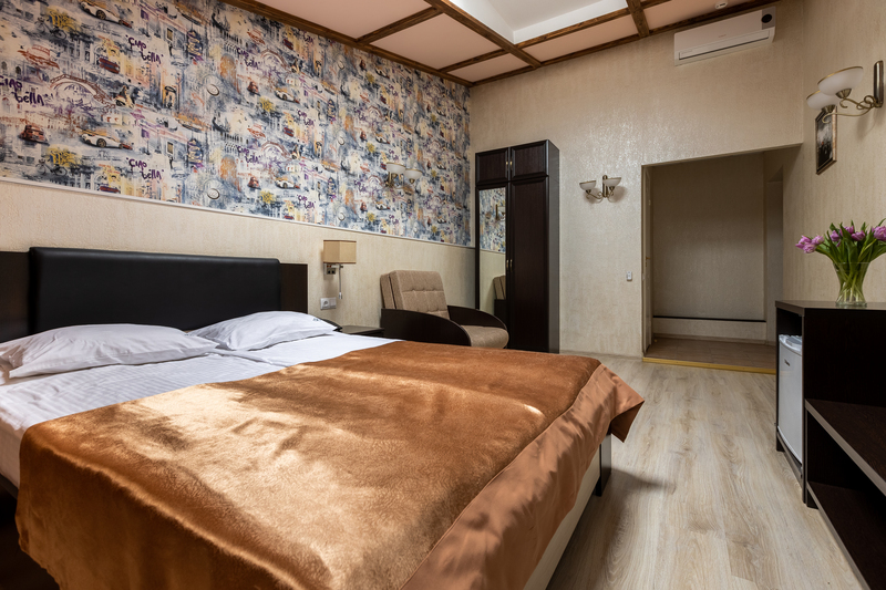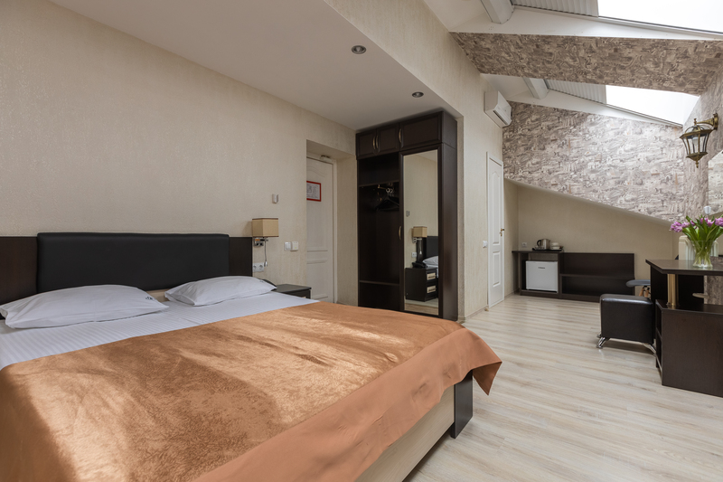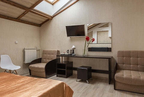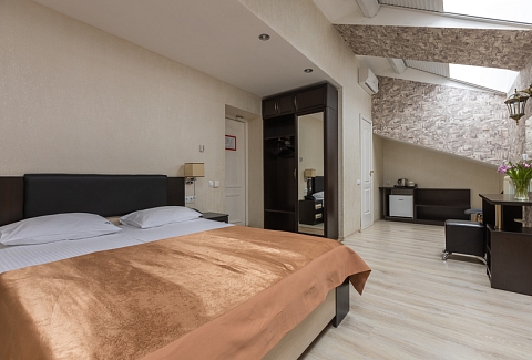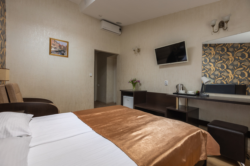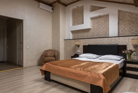 В номере: вешалка, зеркало, кресла, кровать двуспальная, прикроватные тумбочки, стол, шкаф, мини-холодильник, сейф, система общего кондиционирования, телевизор, телефон, чайная станция, чайный набор посуды