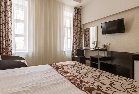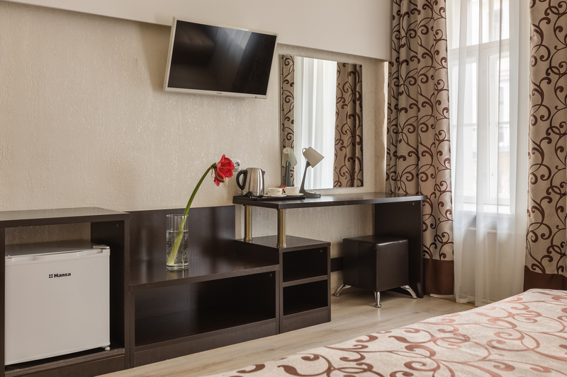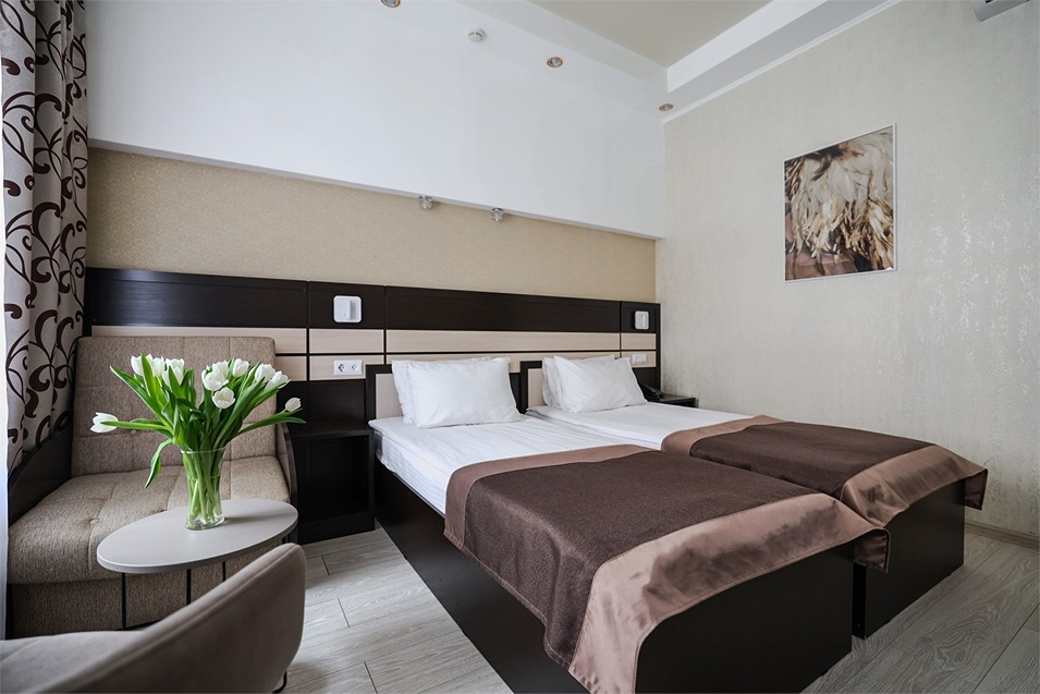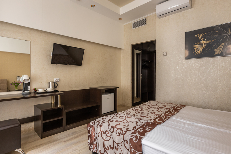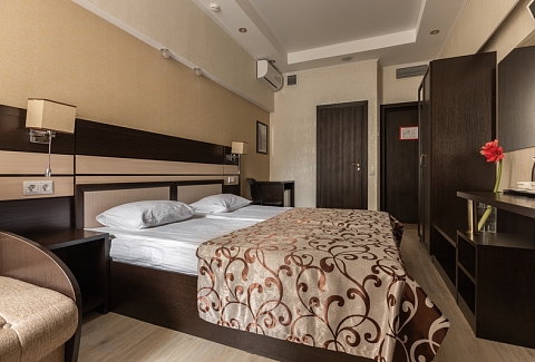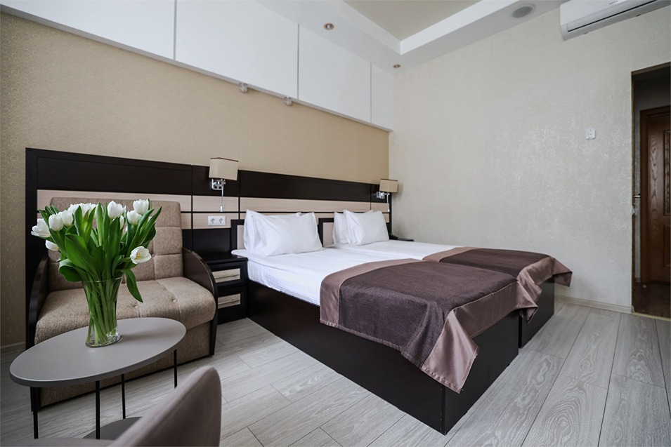 В номере: вешалка, зеркало, кровати односпальные /одна двуспальная кровать, прикроватные тумбочки, стол, стул, шкаф, мини-холодильник, сейф, система общего кондиционирования, телевизор, телефон, чайная станция, чайный набор посуды