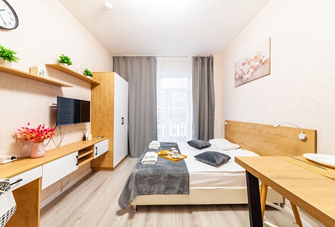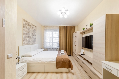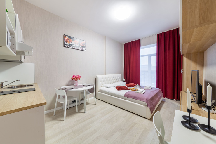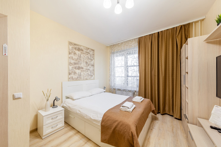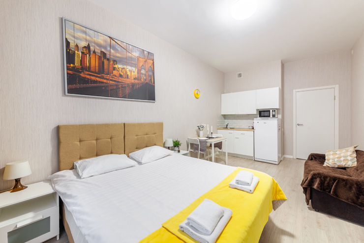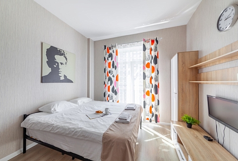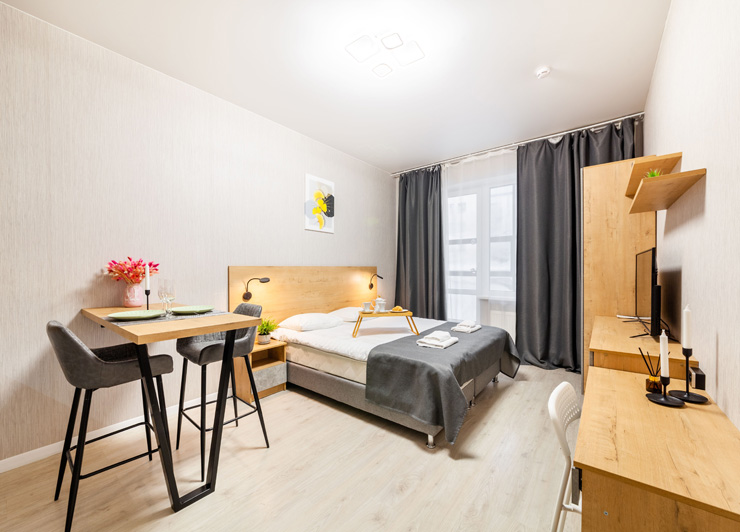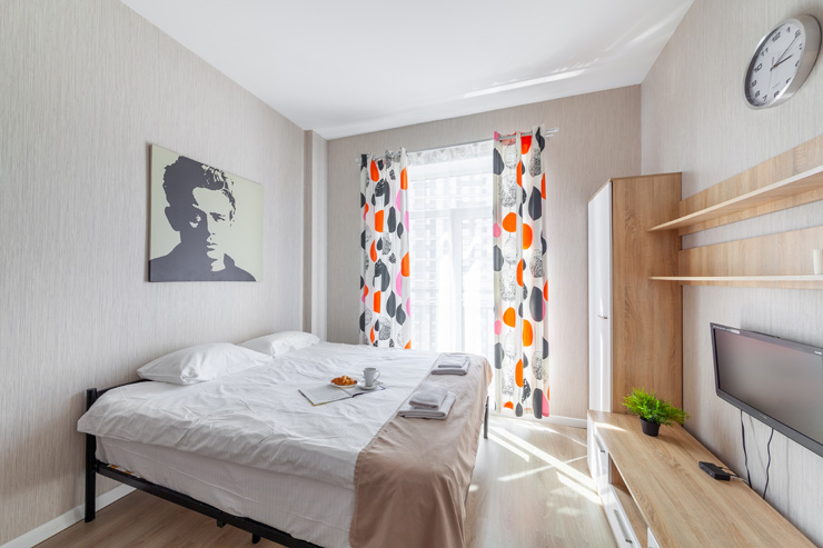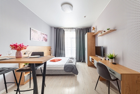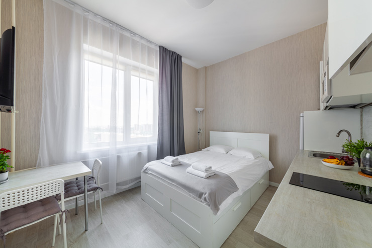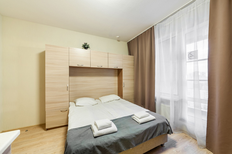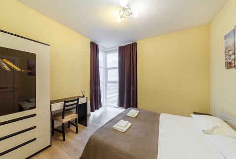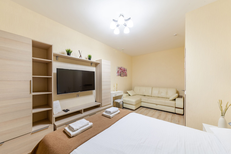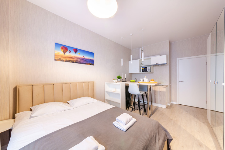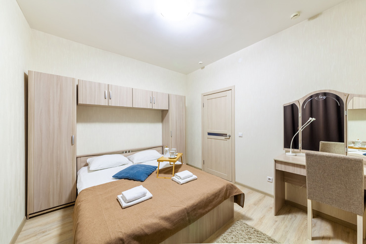 В номере: вешалка, диван раскладной, зеркало, кровать двуспальная, стол, стулья, шкаф, микроволновая печь, набор посуды, плита электрическая, стиральная машина, телевизор, утюг, холодильник, электрочайник
