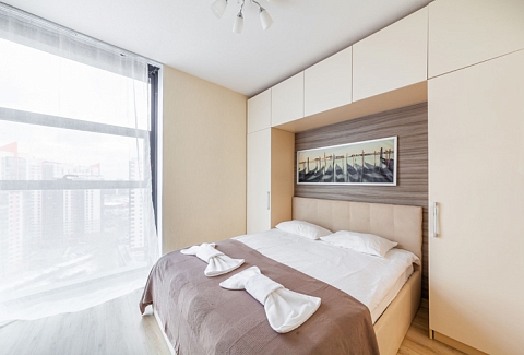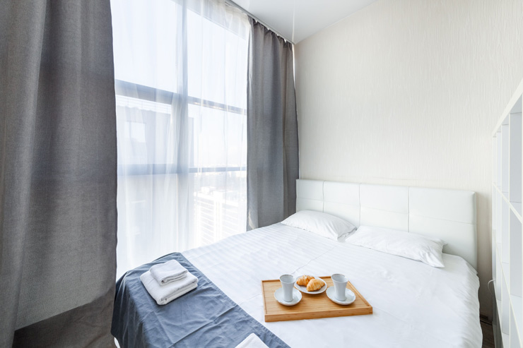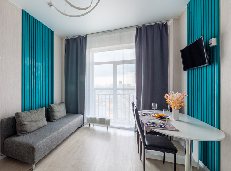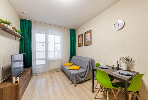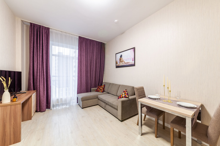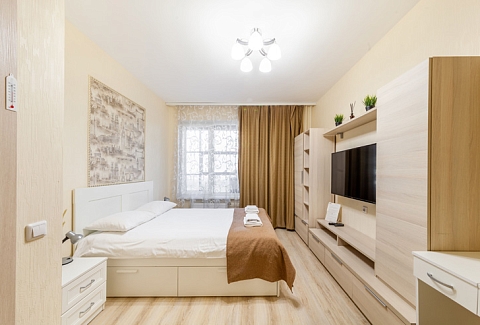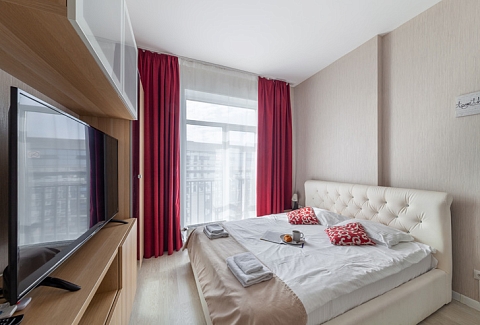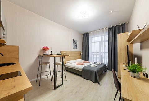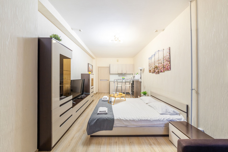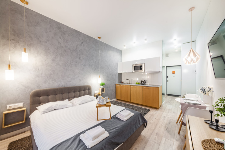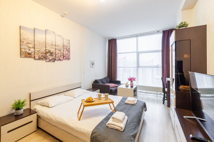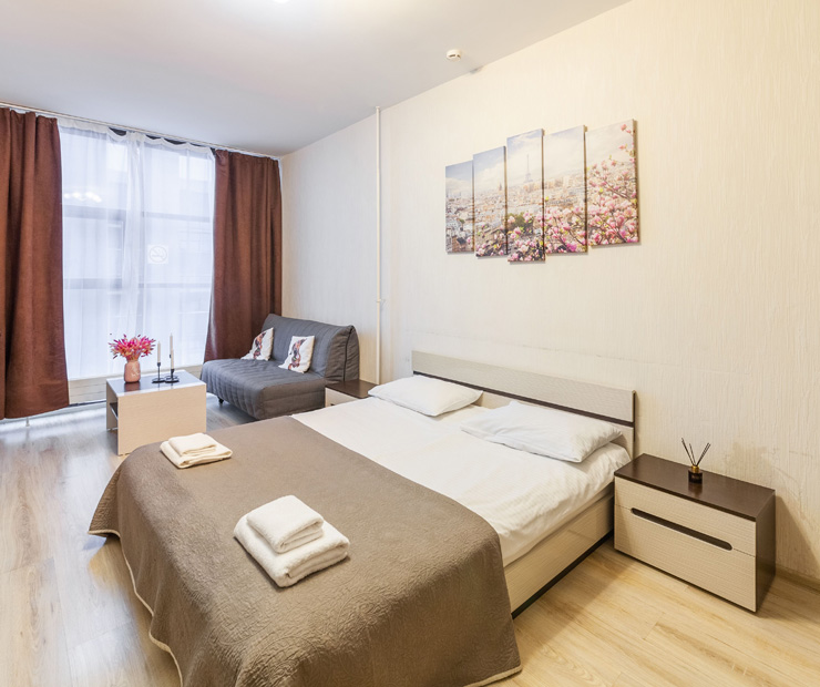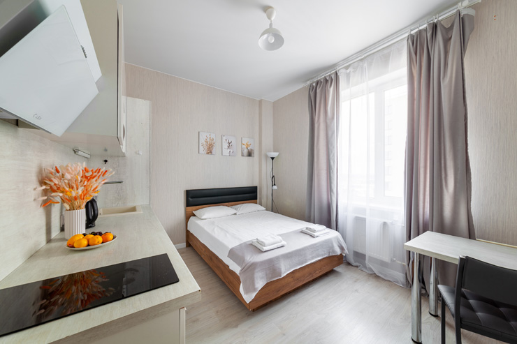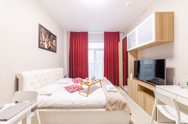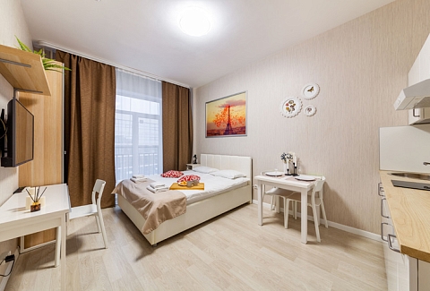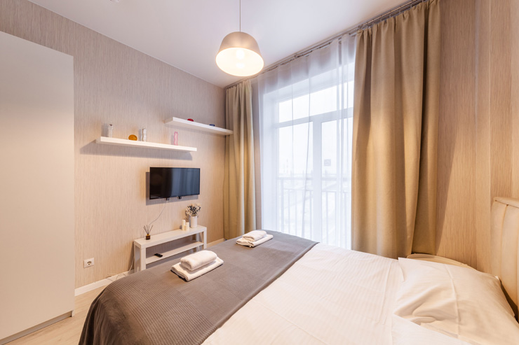 В номере: вешалка, диван раскладной, зеркало, кровать двуспальная, стол, стулья, шкаф, микроволновая печь, набор посуды, плита электрическая, стиральная машина, телевизор, утюг, холодильник, электрочайник