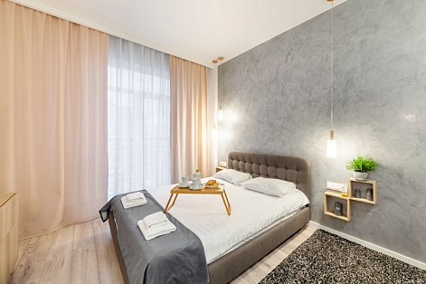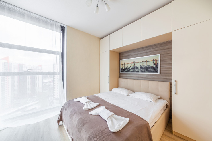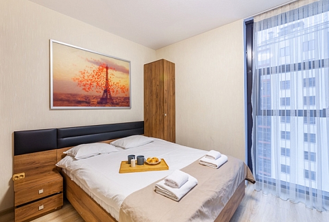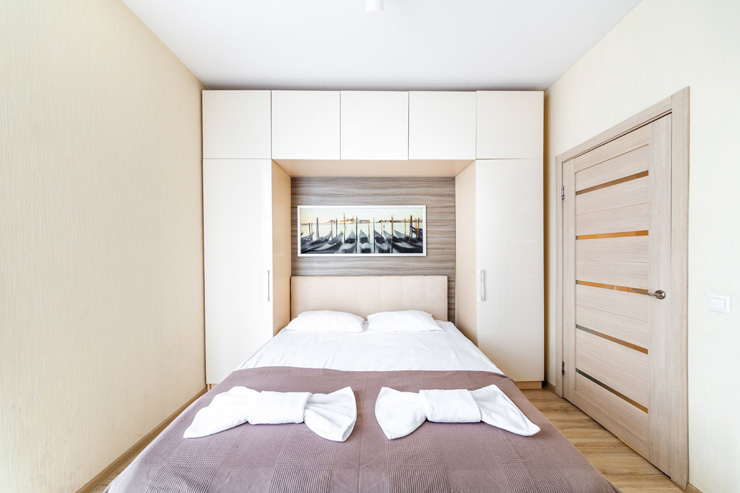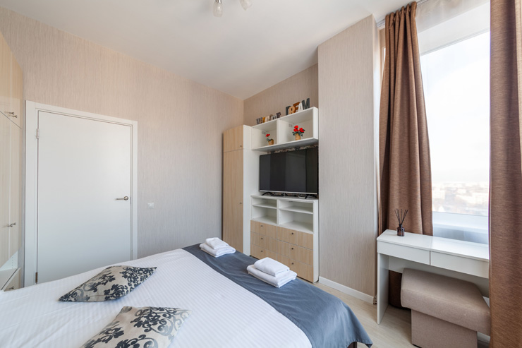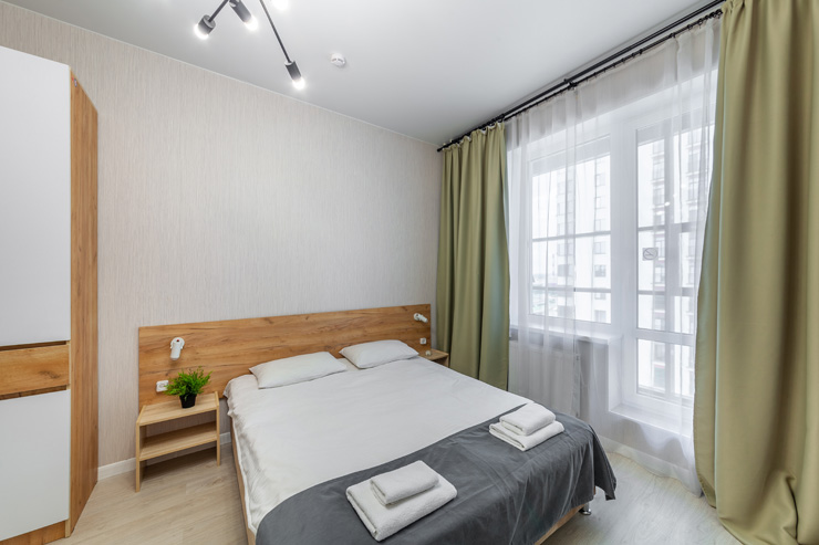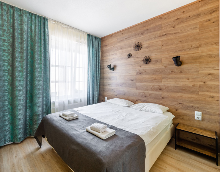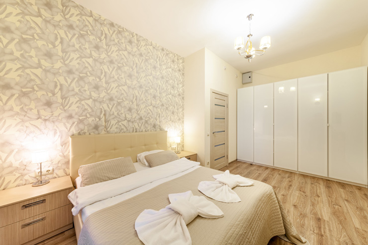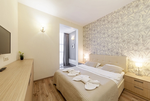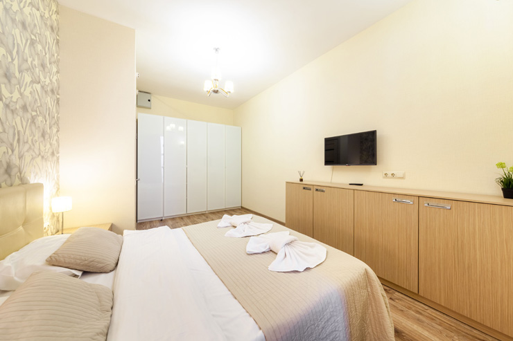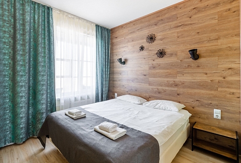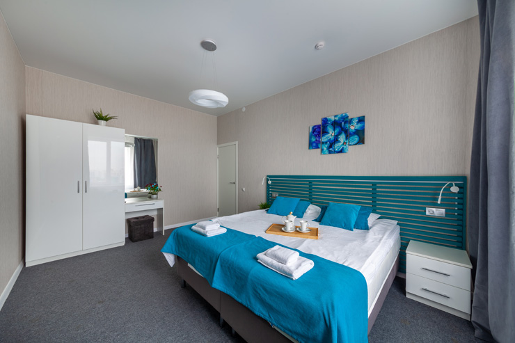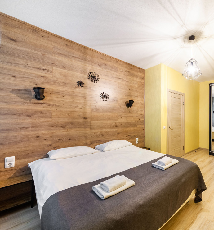 В номере: вешалка, диван раскладной, зеркало, кровать двуспальная, прикроватные тумбочки, стол, стулья, шкаф, микроволновая печь, набор посуды, плита электрическая, стиральная машина, телевизор, утюг, холодильник, электрочайник