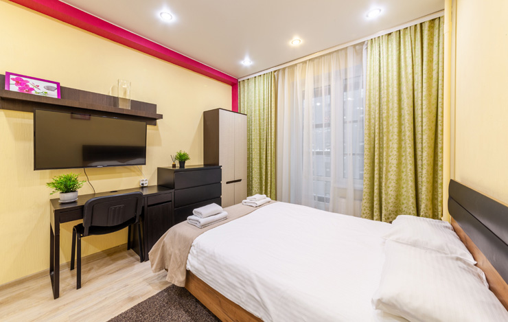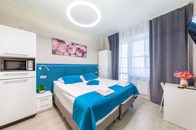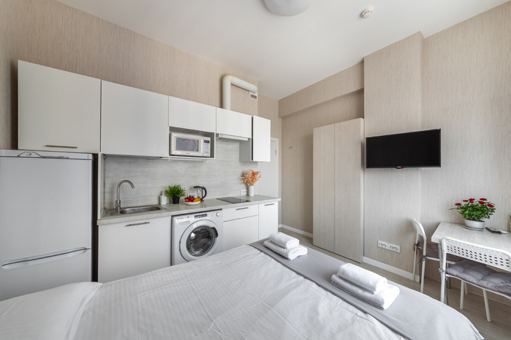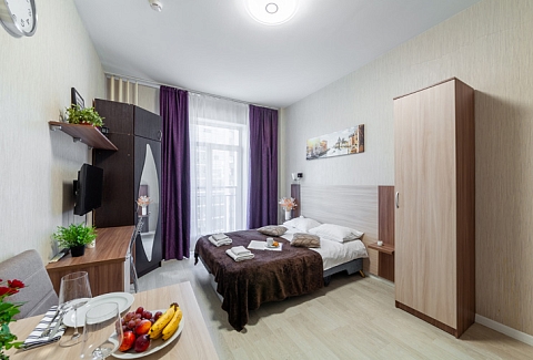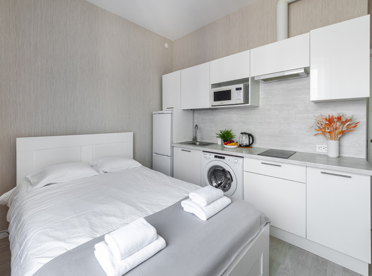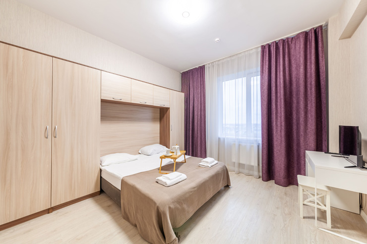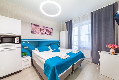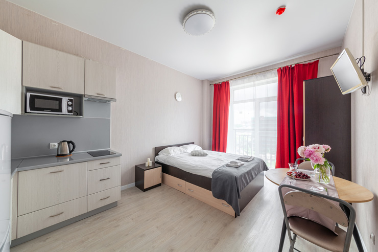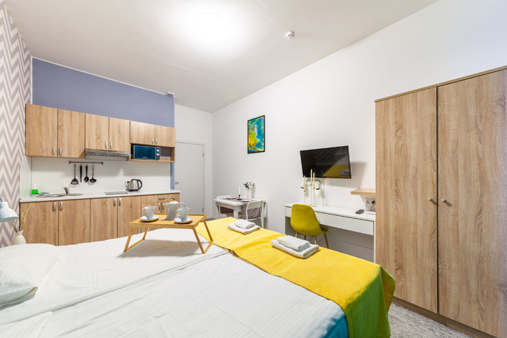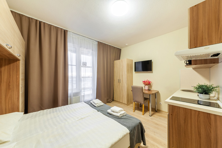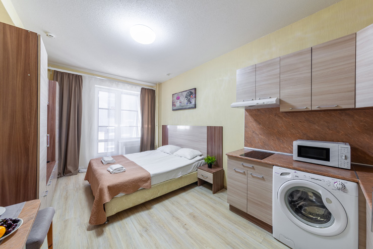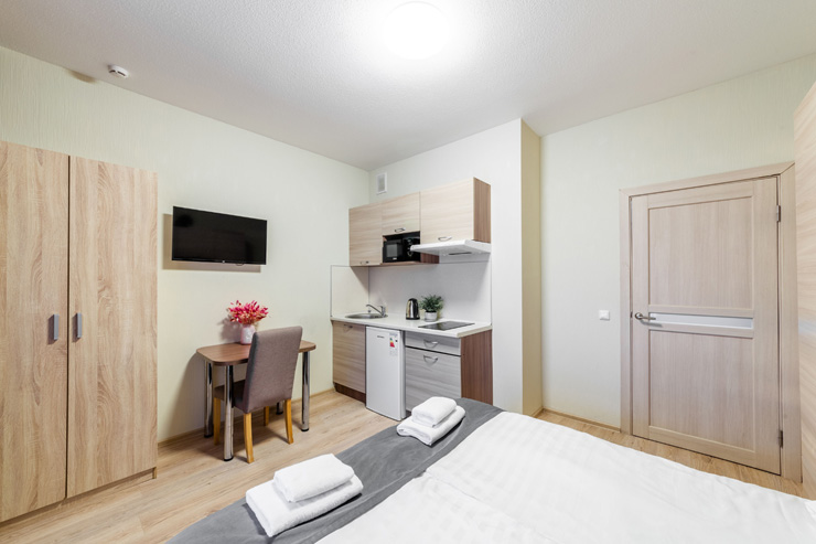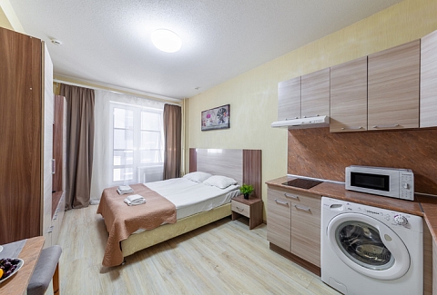В номере: вешалка, диван, зеркало, кровать двуспальная, стол, стулья, шкаф, микроволновая печь, набор посуды, плита электрическая, стиральная машина, телевизор, утюг, холодильник, электрочайник