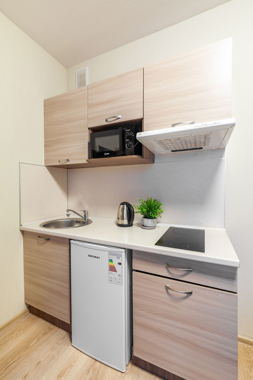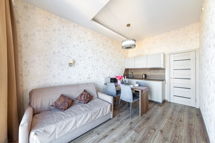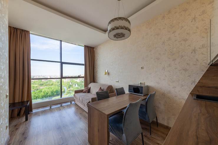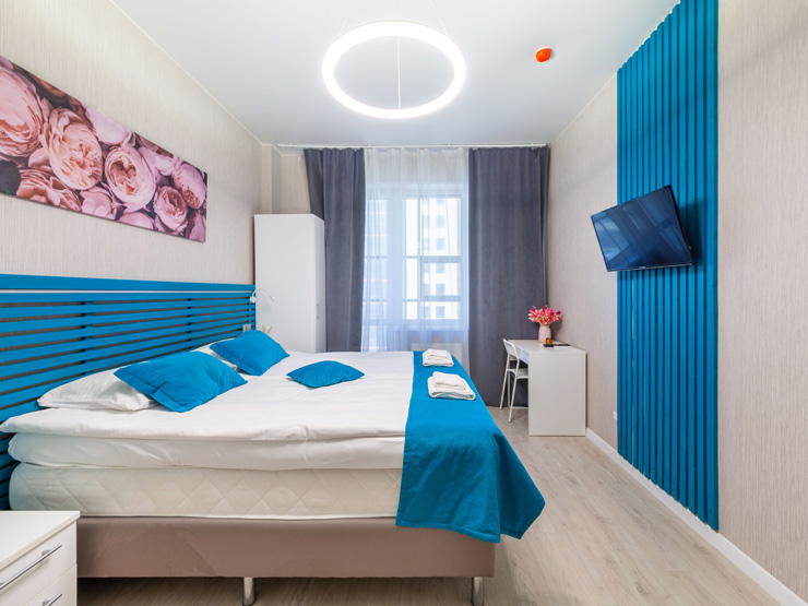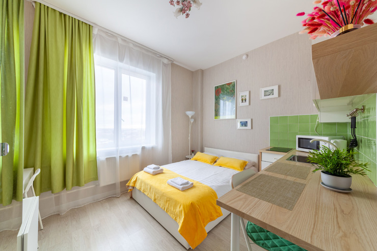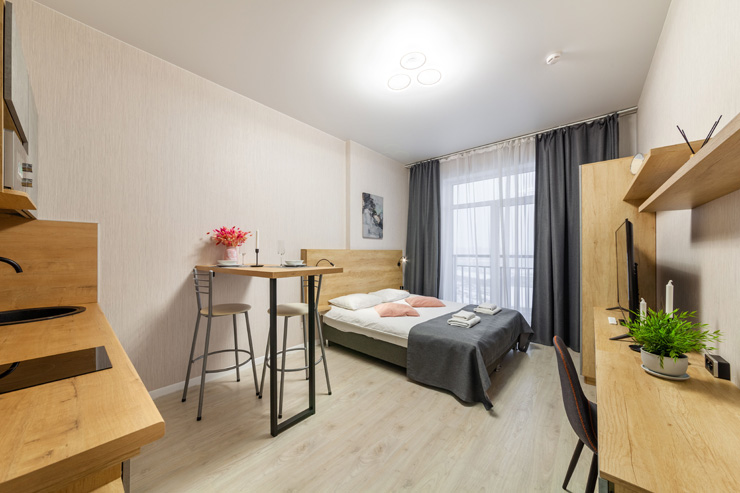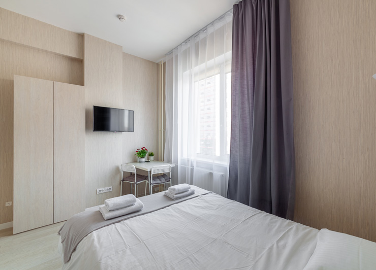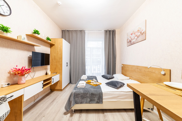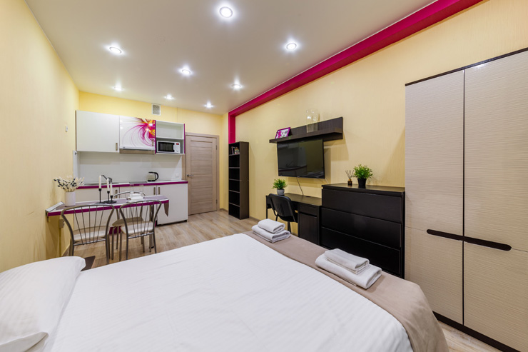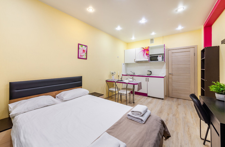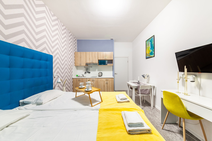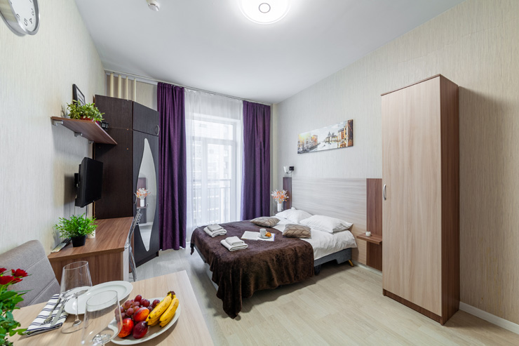 В номере: вешалка, диван, зеркало, кровать двуспальная, стол, стулья, шкаф, микроволновая печь, набор посуды, плита электрическая, стиральная машина, телевизор, утюг, холодильник, электрочайник