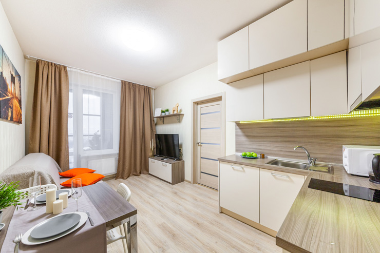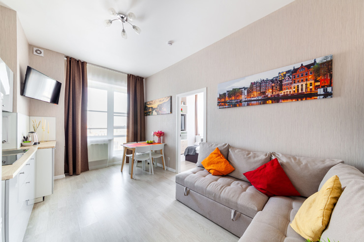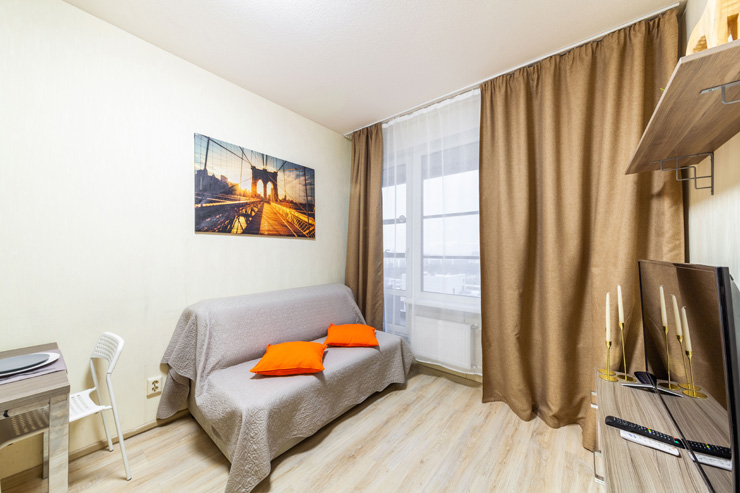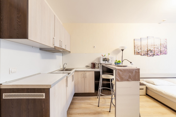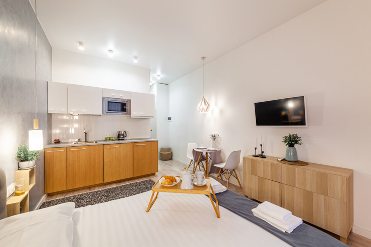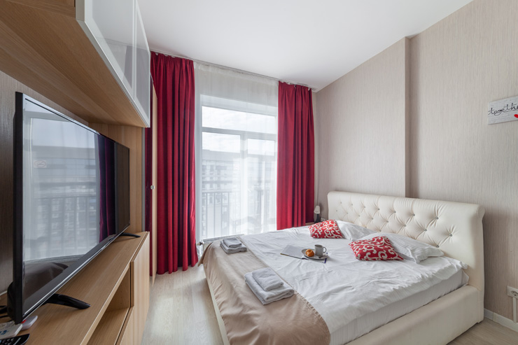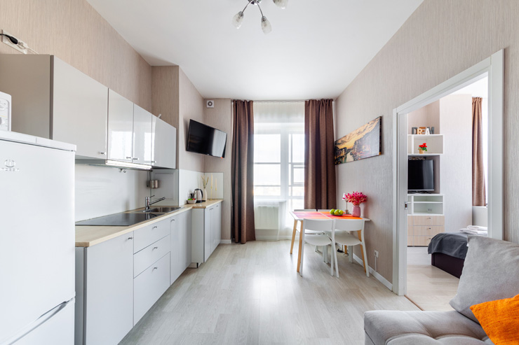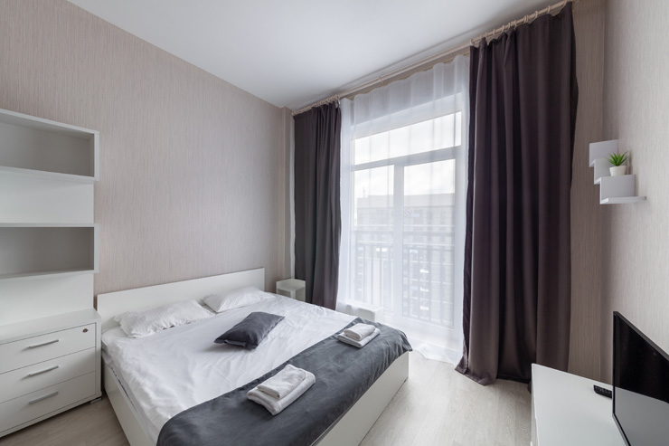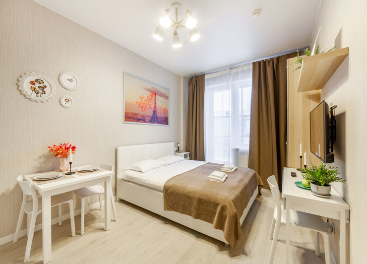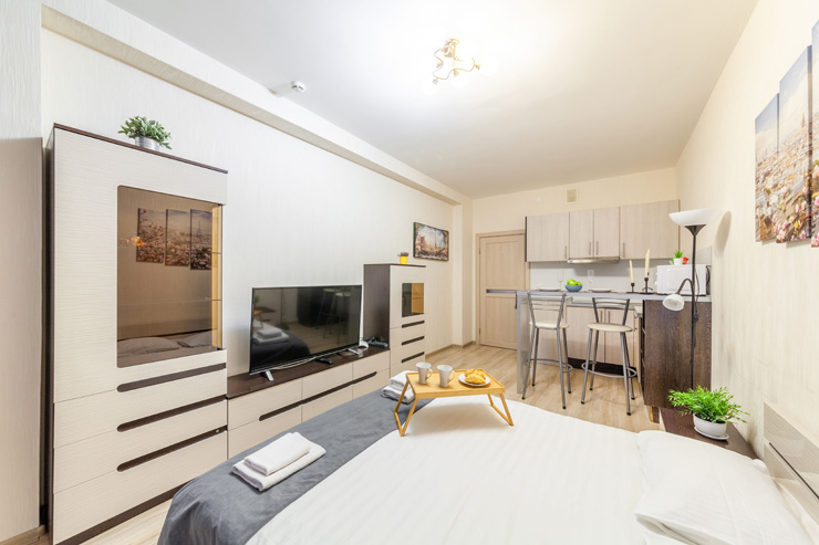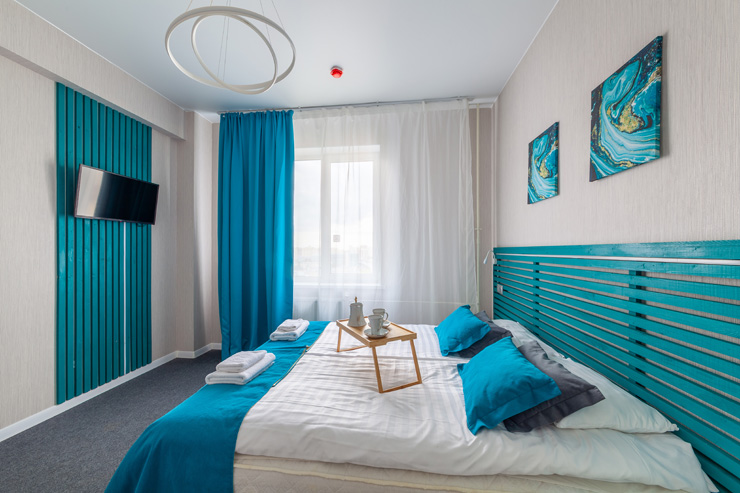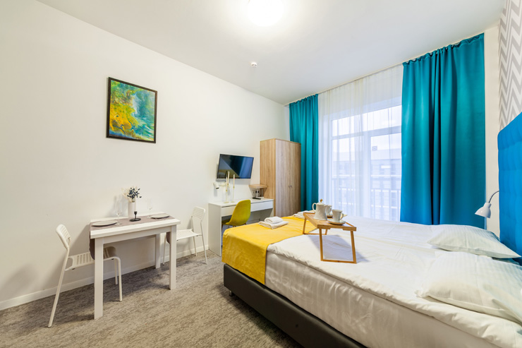 В номере: вешалка, диван, зеркало, кровать двуспальная, стол, стулья, шкаф, микроволновая печь, набор посуды, плита электрическая, стиральная машина, телевизор, утюг, холодильник, электрочайник