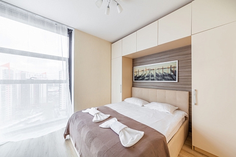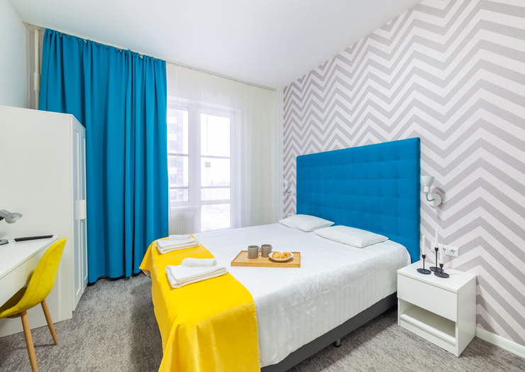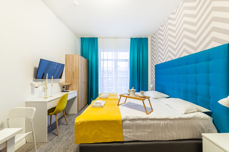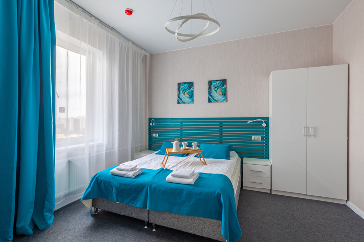 В номере: вешалка, зеркало, кресло-кровать, кровать двуспальная, прикроватные тумбочки, стол, стулья, шкаф, микроволновая печь, набор посуды, плита электрическая, стиральная машина, телевизор, утюг, холодильник, электрочайник