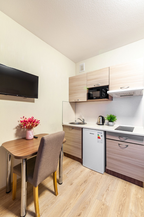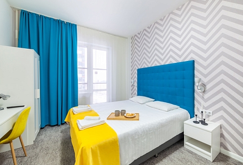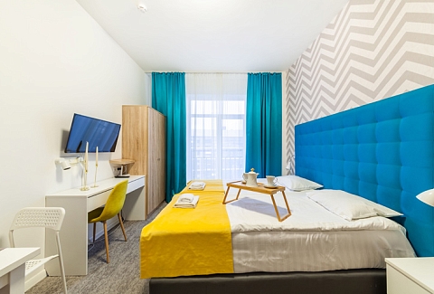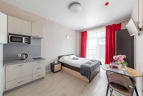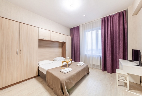 В номере: вешалка, зеркало, кровать двуспальная, стол, стул, шкаф, микроволновая печь, мини-холодильник, набор посуды, плита электрическая, стиральная машина, телевизор, утюг, электрочайник