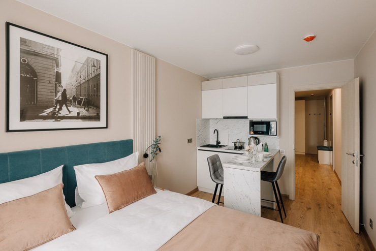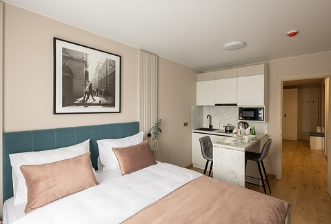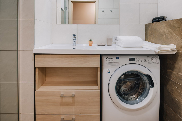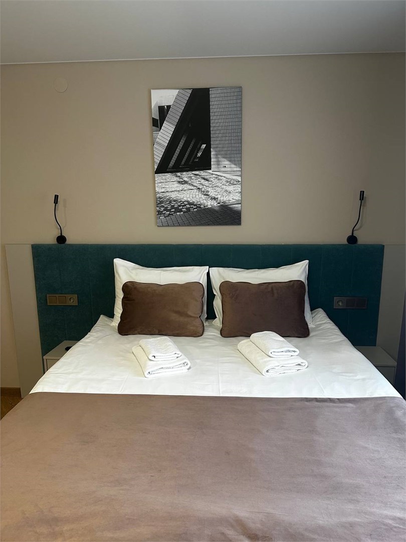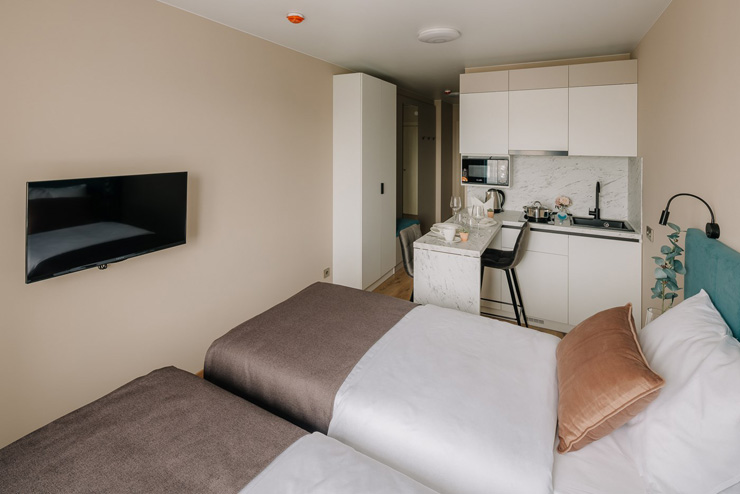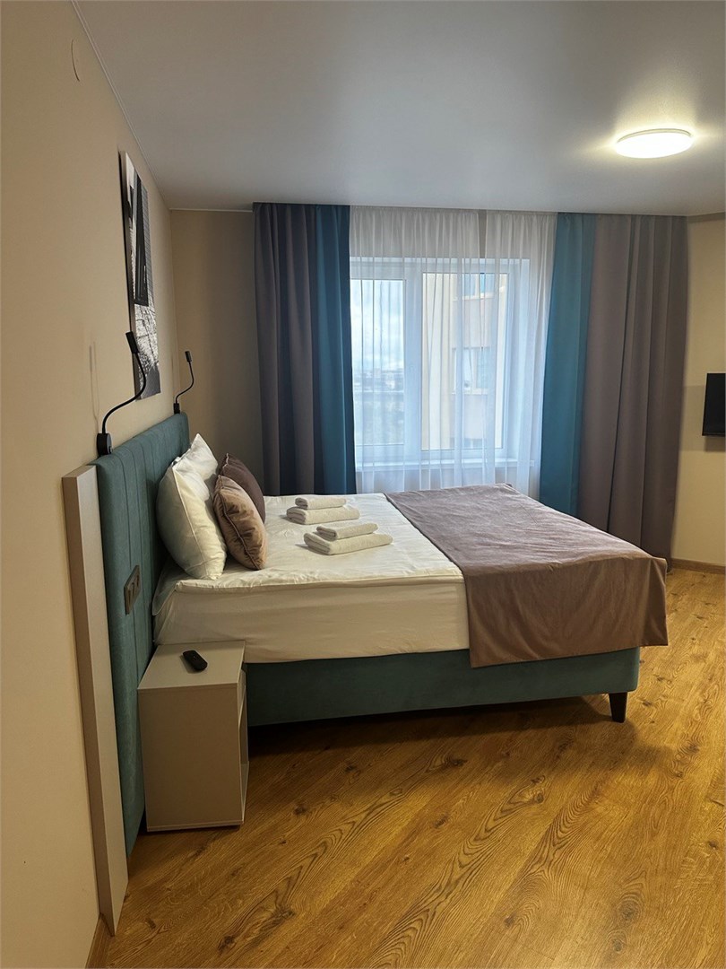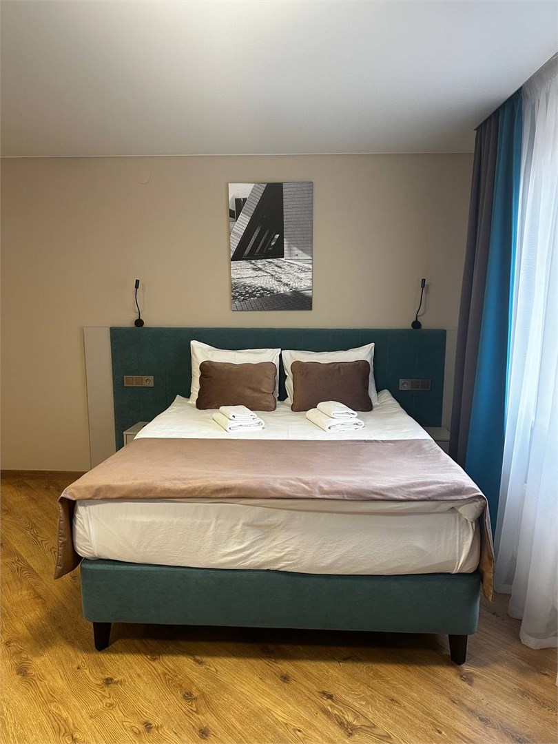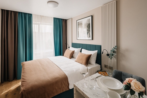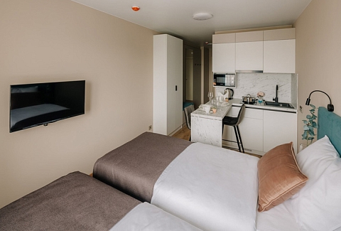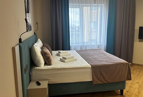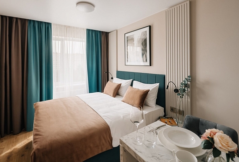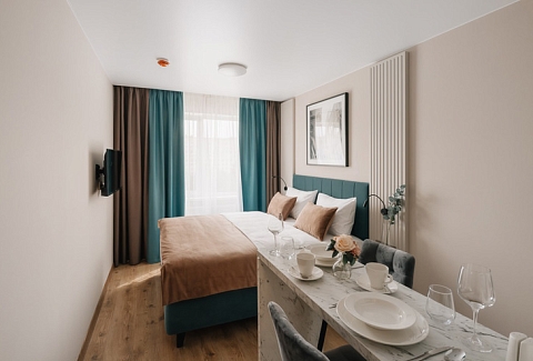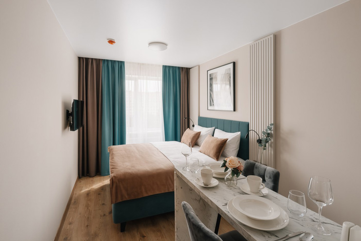 В номере: вешалка, зеркало, кровать двуспальная, прикроватные тумбочки, стол, стулья, шкаф, микроволновая печь, мини-холодильник, набор посуды, плита электрическая, стиральная машина, телевизор, электрочайник
