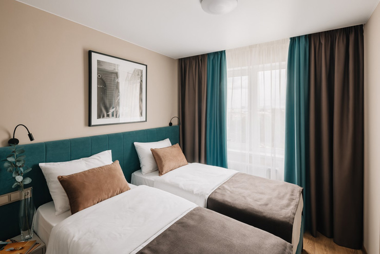 В номере: вешалка, зеркало, кровати односпальные /одна двуспальная кровать, прикроватные тумбочки, стол, стулья, шкаф, микроволновая печь, набор посуды, плита электрическая, сейф, стиральная машина, телевизор, холодильник, электрочайник