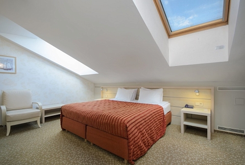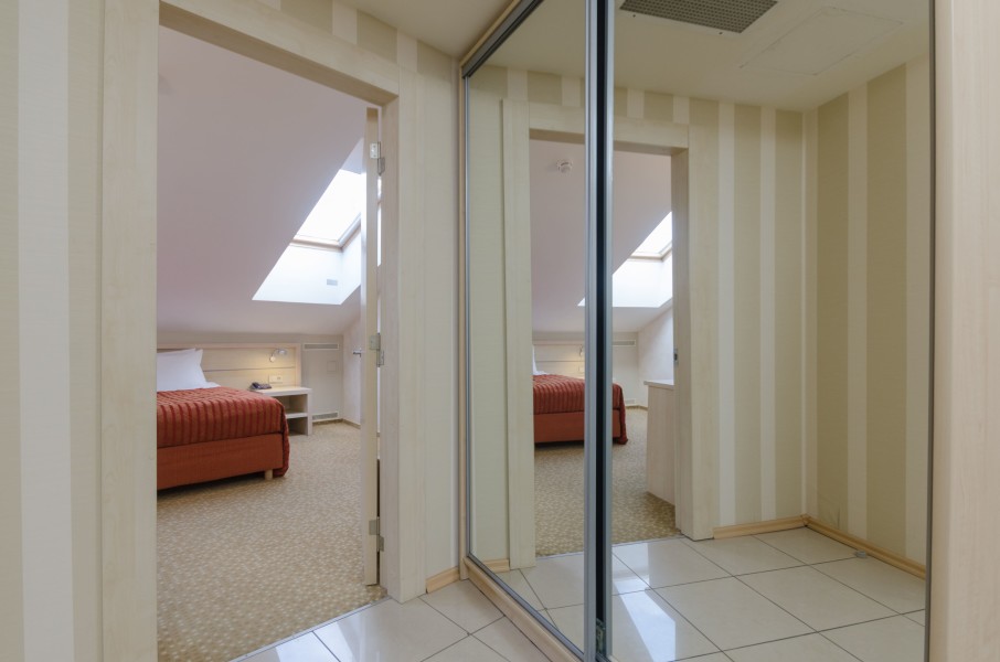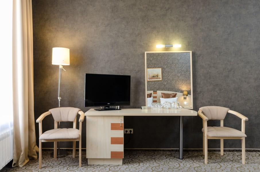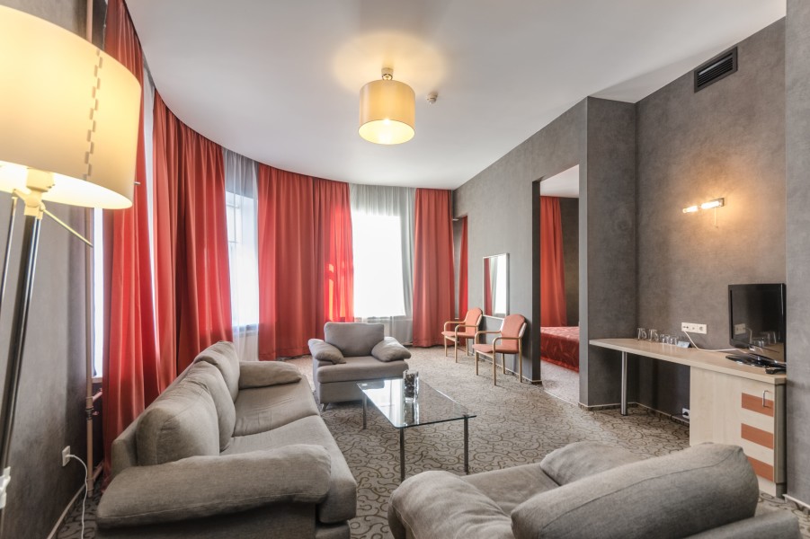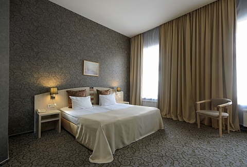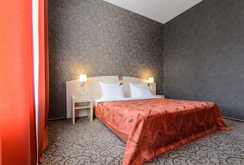 В номере: зеркало, ковровое покрытие, кровать двуспальная, набор мягкой мебели, прикроватные тумбочки, стол, стулья, шкаф, кондиционер, мини-холодильник, сейф, телевизор, телефон