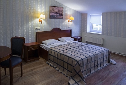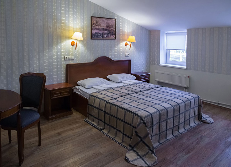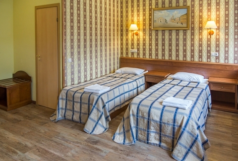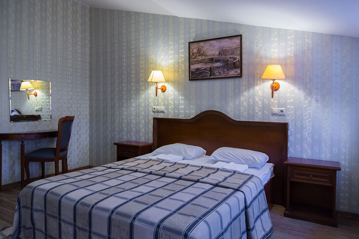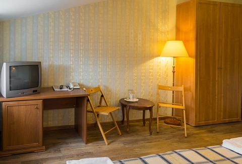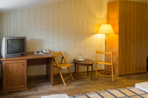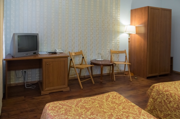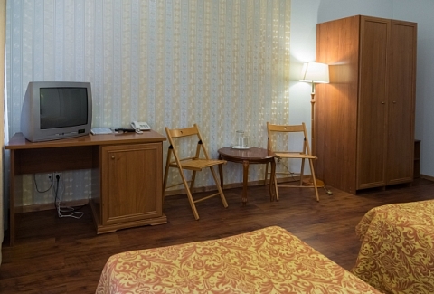 В номере: кровать двуспальная/ две полутороспальные кровати, прикроватные тумбочки, стол, стулья, шкаф, мини-холодильник, телевизор, телефон