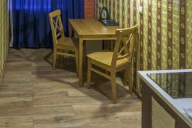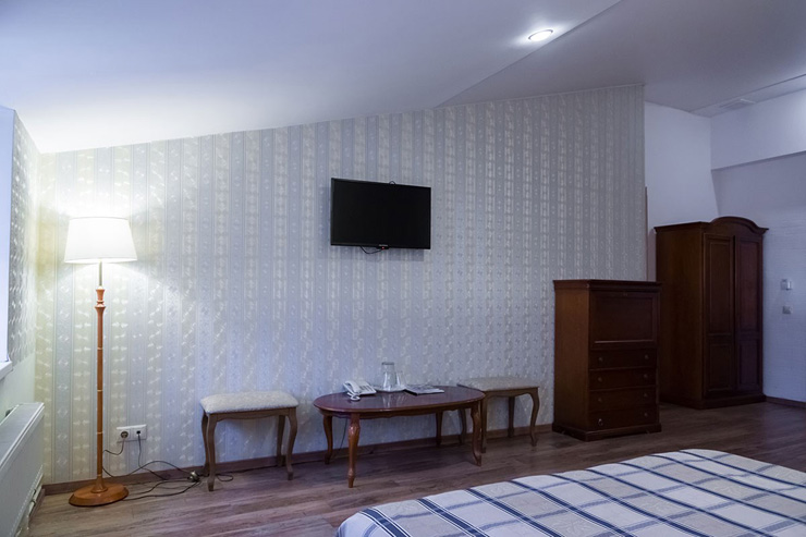В номере: вешалка, зеркало, кровать двуспальная, прикроватные тумбочки, стол, столик журнальный, стул, тахта, шкаф, мини-холодильник, сейф, телевизор, телефон, чайный набор посуды, электрочайник