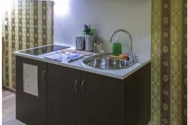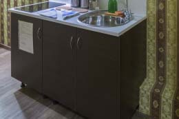 В номере: кровать двуспальная, прикроватные тумбочки, стол, стулья, шкаф, мини-холодильник, сейф, телевизор, чайный набор посуды
