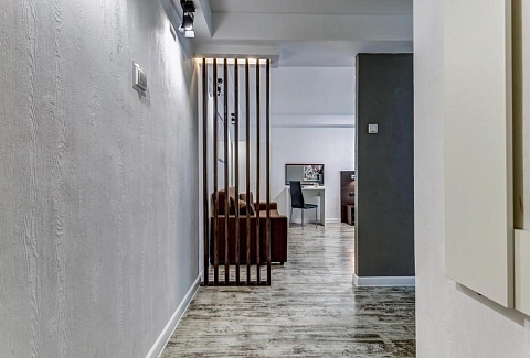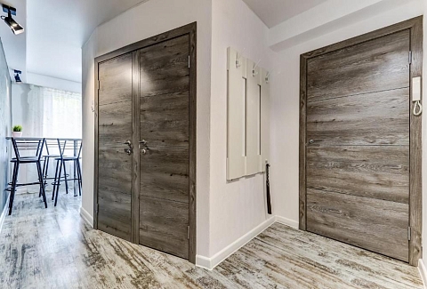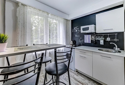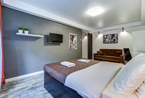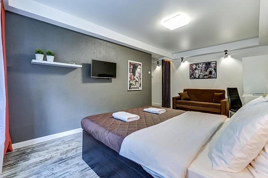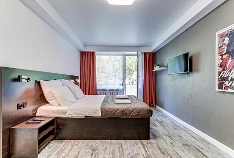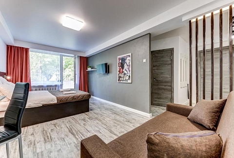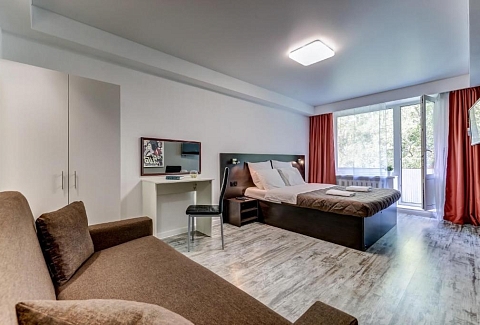 В номере: вешалка, диван раскладной, зеркало, кровать двуспальная, прикроватные тумбочки, стол, стол для компьютера, стул, стулья, шкаф, гладильная доска, микроволновая печь, мини-холодильник, набор посуды, плита электрическая, стиральная машина, сушилка для белья, телевизор, утюг, чайный набор посуды, электрочайник
