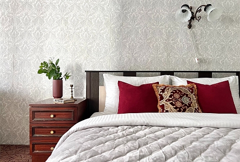 В номере: вешалка, диван, диван раскладной, зеркало, кровати односпальные, кровать двуспальная, стеллаж, стол, стулья, шкаф, гладильная доска, духовой шкаф, микроволновая печь, набор посуды, плита газовая, стиральная машина, сушилка для белья, телевизор, утюг, холодильник, чайник, чайный набор посуды