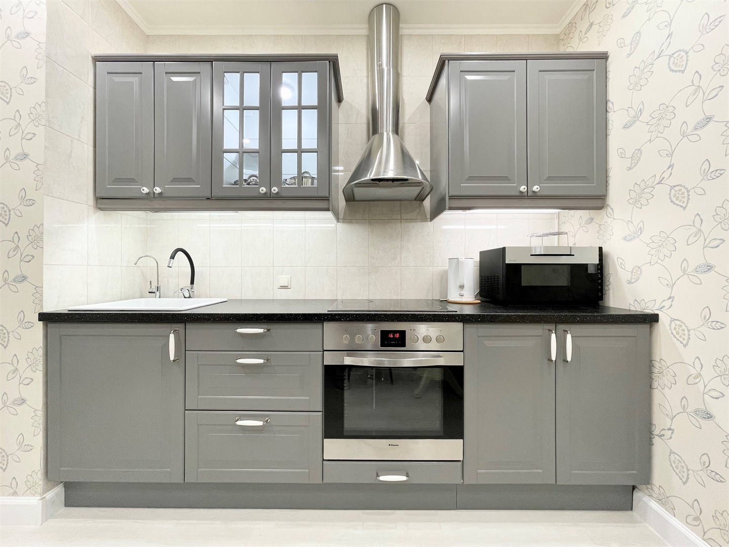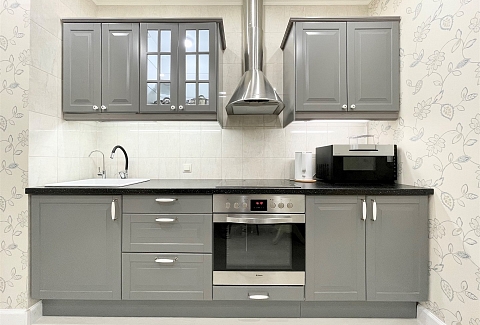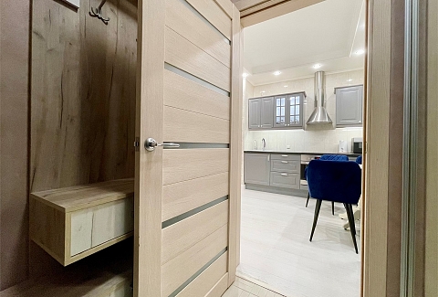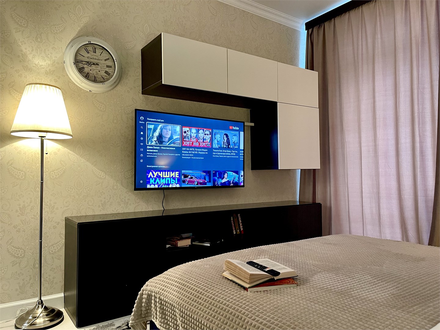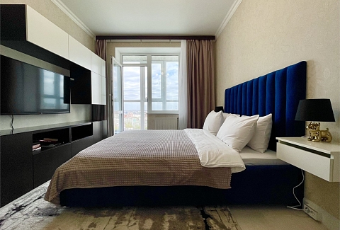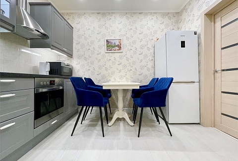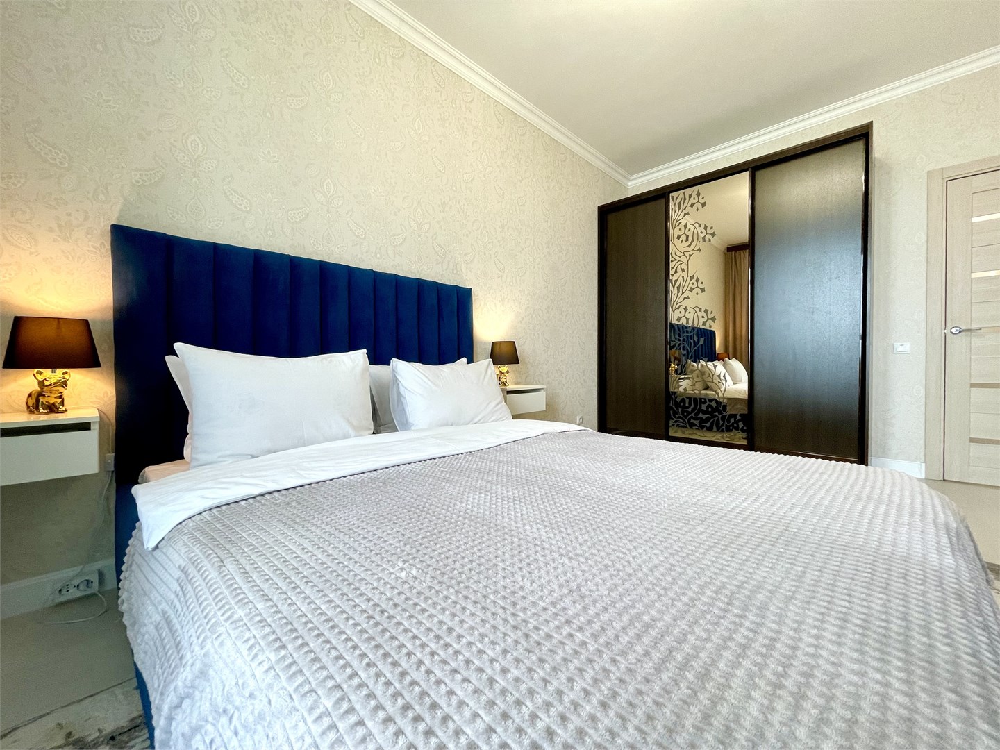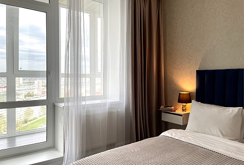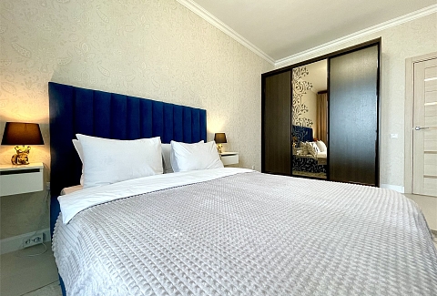 В номере: вешалка, зеркало, кровать двуспальная, прикроватные тумбочки, стол, стулья, шкаф, гладильная доска, духовой шкаф, микроволновая печь, набор посуды, плита электрическая, стиральная машина, сушилка для белья, телевизор, утюг, холодильник, чайный набор посуды, электрочайник