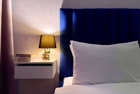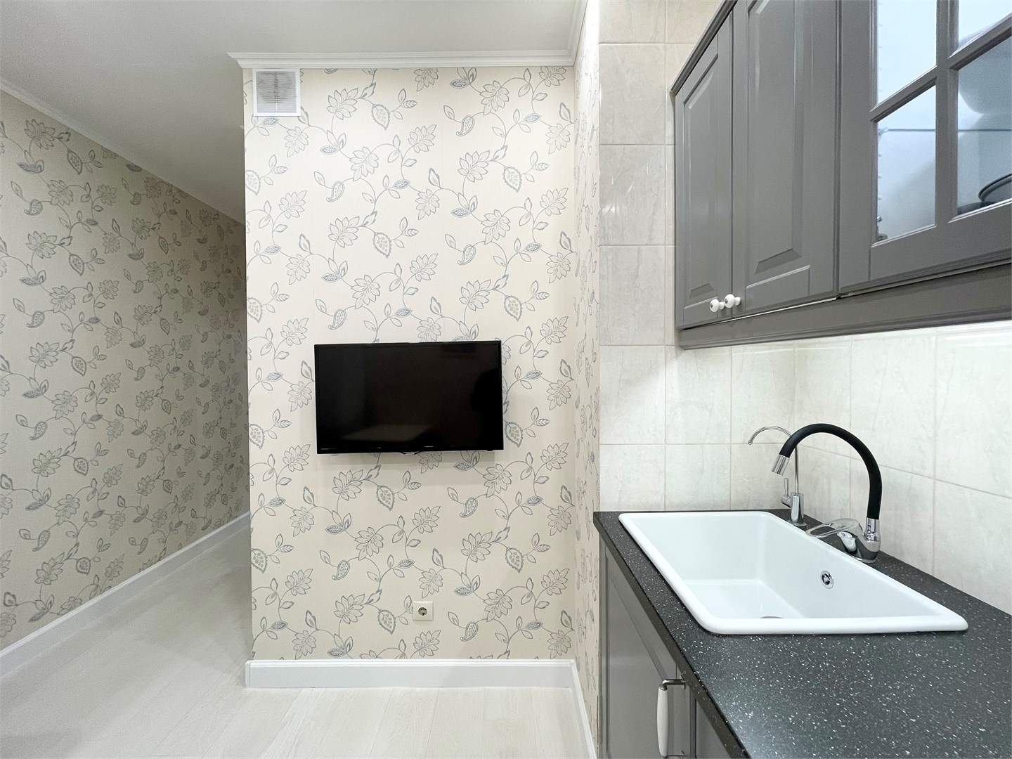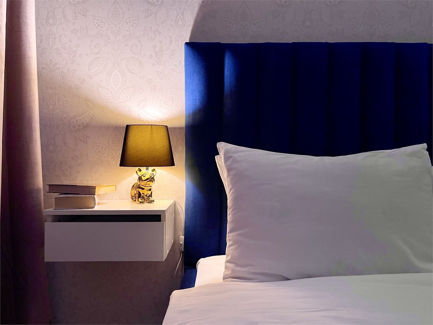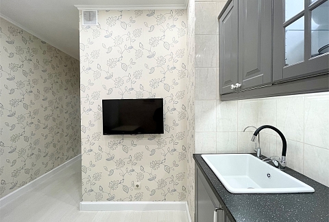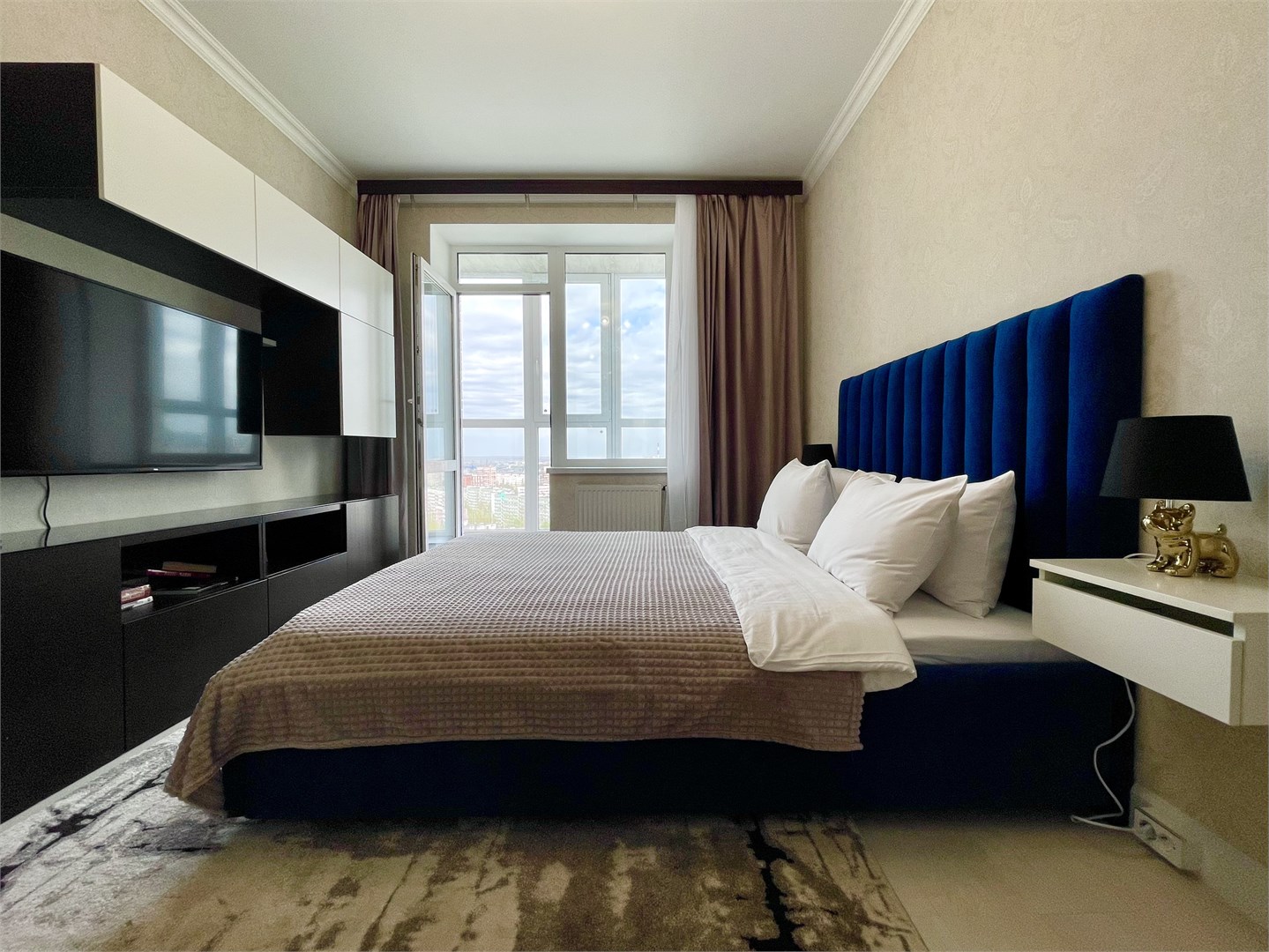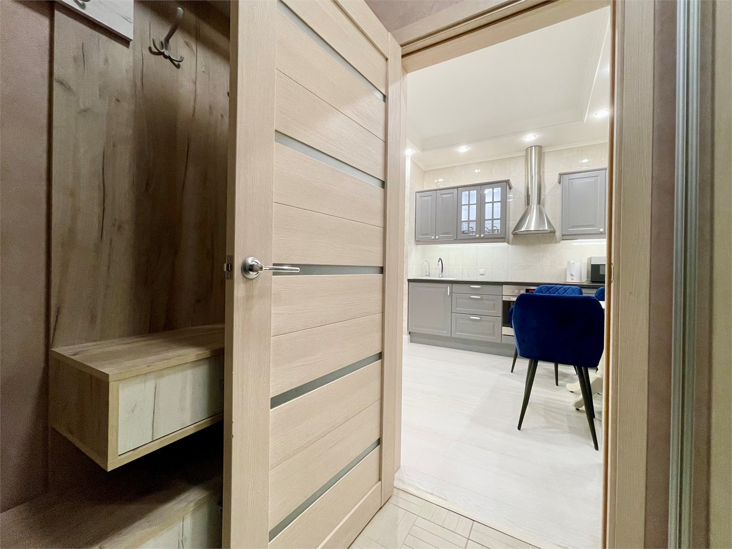 В номере: вешалка, зеркало, кровать двуспальная, прикроватные тумбочки, стол, стулья, шкаф, гладильная доска, духовой шкаф, микроволновая печь, набор посуды, плита электрическая, стиральная машина, сушилка для белья, телевизор, утюг, холодильник, чайный набор посуды, электрочайник