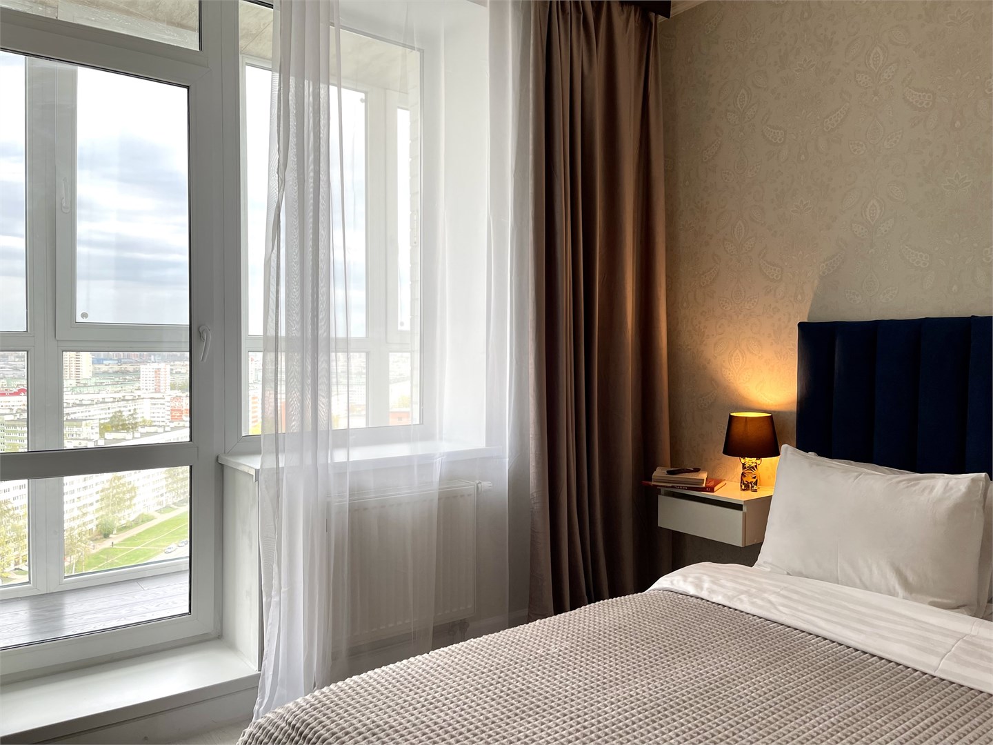 Поездом до ж/д вокзала Московский (г. Санкт-Петербург), далее 580 м до станции метро «Маяковская», далее на метро до станции «Озерки», далее на автобусе №123 до остановки «Улица Композиторов/ Проспект Просвещения», далее 490 м до апартаментов.