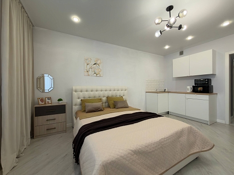 В номере: вешалка, зеркало, кровать двуспальная, прикроватные столики, стол, стулья, шкаф, гладильная доска, кондиционер, кофемашина, микроволновая печь, мини-холодильник, набор посуды, плита, сейф, телевизор, утюг, чайная станция, электрочайник