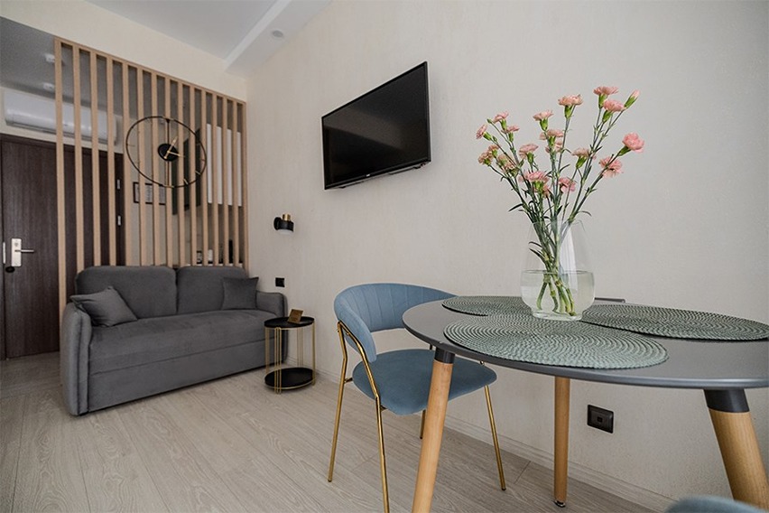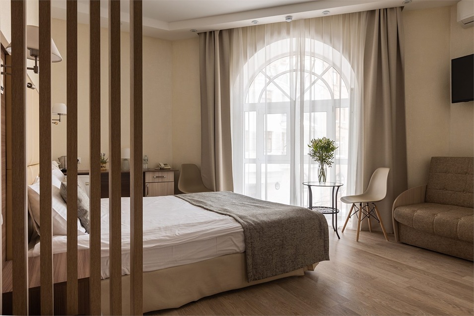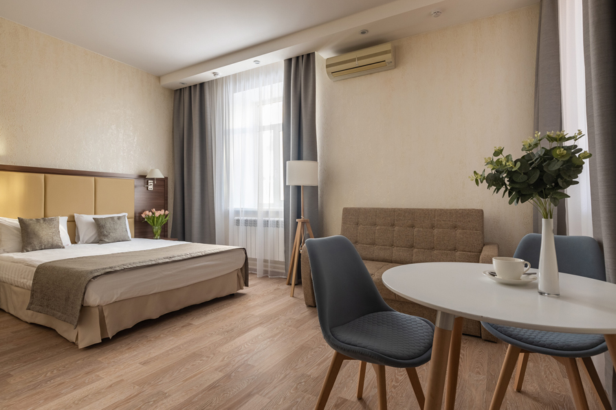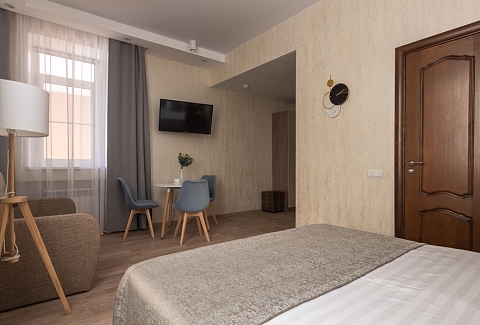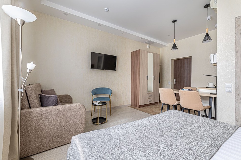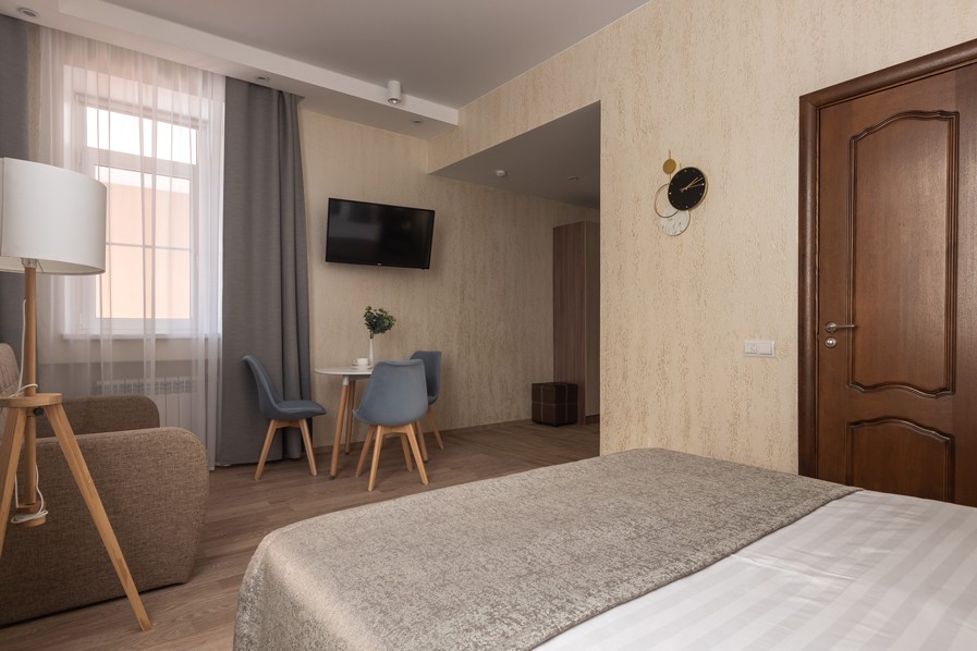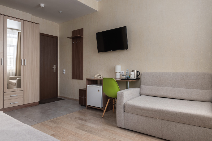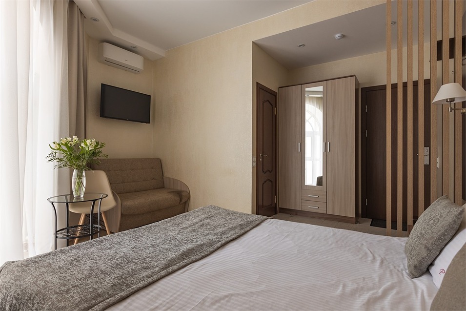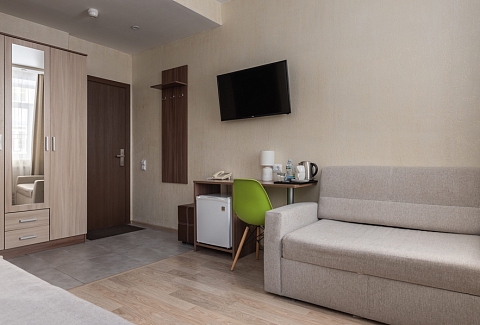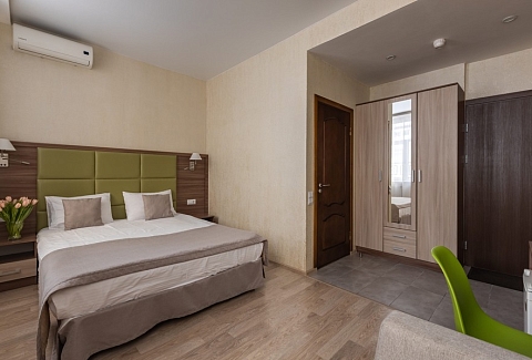 В номере: вешалка, диван раскладной, зеркало, кровать двуспальная, прикроватные тумбочки, стол, стулья, шкаф, кондиционер, мини-холодильник, сейф, телевизор, телефон, чайная станция, чайный набор посуды